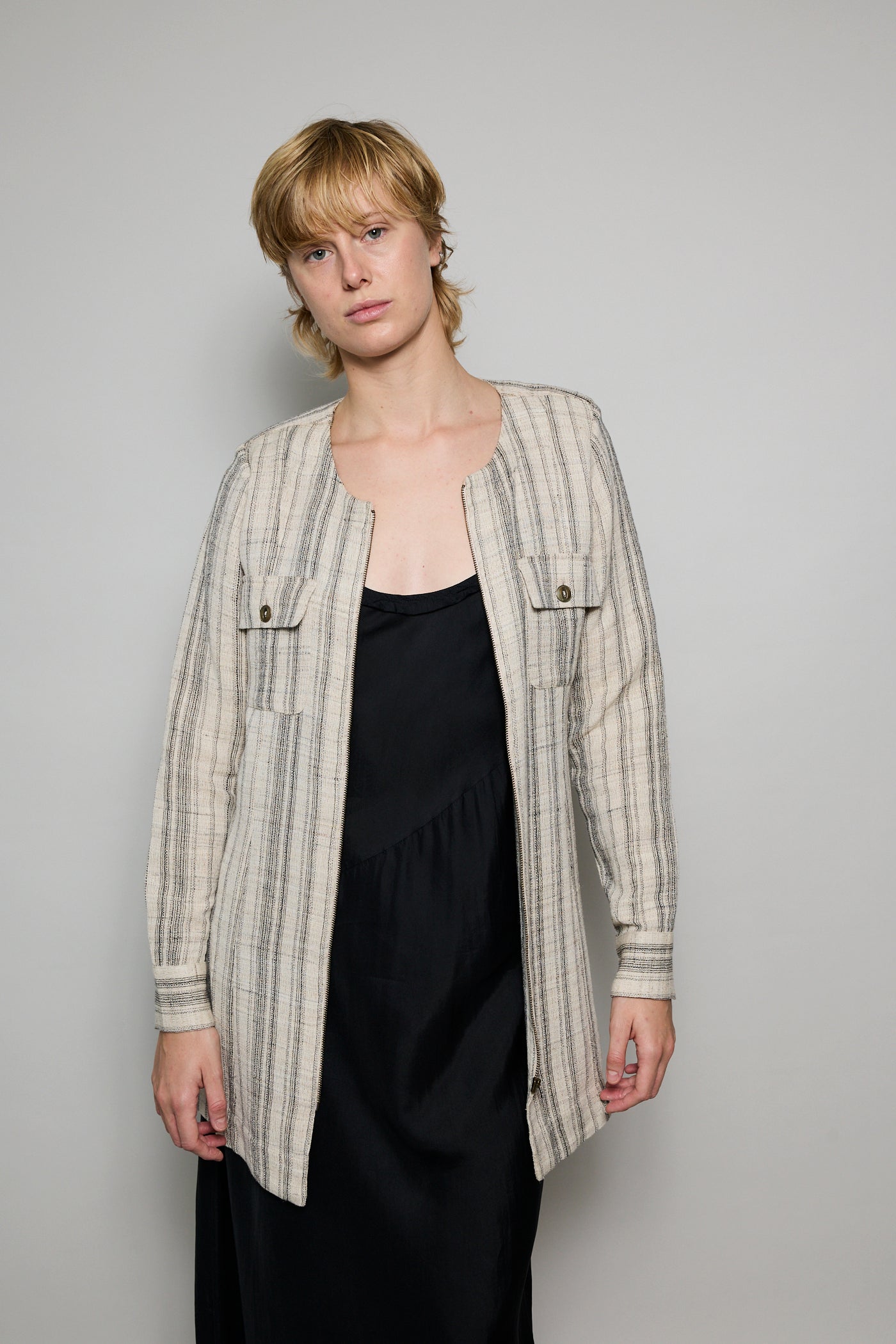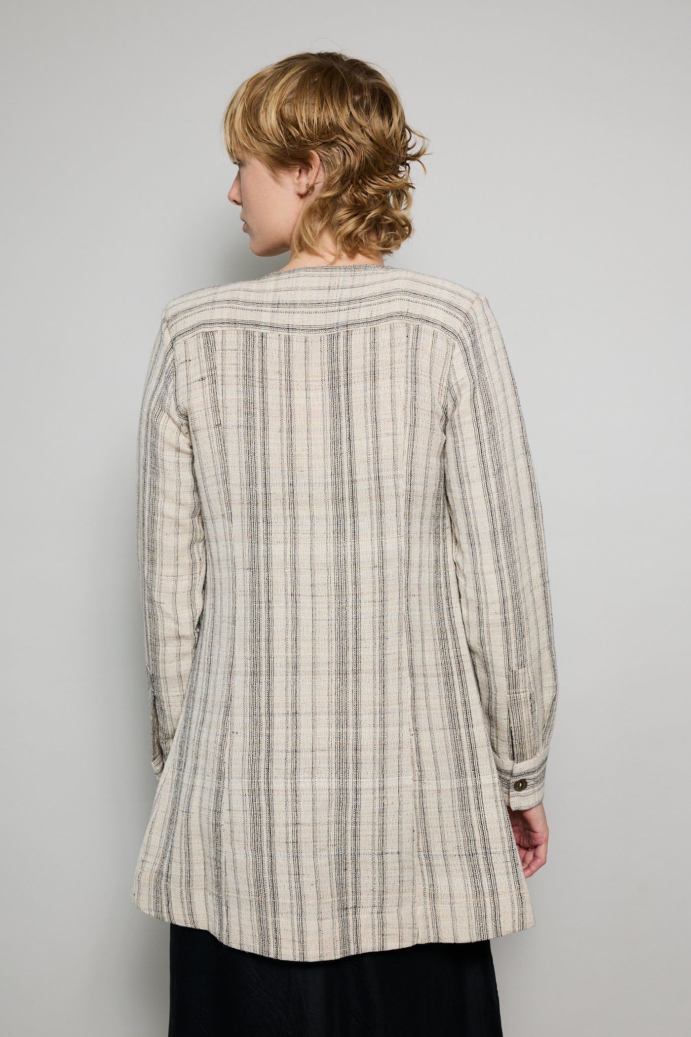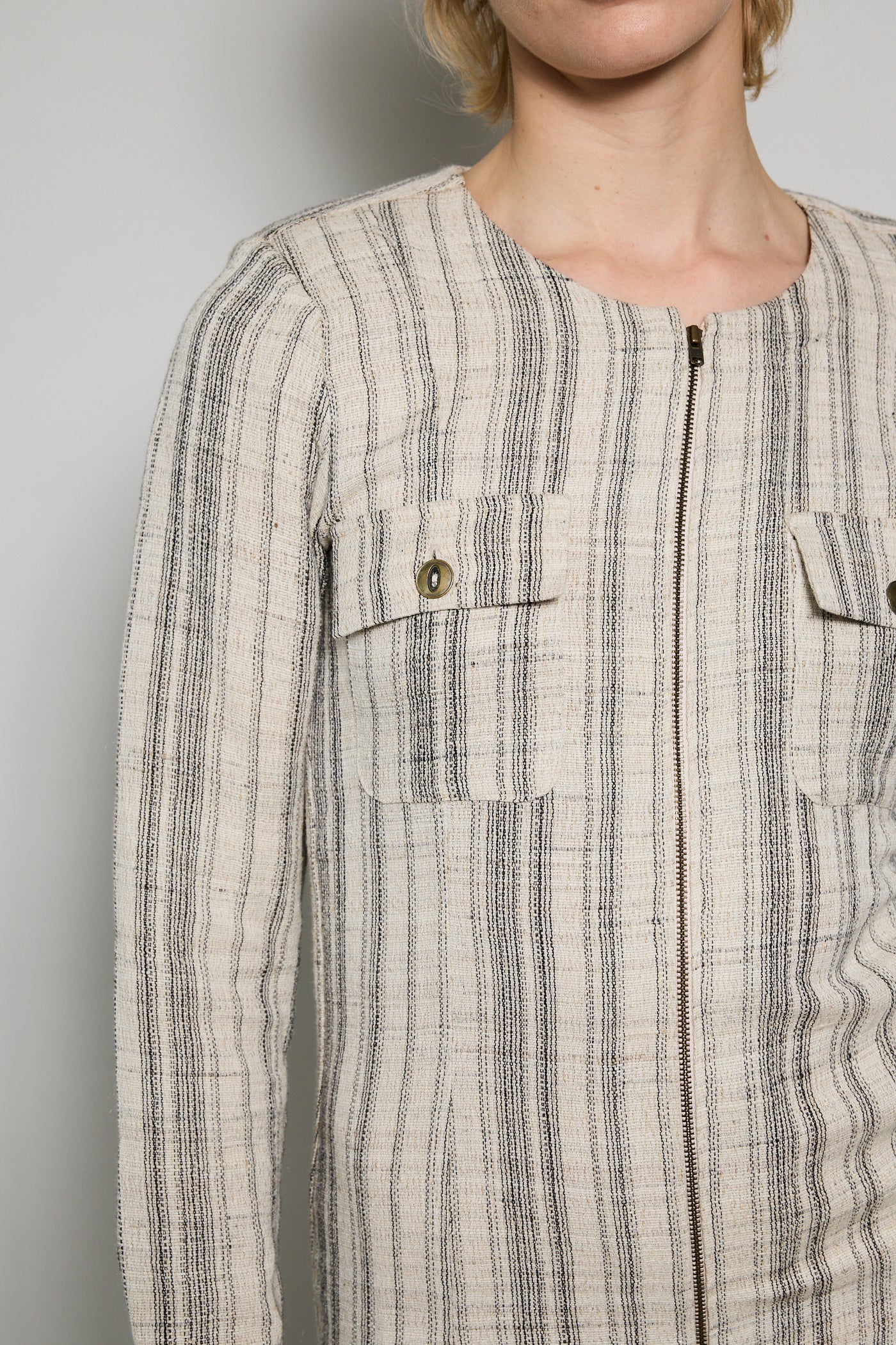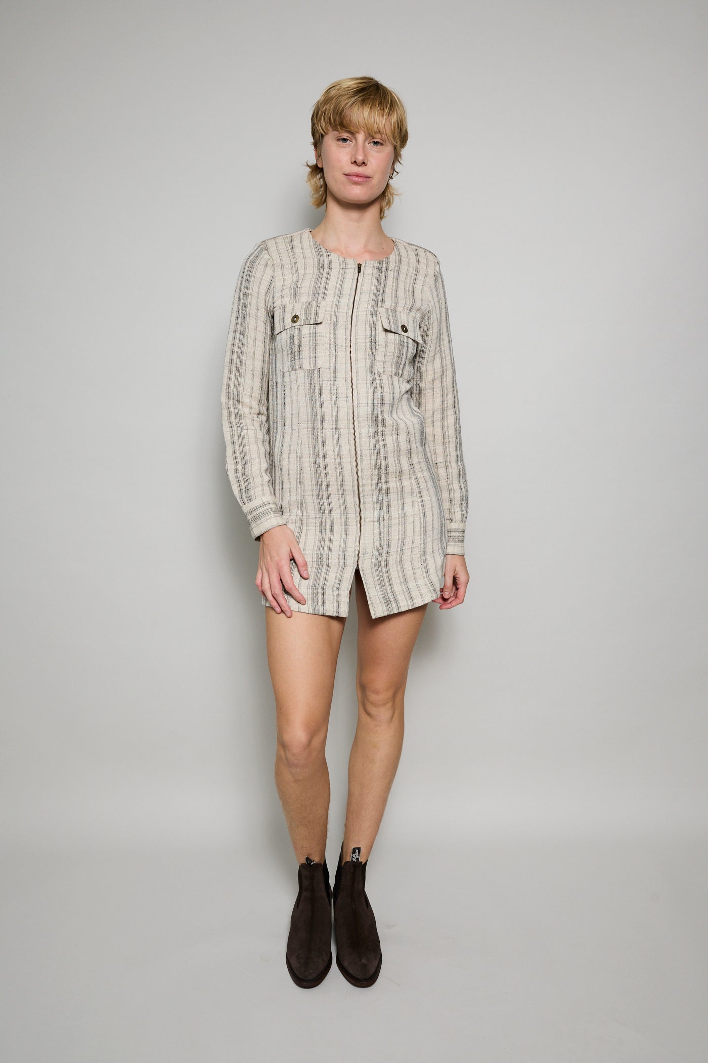 A mini coat dress made from intricate hand-woven cotton & silk. The silk is undyed to reflect the beige natural color variations. Features a round neck with front zip fastening. Vertical contrast black stripe with horizontal striped cuffs. Double front flap pocket detail. Gold hardware. A textured finish.