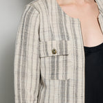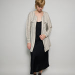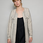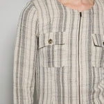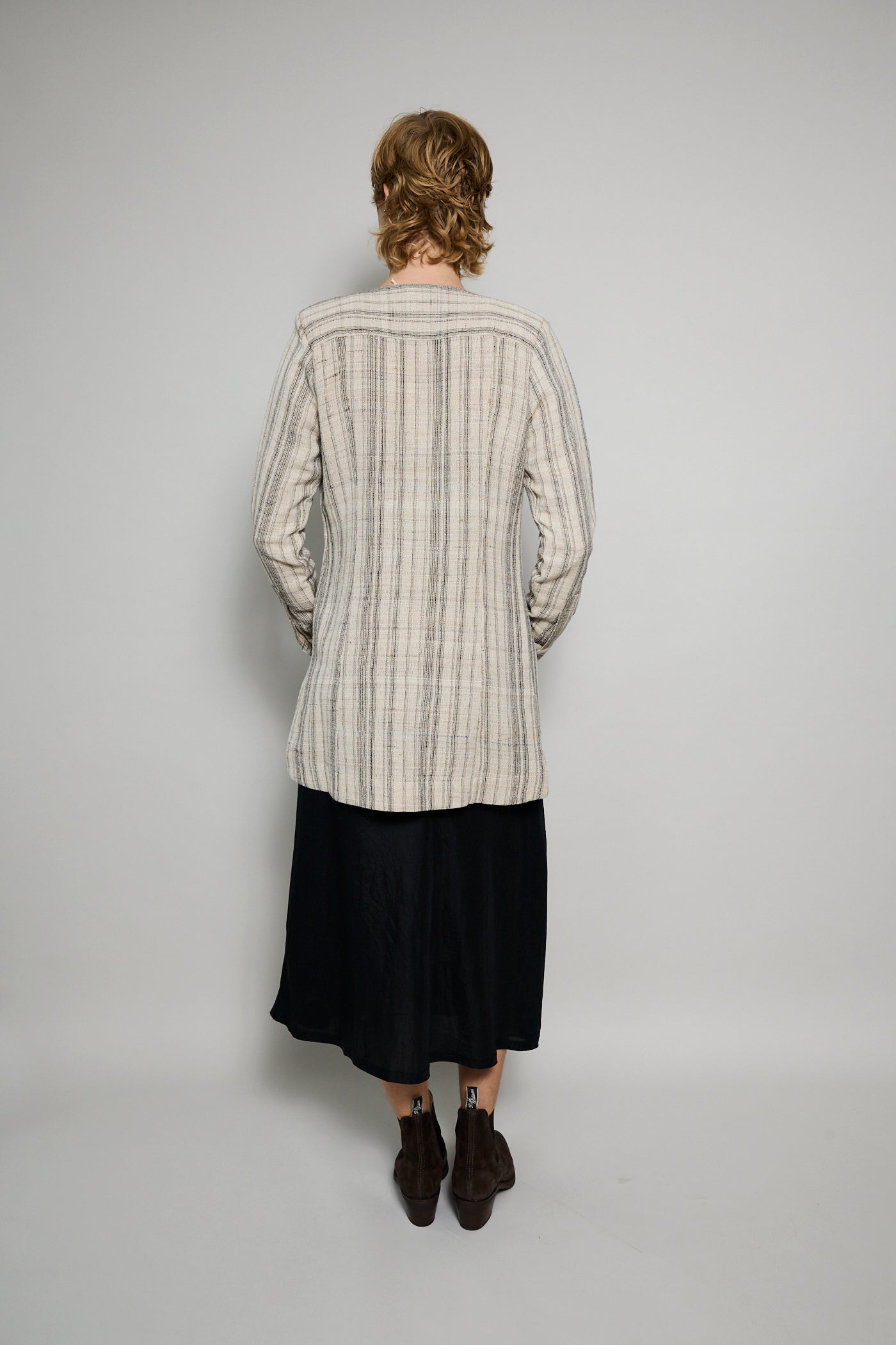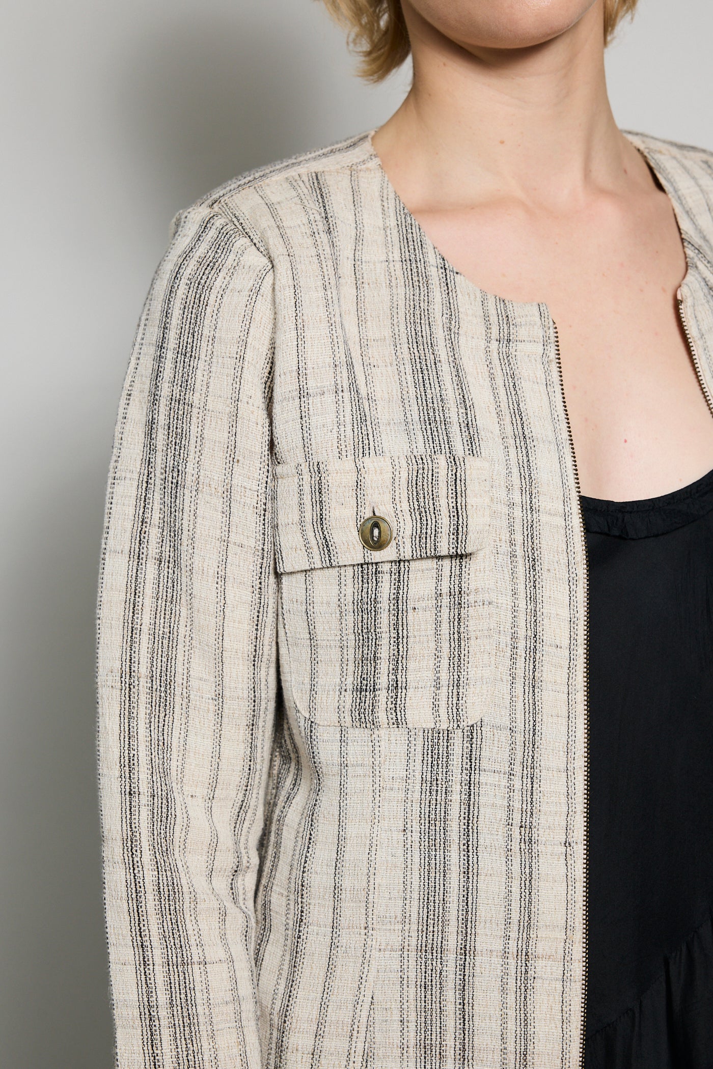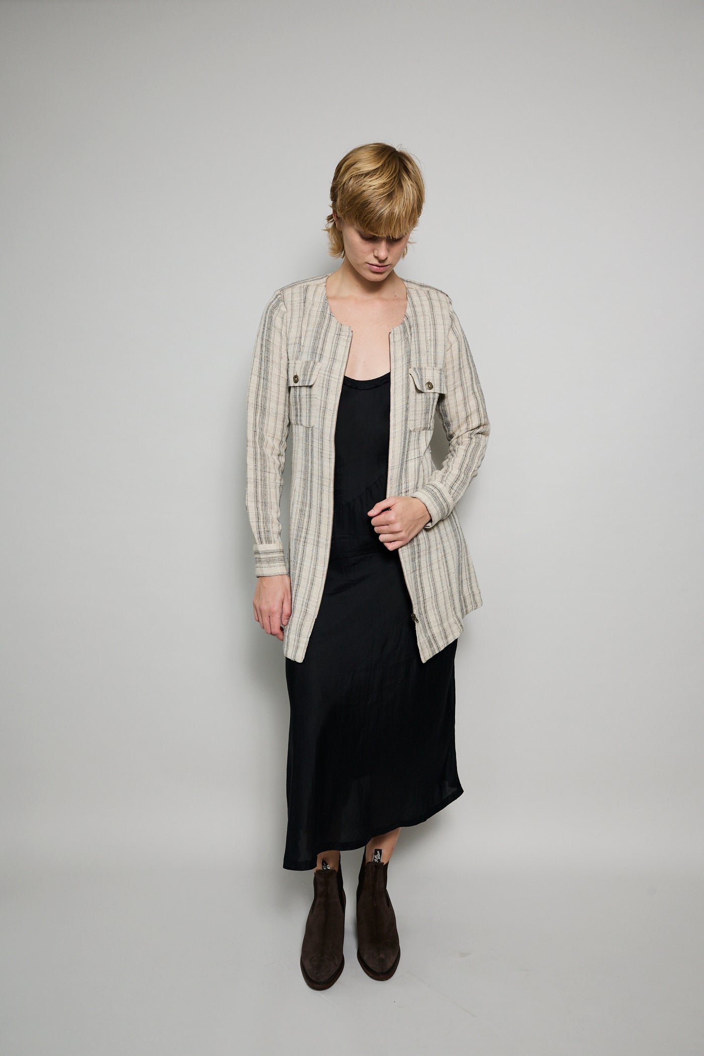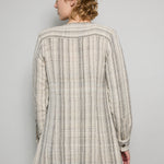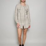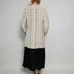 A mini coat dress made from intricate hand-woven cotton & silk. The silk is undyed to reflect the beige natural color variations. Features a round neck with front zip fastening. Vertical contrast black stripe with horizontal striped cuffs. Double front flap pocket detail. Gold hardware. A textured finish.