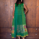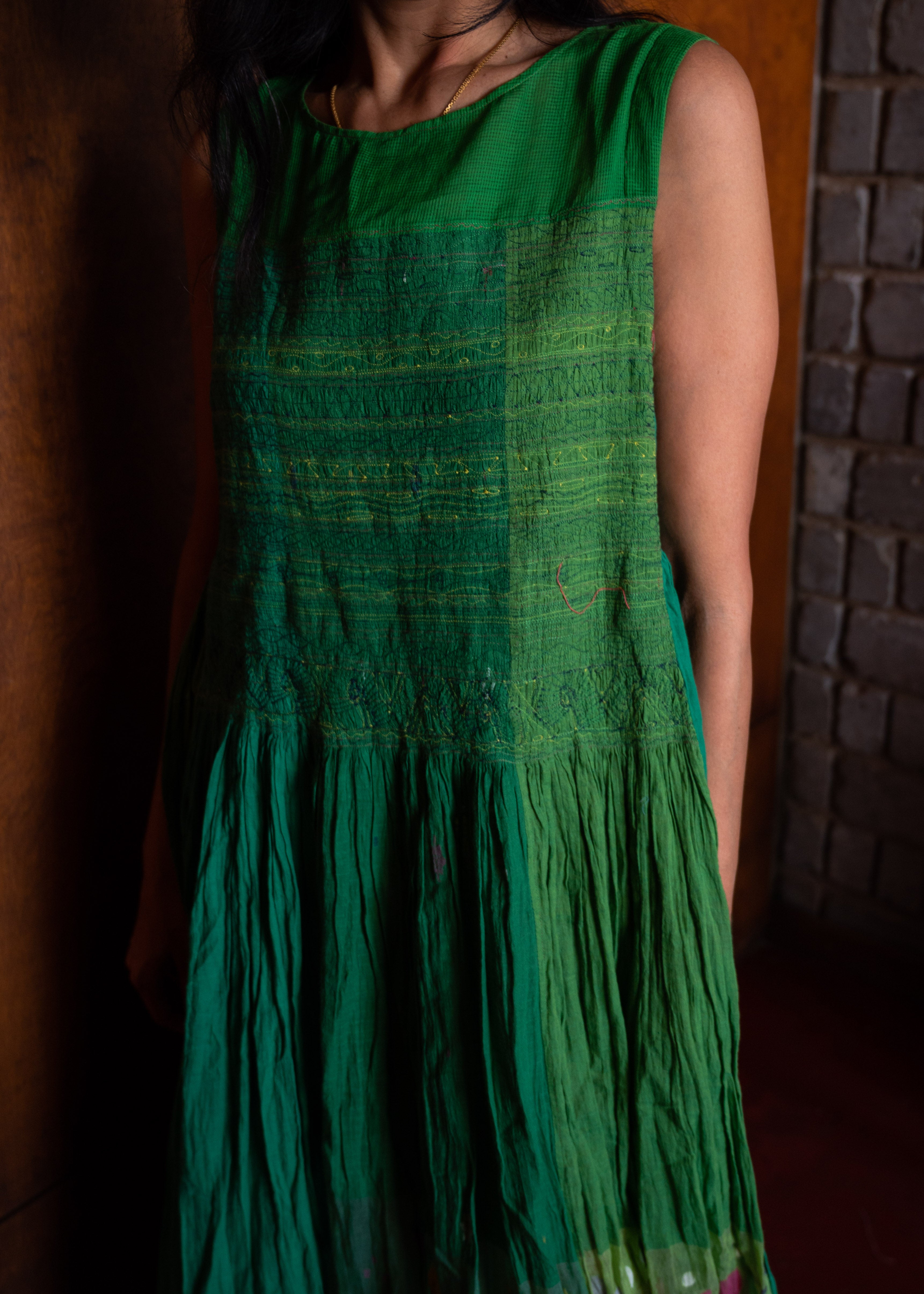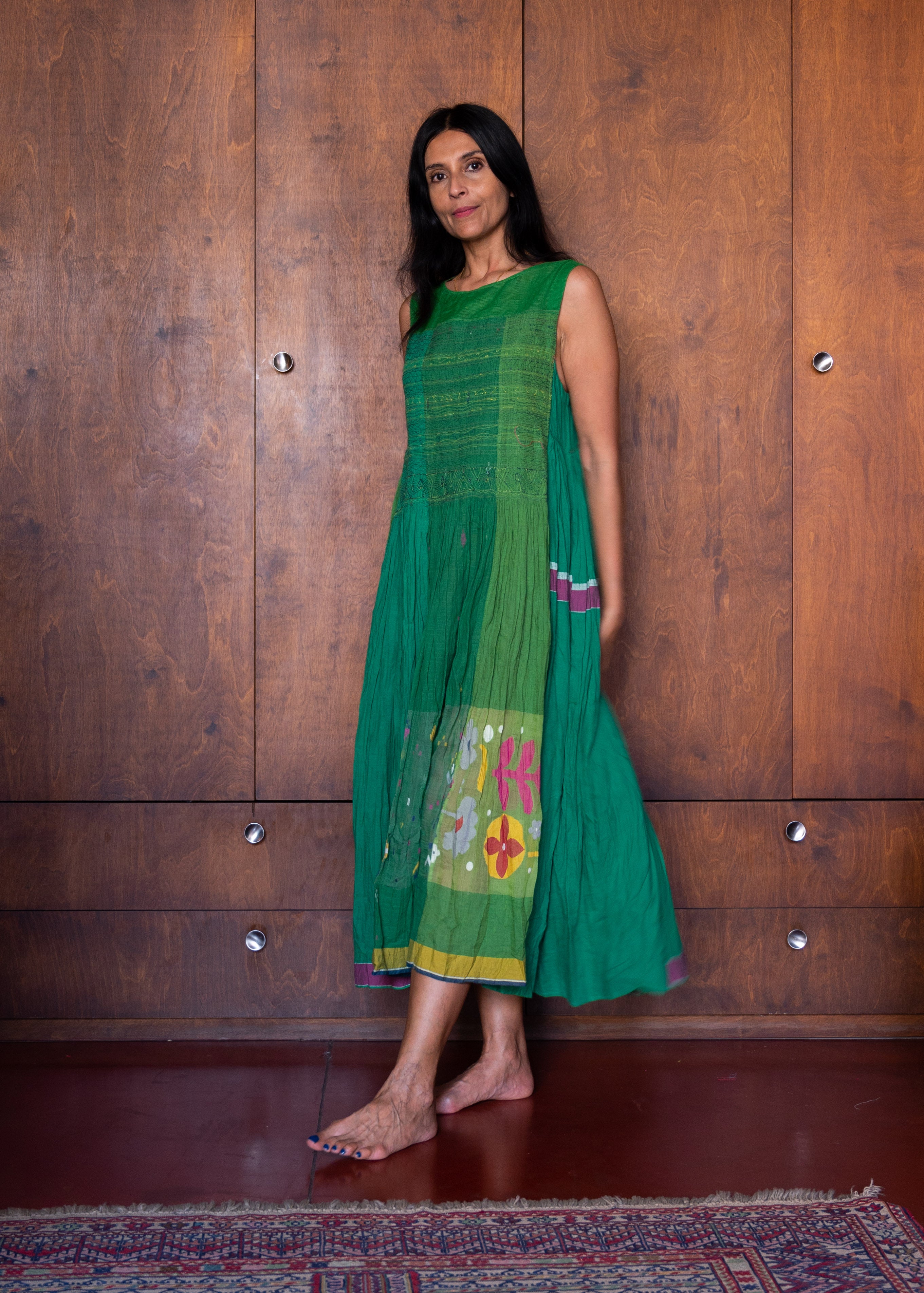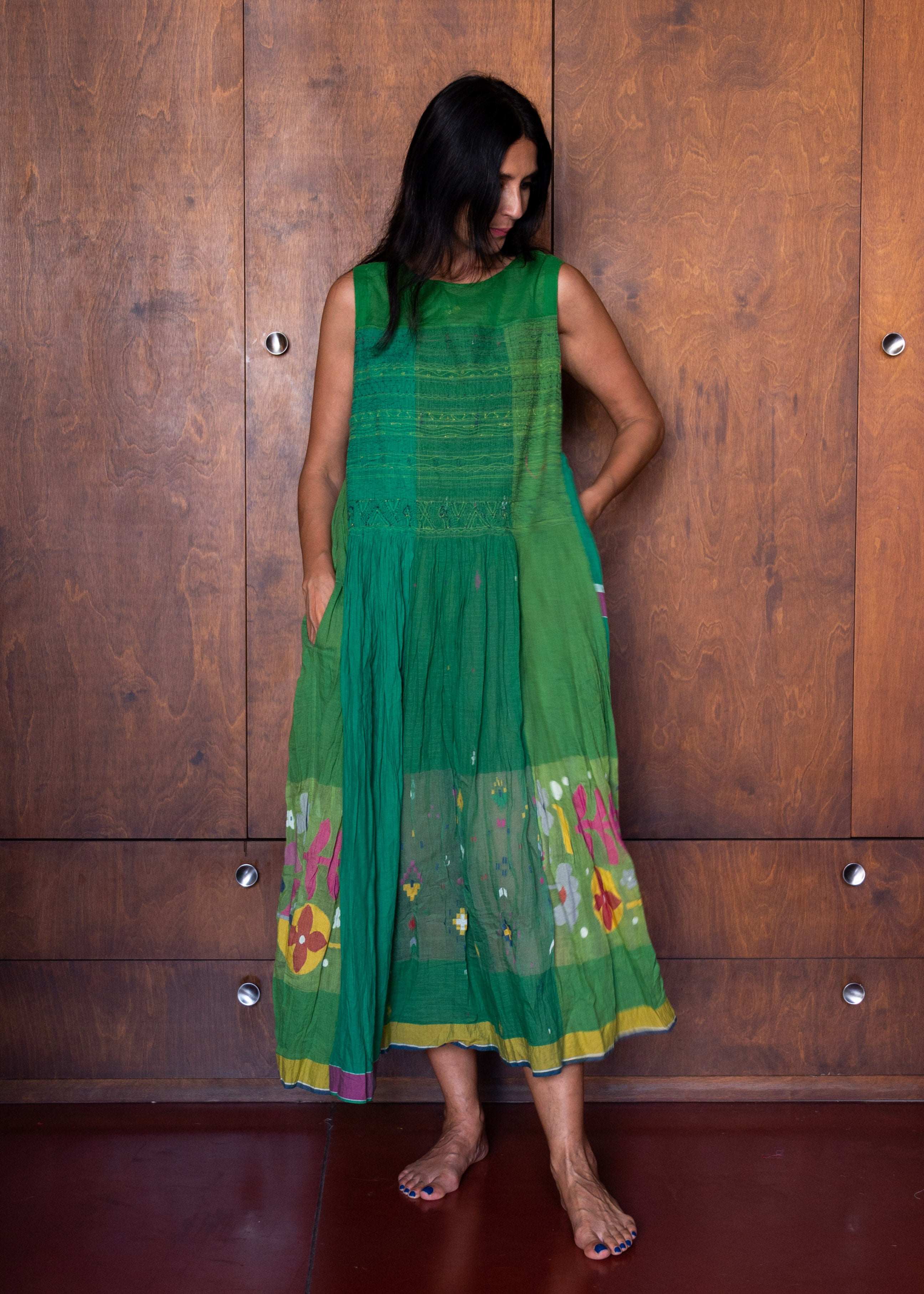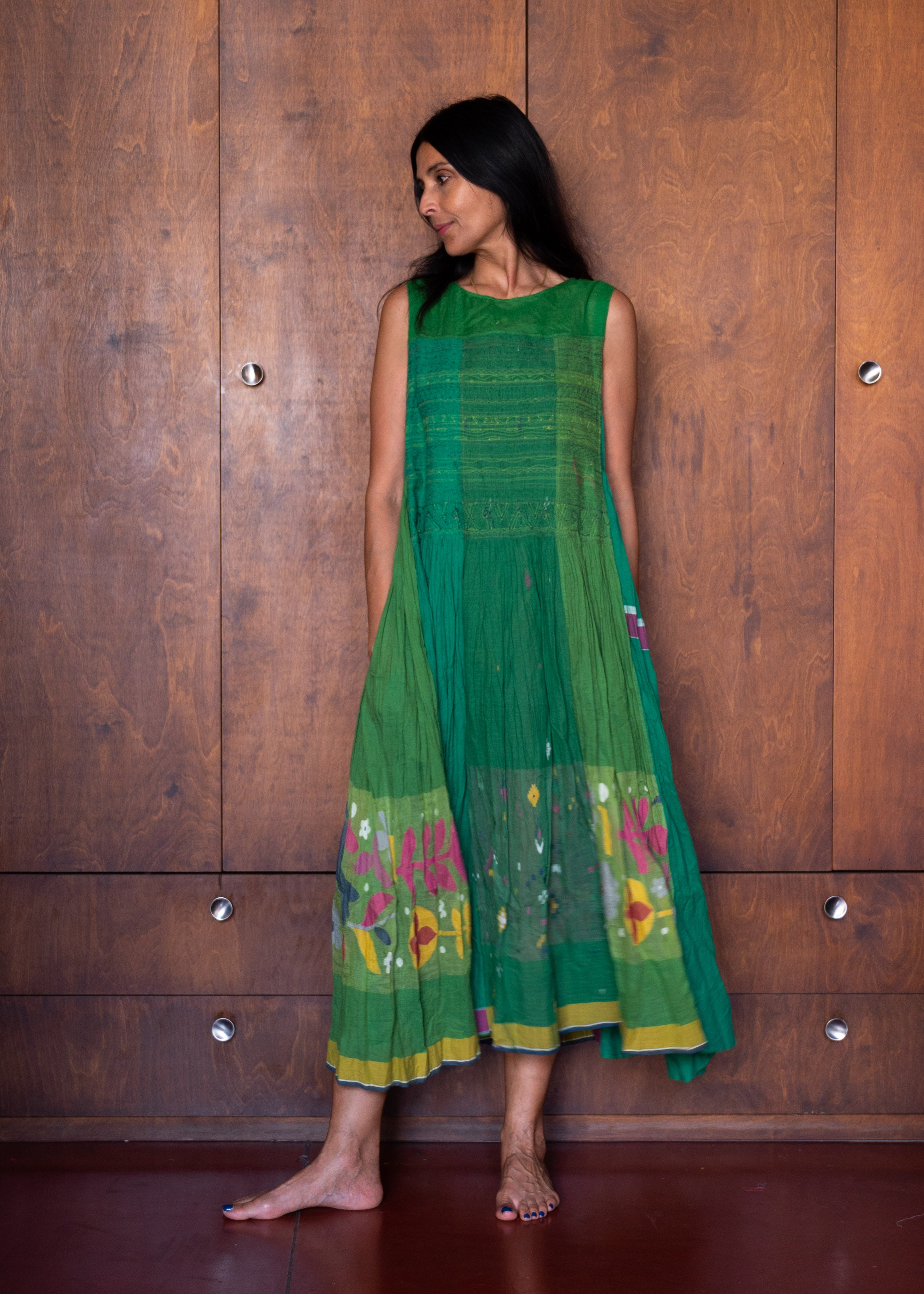 A sleeveless dress handwoven in 100% cotton. High round neck with intricate  embroidery patterned detail all along the front and back yoke. Pleats below the waistline. Dress is exquisitely pieced together with multiple panels of geometric and multicolor floral jamdani. Side pockets. Singe metallic side button closure.