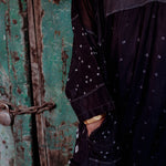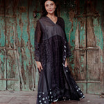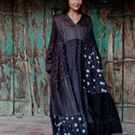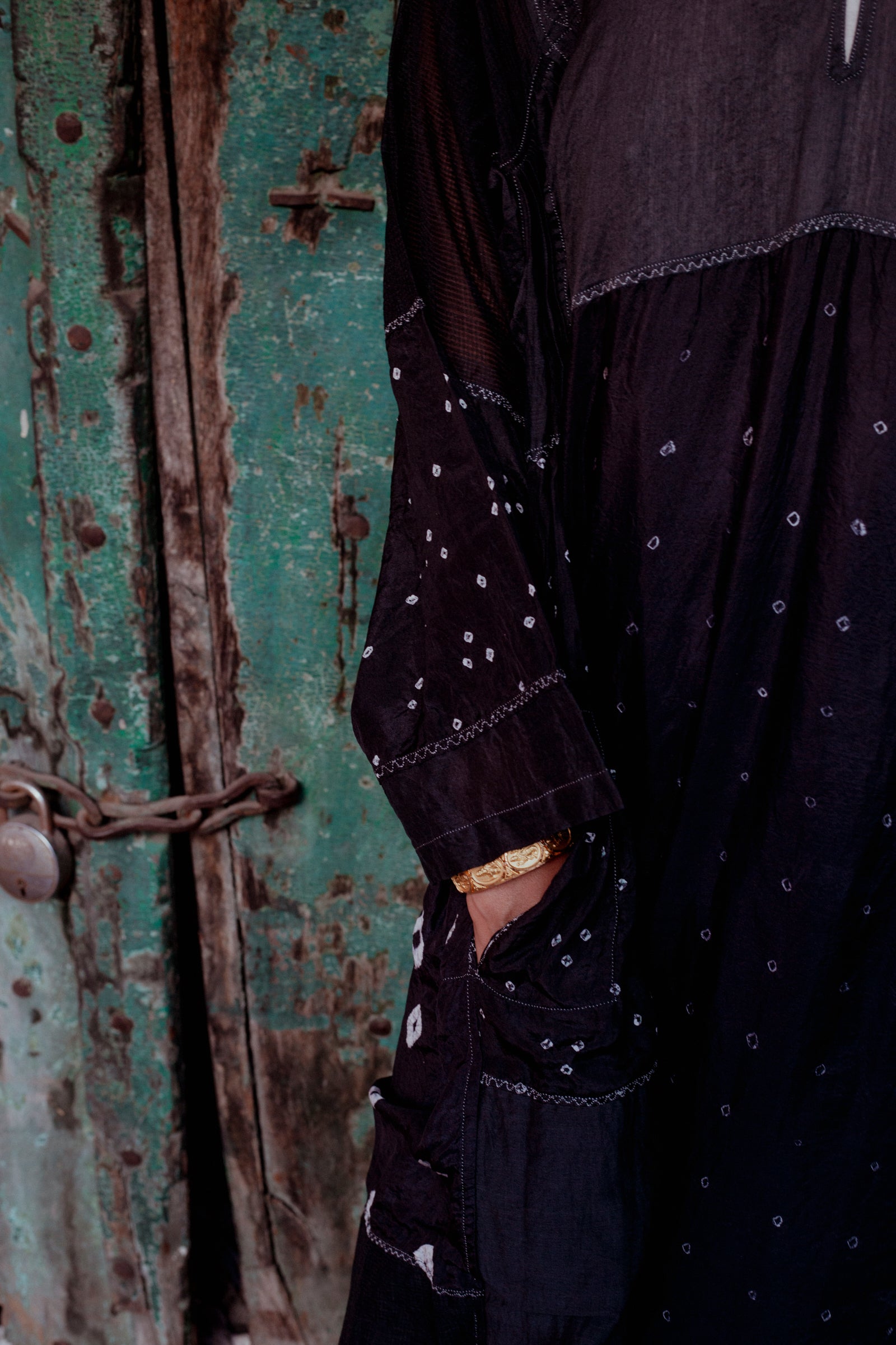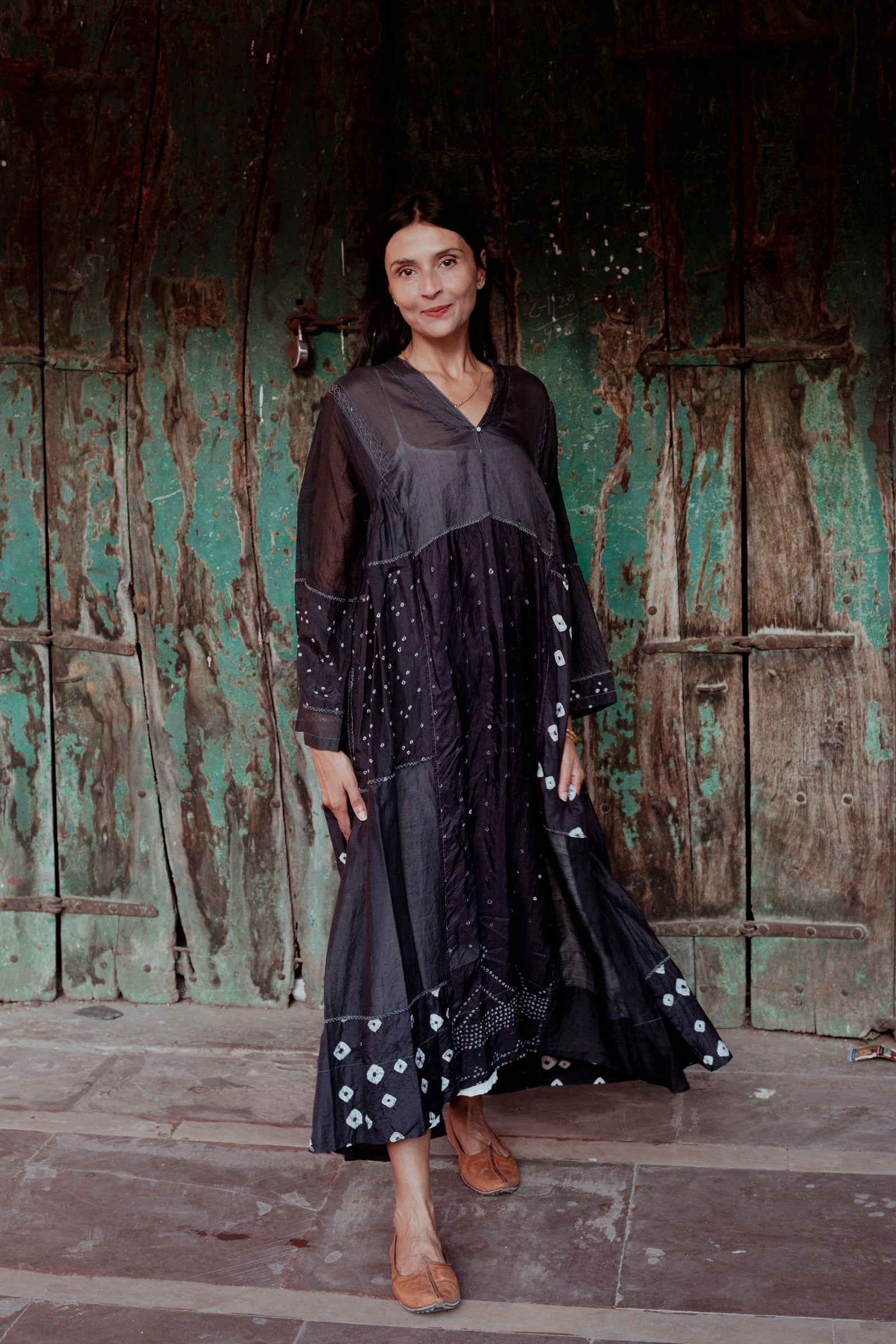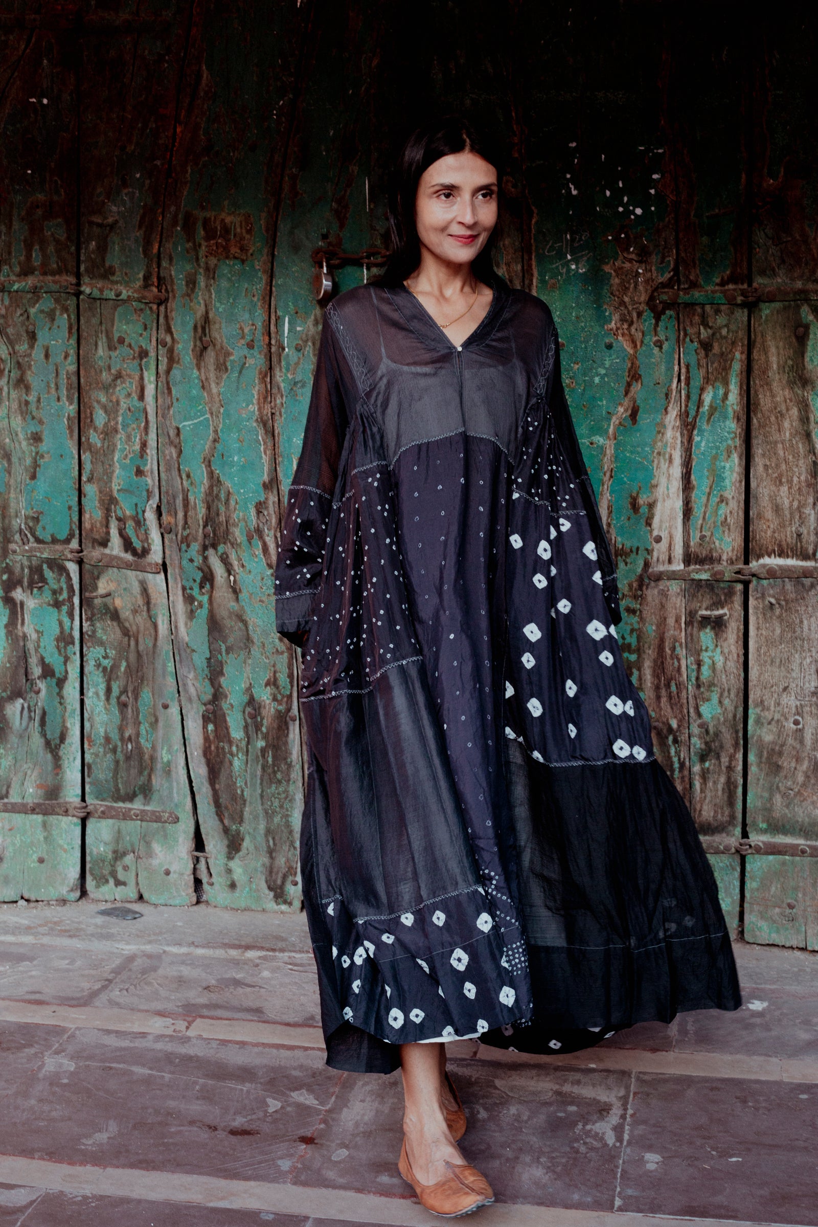 A delicate handwoven kaftan in 50% cotton and 50% silk. Features a front deep V neck  with a single metal button closure. Contrast white embroidery detail along neckline, shoulders and bodice. Pleated bandhini tie&dye panels in varying sizes and patterns intricately pieced together. Side slit pockets. A sheer and light finish.