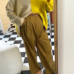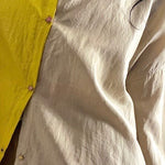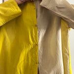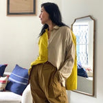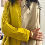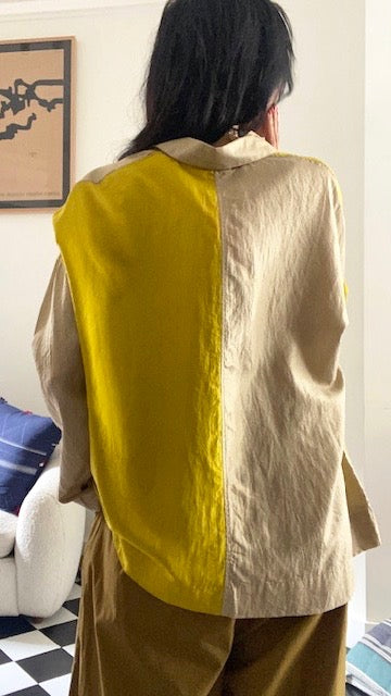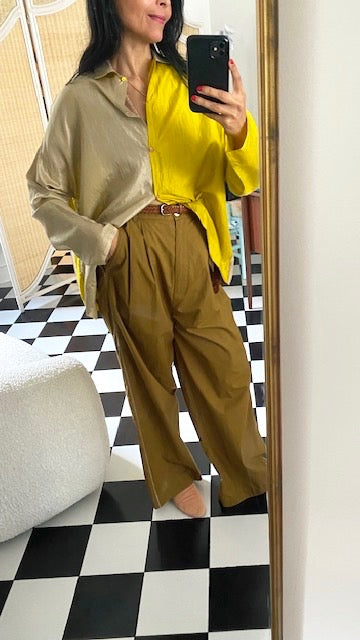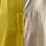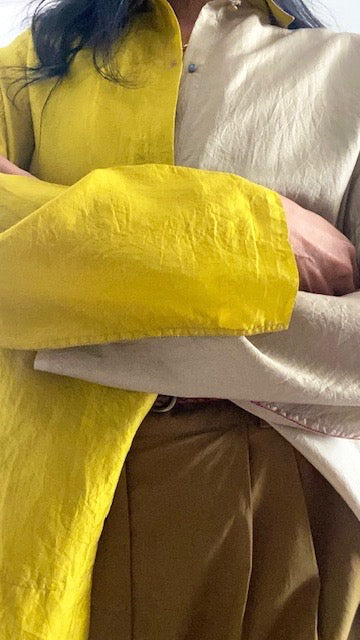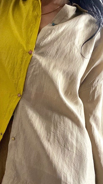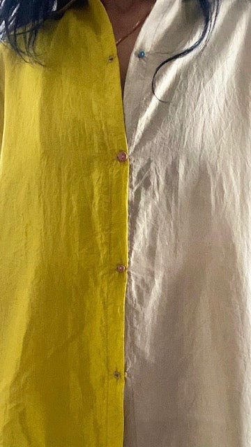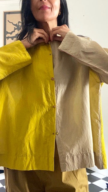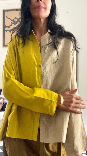 A handwoven silk shirt in double color gold and brown. Front collar with metallic button closure and pink stitch interlock embroidery detail. A loose fit.