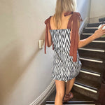 A straight cut mini slip dress style. Features handwoven monochrome ikat design throughout with adjustable grosgrain ribbon ties. Can be worn and tied high or low. Side slit detail. Maxi length.