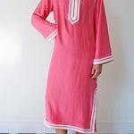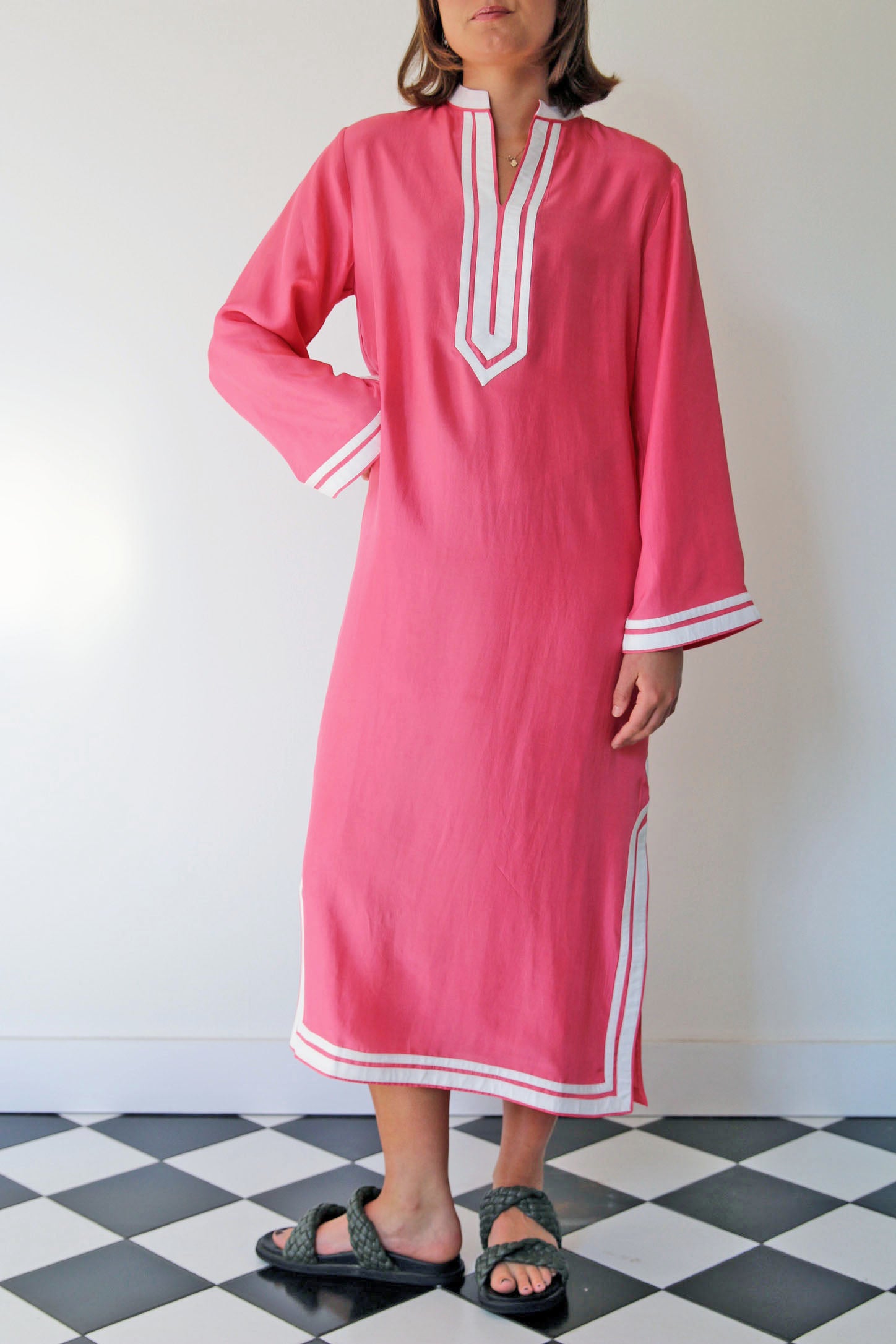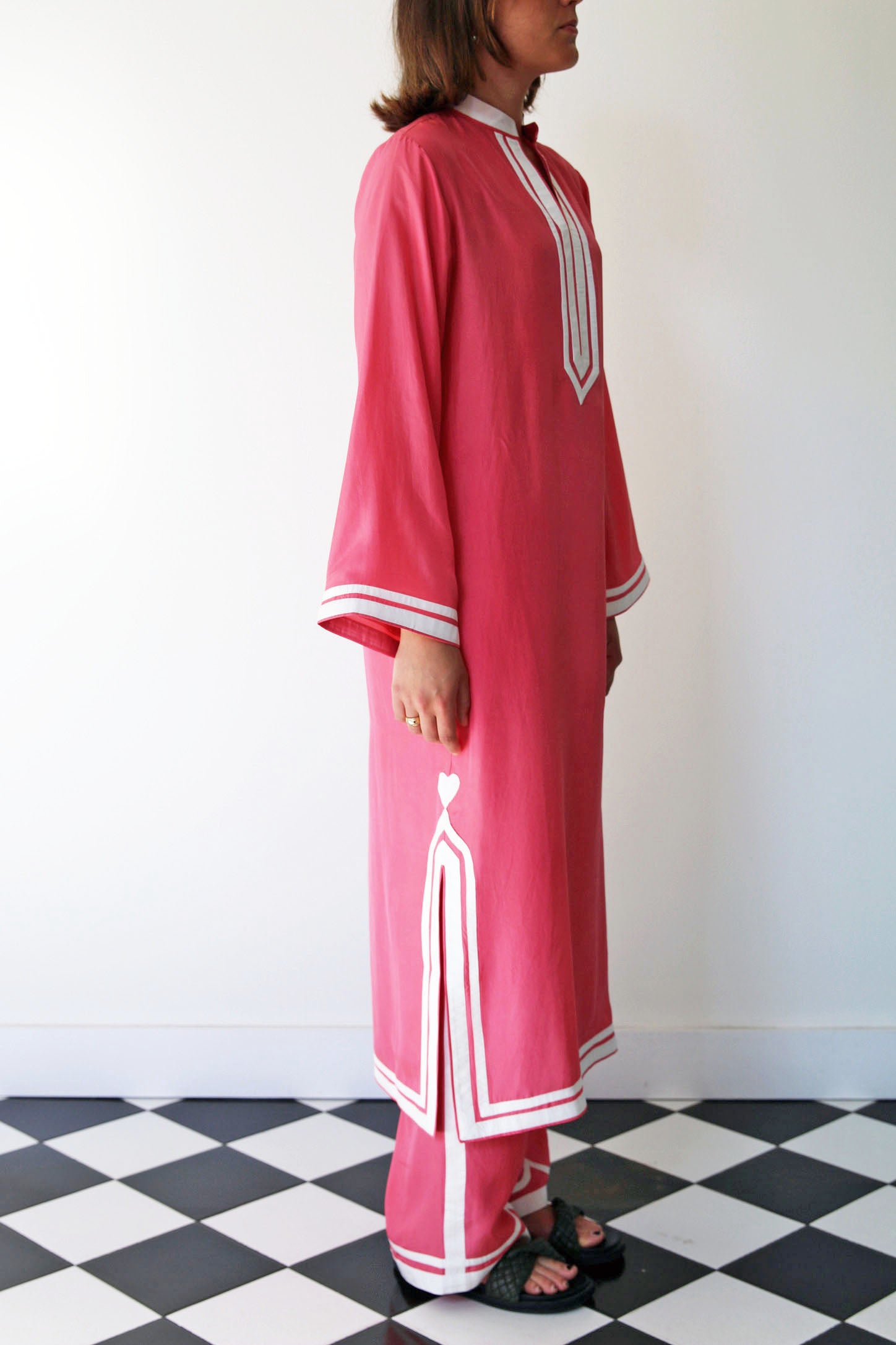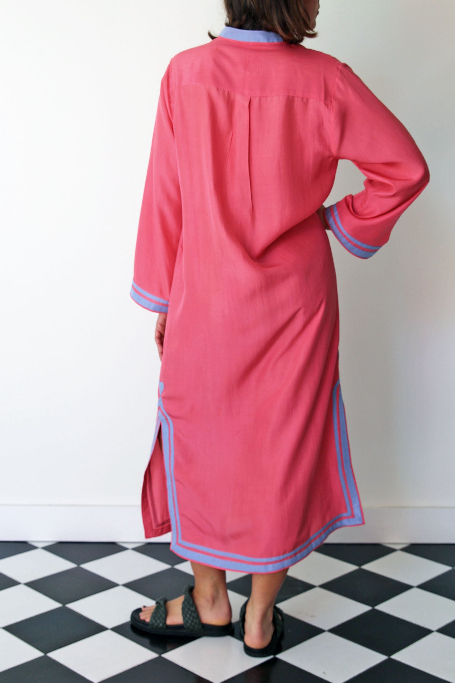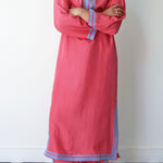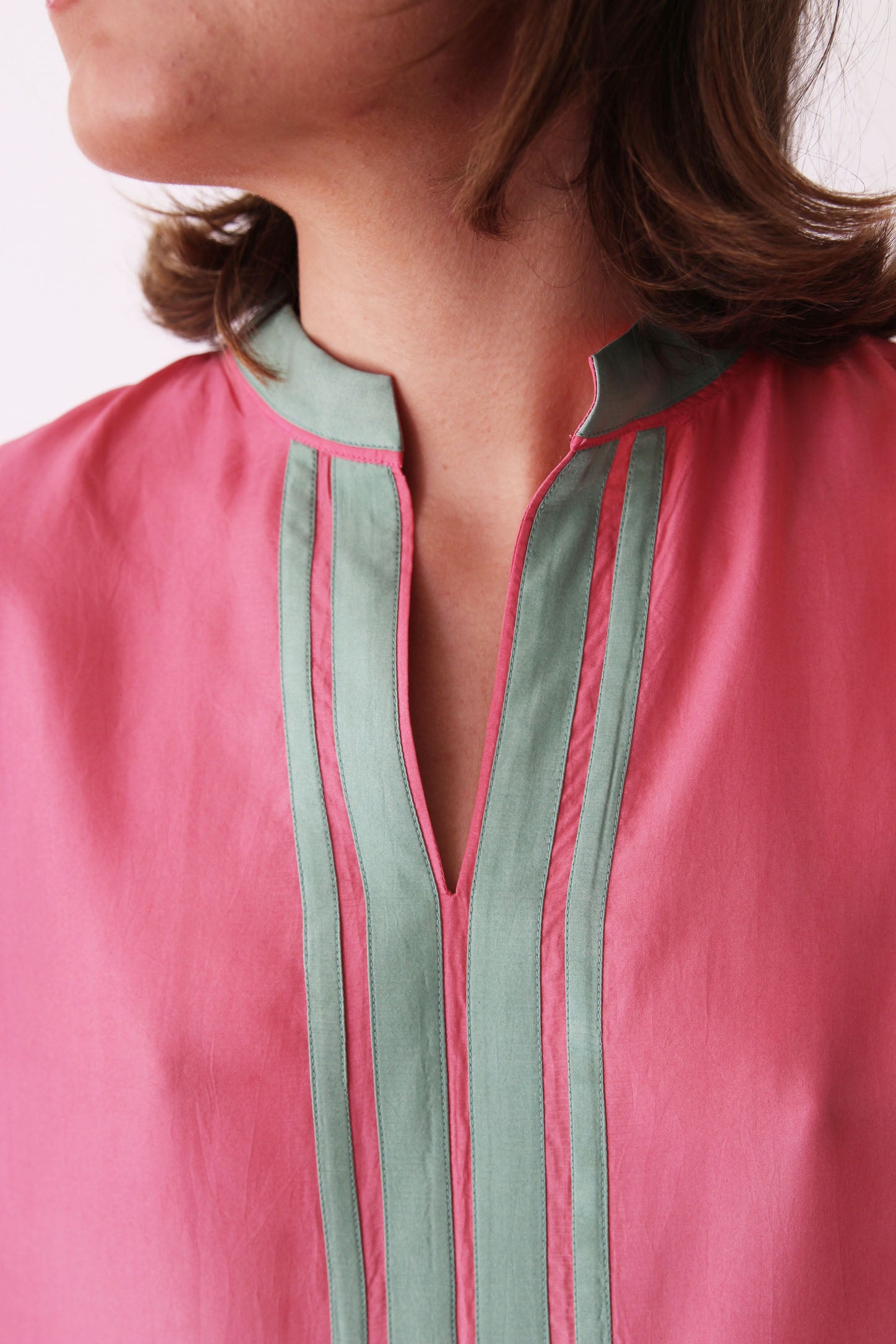 A maxi tunic in 100% silk. Features a straight silhouette with high neck and long bell sleeves. Contrast silk trim detail along neck, sides and hem. White, blue or green trim options. Hand cut and stitched heart detail on sides. Side slits. Can be paired over pants or worn on it's own.