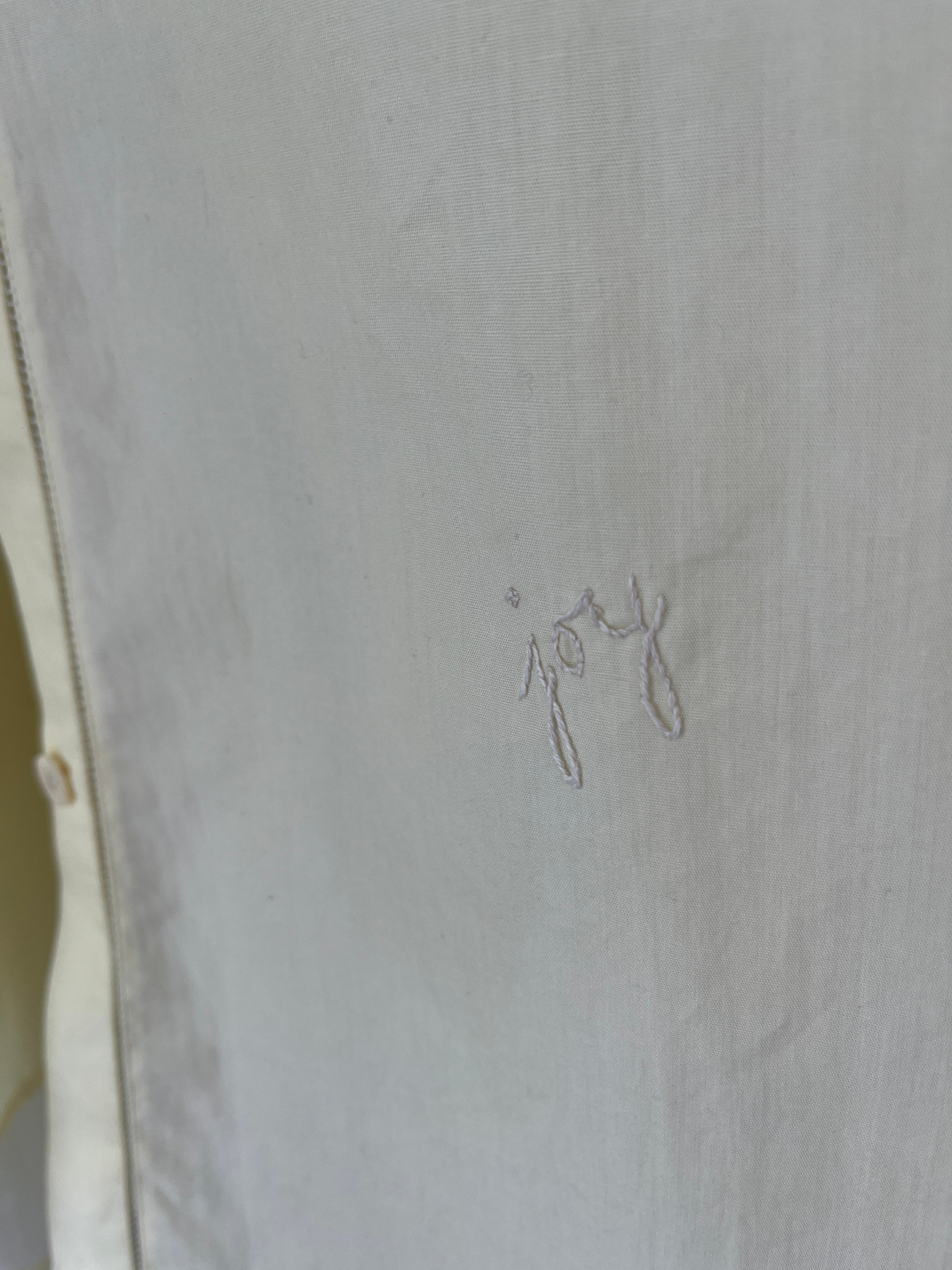 An oversized collared shirt made from 100% cotton poplin. Features a button down front with concealed placket, and with white interlock embroidery on either side. Hand-embroidered "joy" note on the front. Asymmetric in design, slightly longer back. Back box pleat. Unisex.