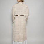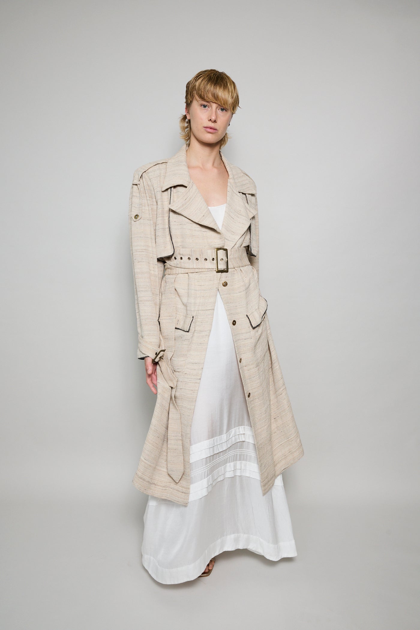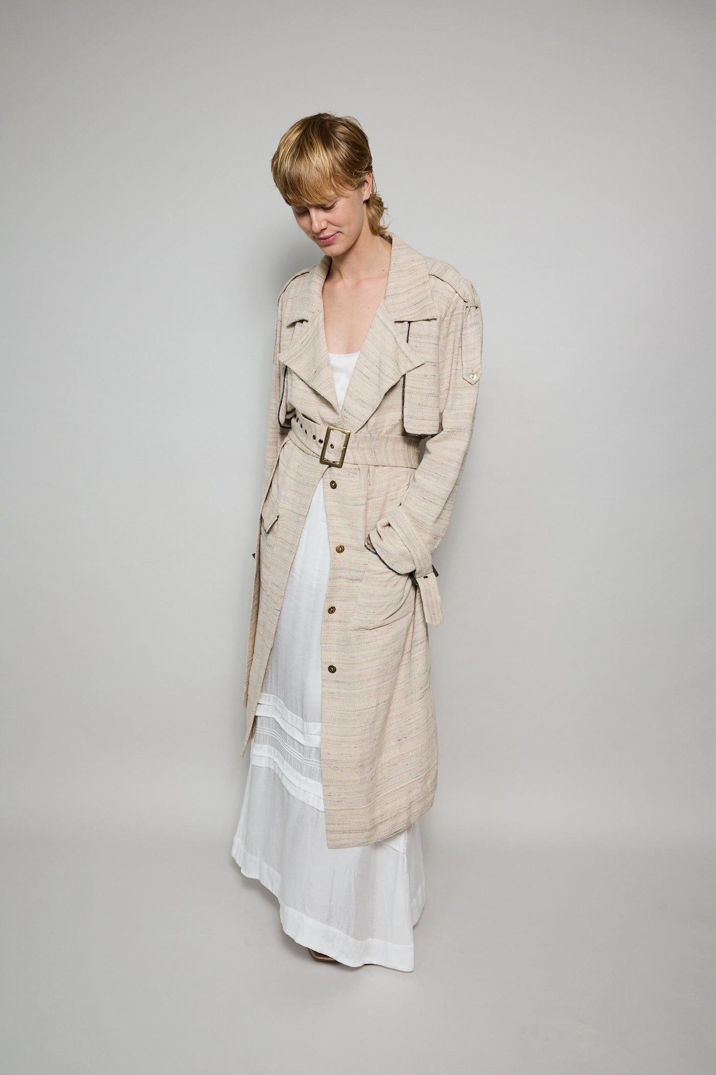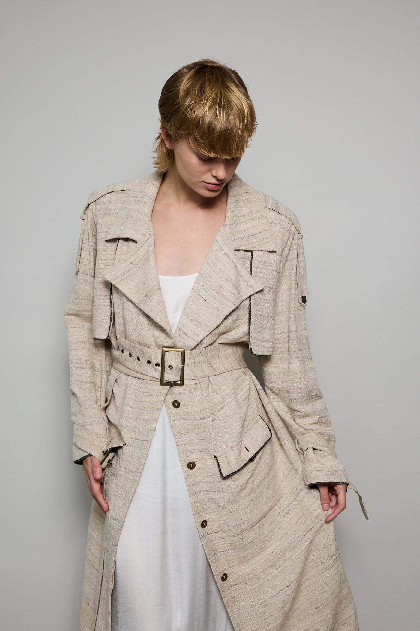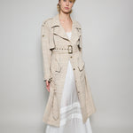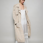 A classic trench coat made from intricate hand woven cotton & silk. The silk is undyed to reflect the beige natural color variations. Features shoulder epaulettes, back storm flap and centre vent. Sleeve loops with buckle fastening. The detachable belt allows you to wear open and oversized or cinched at the waist. Front flap pockets. Contrast black selvedge trim along the pocket flaps, sleeve ends and front/back storm flap. Gold hardware. A textured finish.