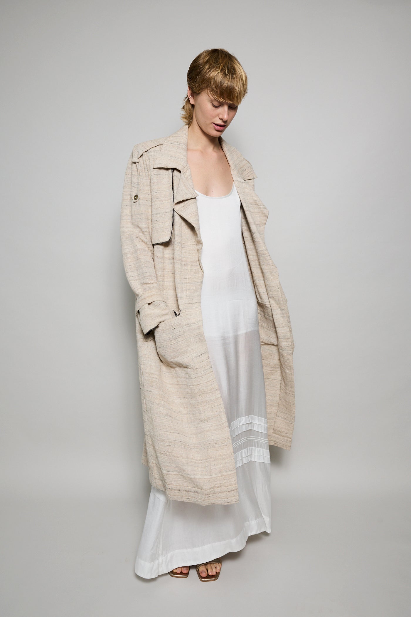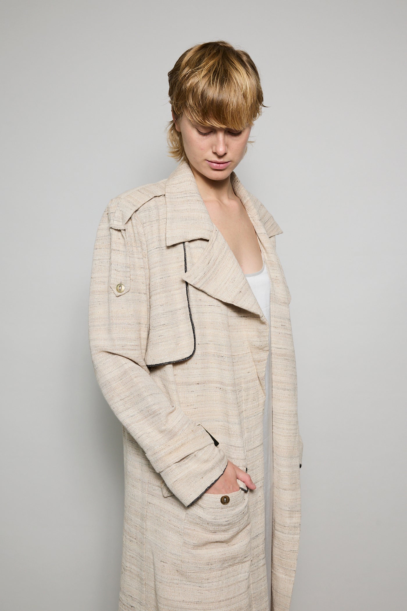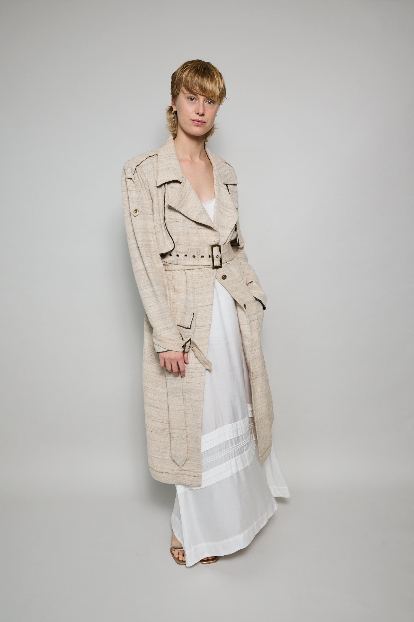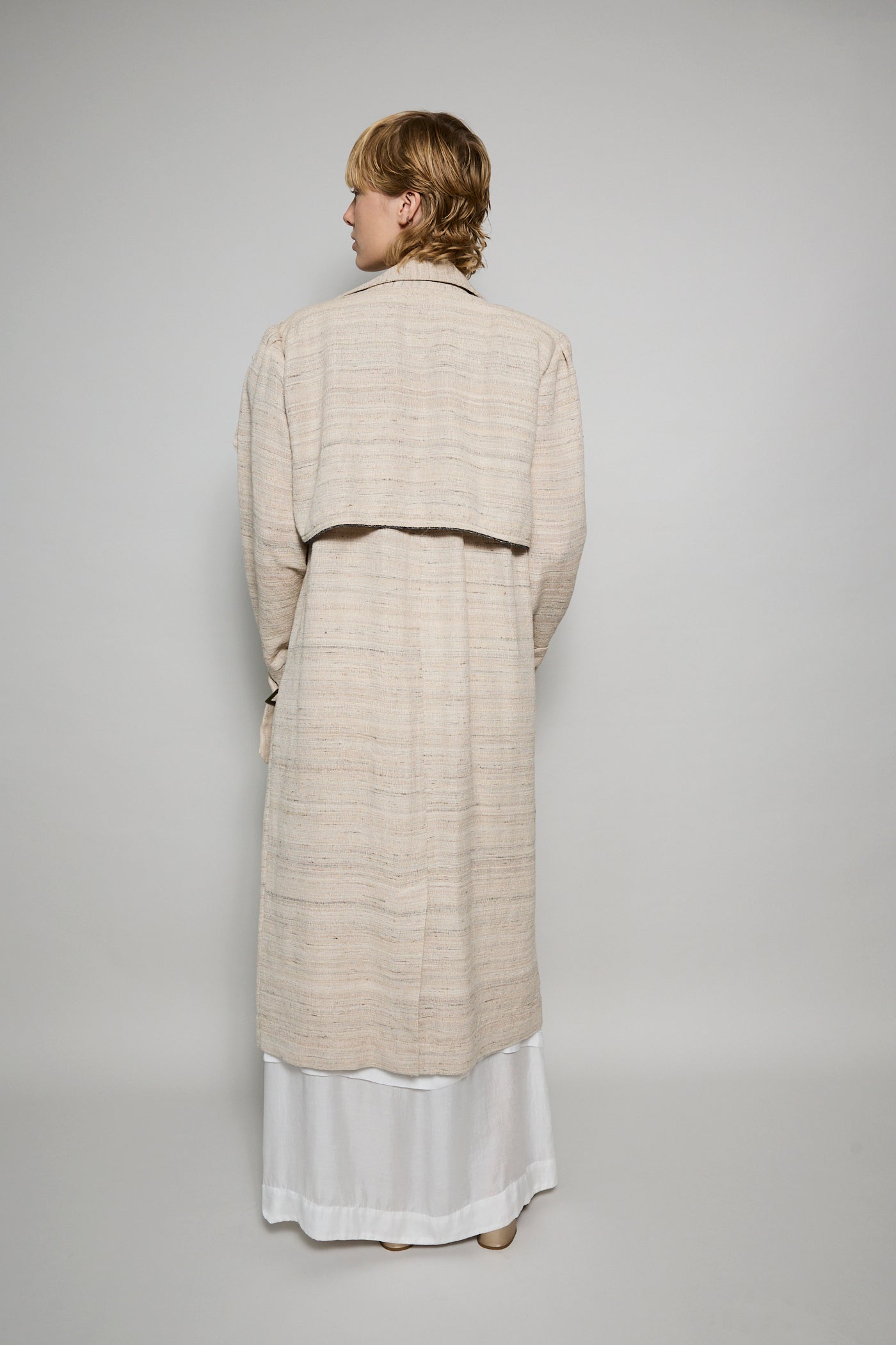 A classic trench coat made from intricate hand woven cotton & silk. The silk is undyed to reflect the beige natural color variations. Features shoulder epaulettes, back storm flap and centre vent. Sleeve loops with buckle fastening. The detachable belt allows you to wear open and oversized or cinched at the waist. Front flap pockets. Contrast black selvedge trim along the pocket flaps, sleeve ends and front/back storm flap. Gold hardware. A textured finish.