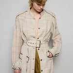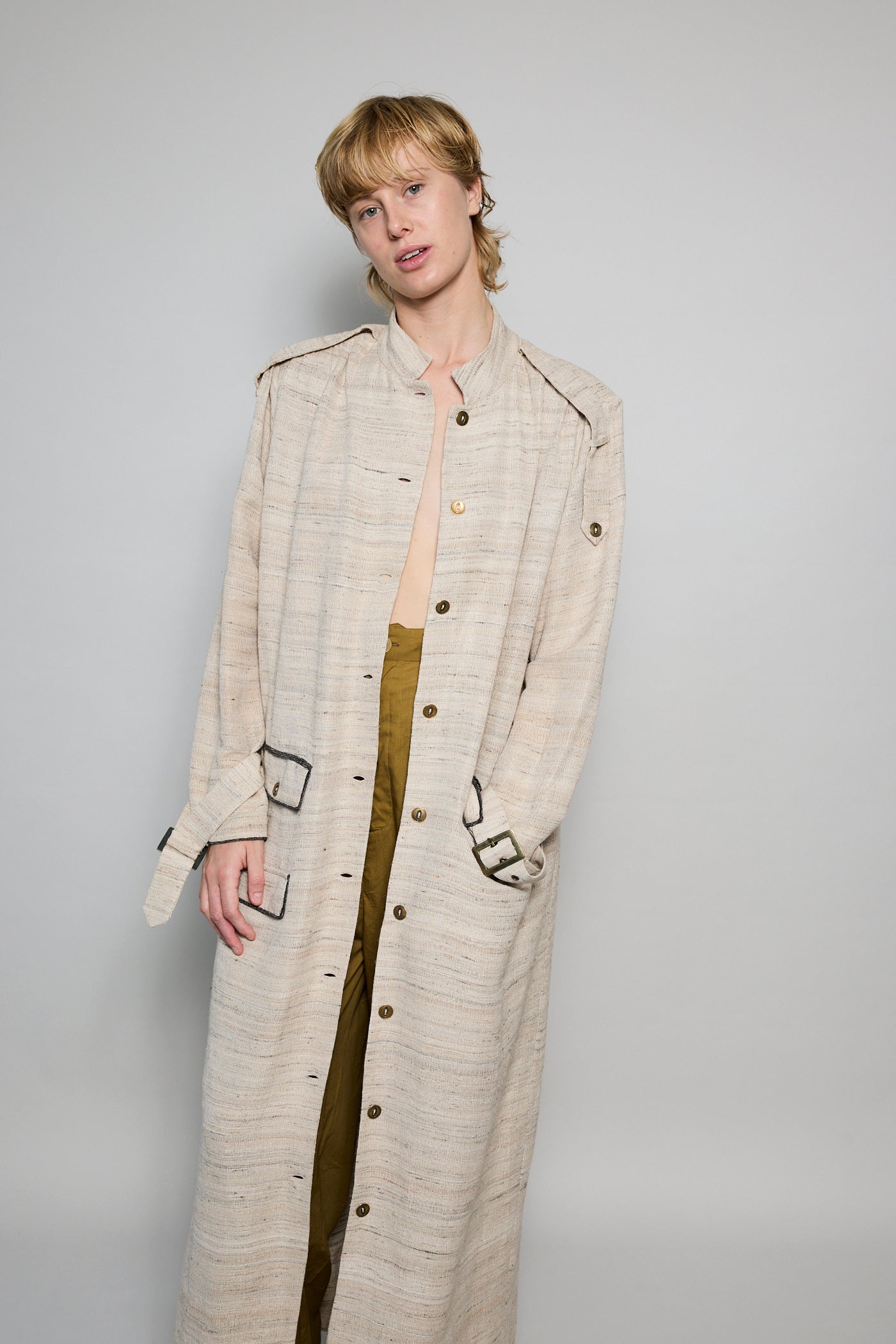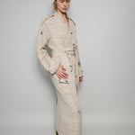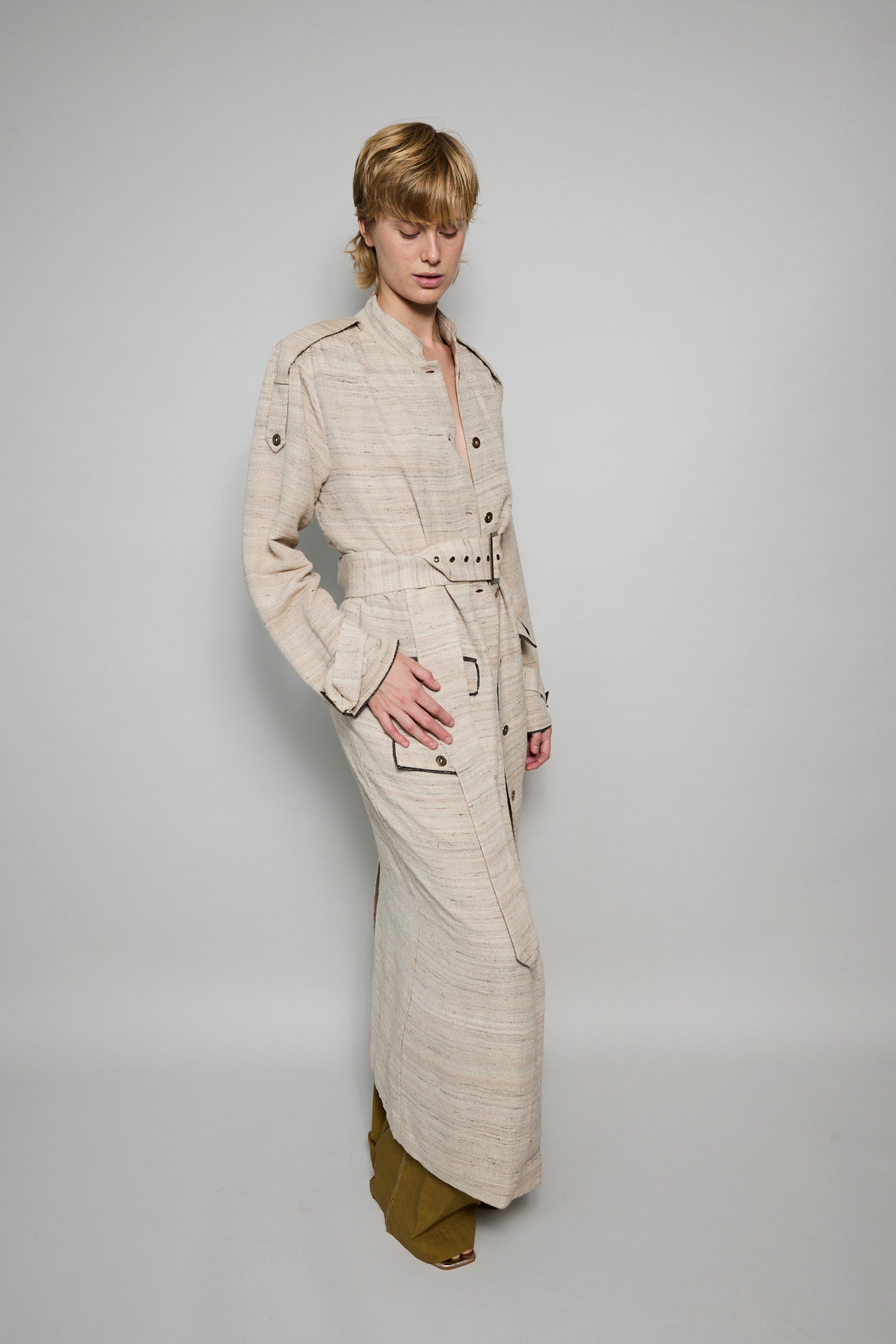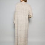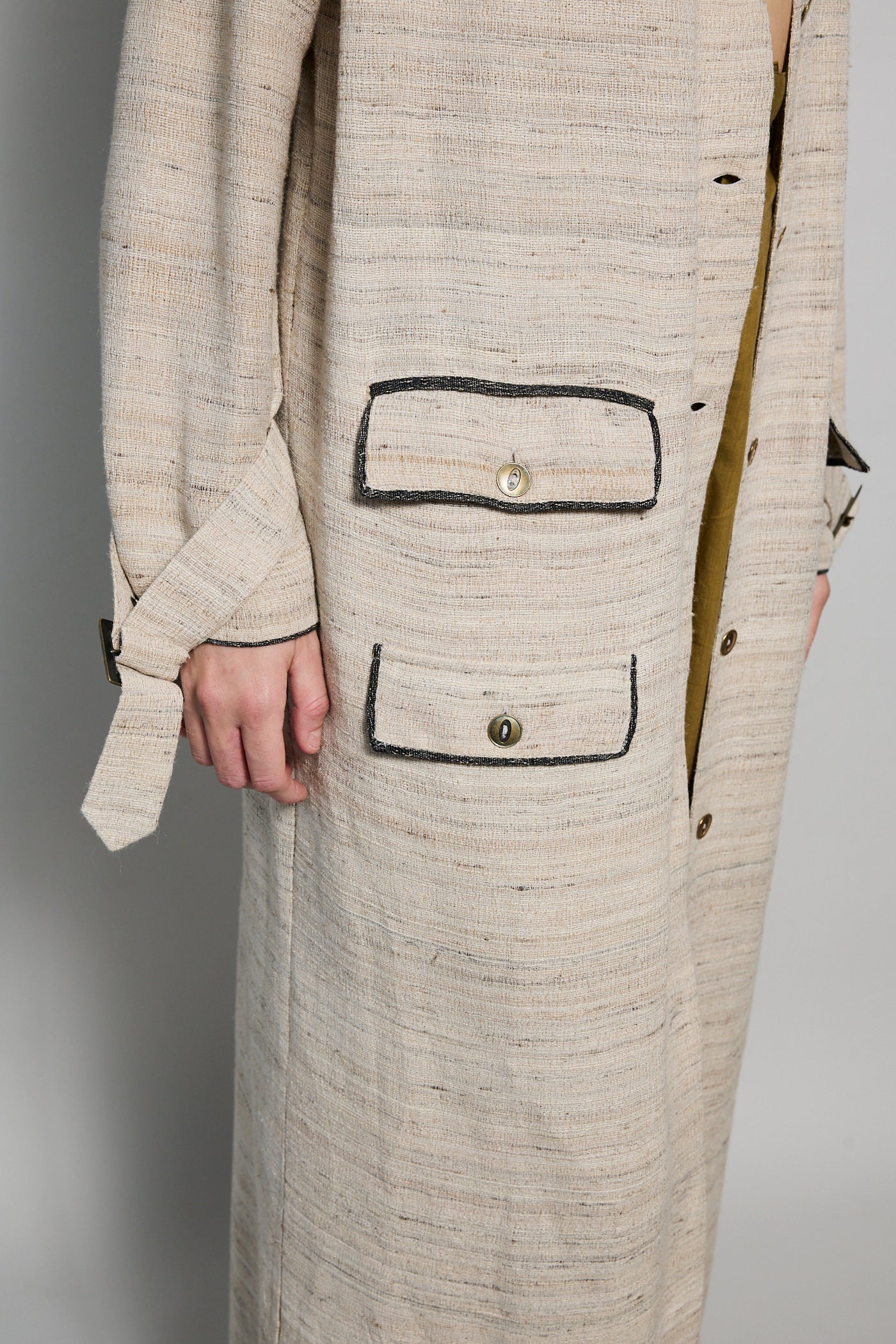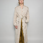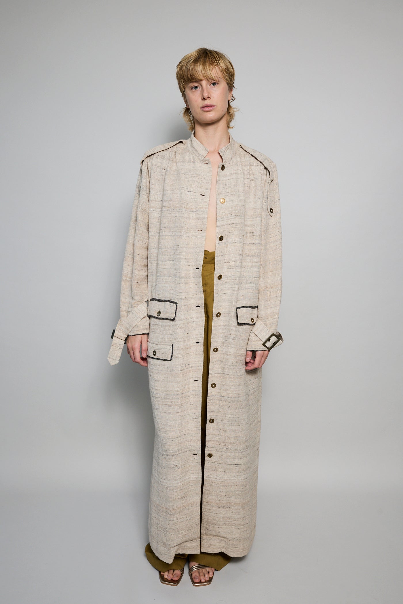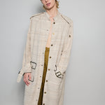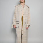A classic coat dress made from intricate hand-woven cotton & silk. The silk is undyed to reflect the beige natural color variations. Features a high neck, shoulder epaulettes and back yoke with pleats. Sleeve loops with buckle fastening. The detachable belt allows you to wear open and oversized or cinched at the waist. Three front flap pockets. Contrast black selvedge trim along the pocket flaps and sleeve ends. Gold hardware. A textured finish. Maxi length.
