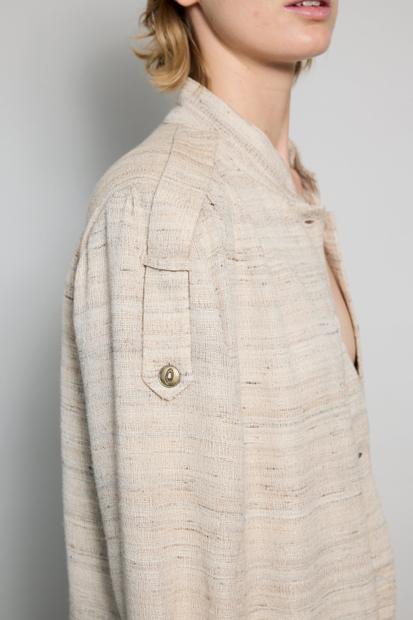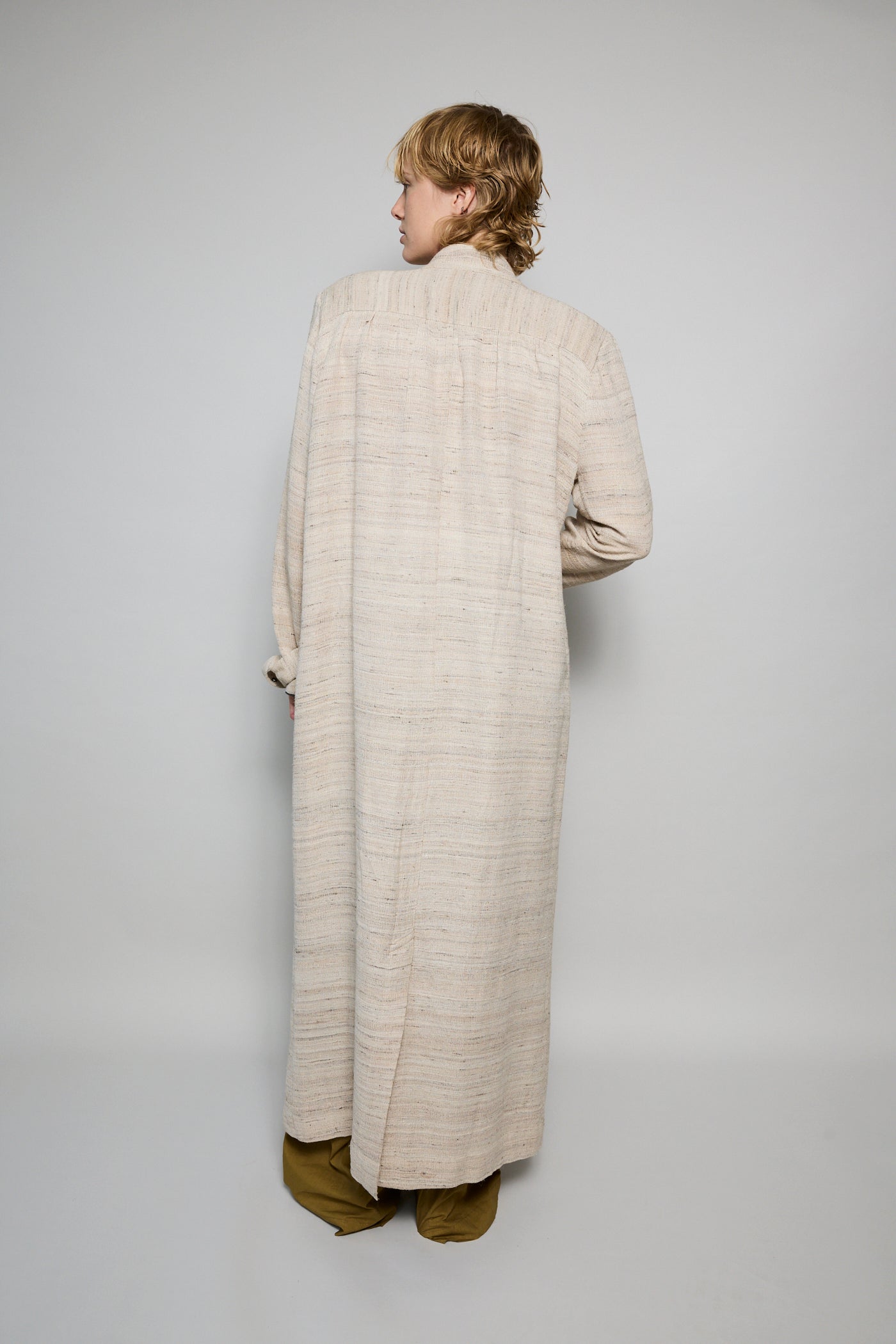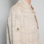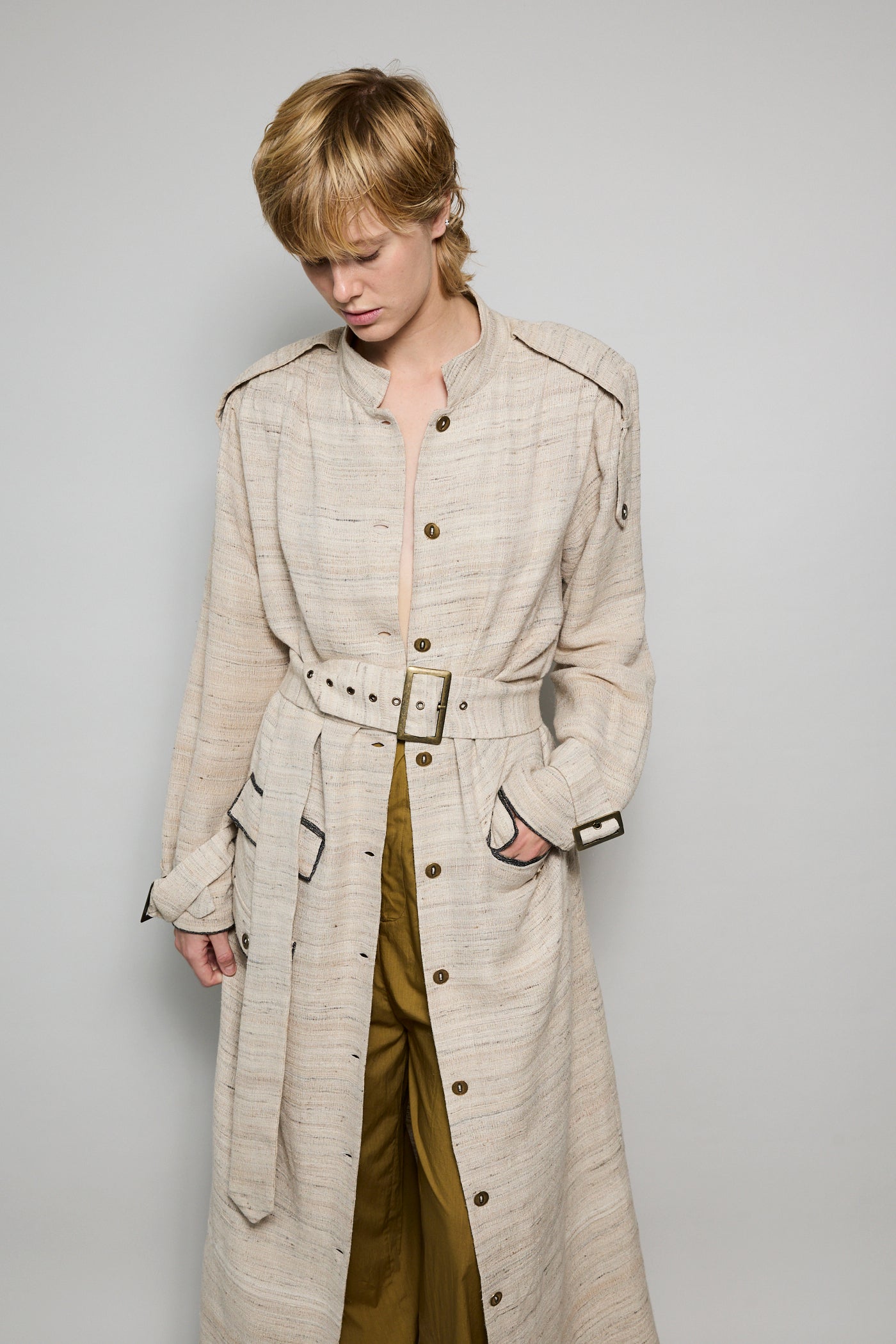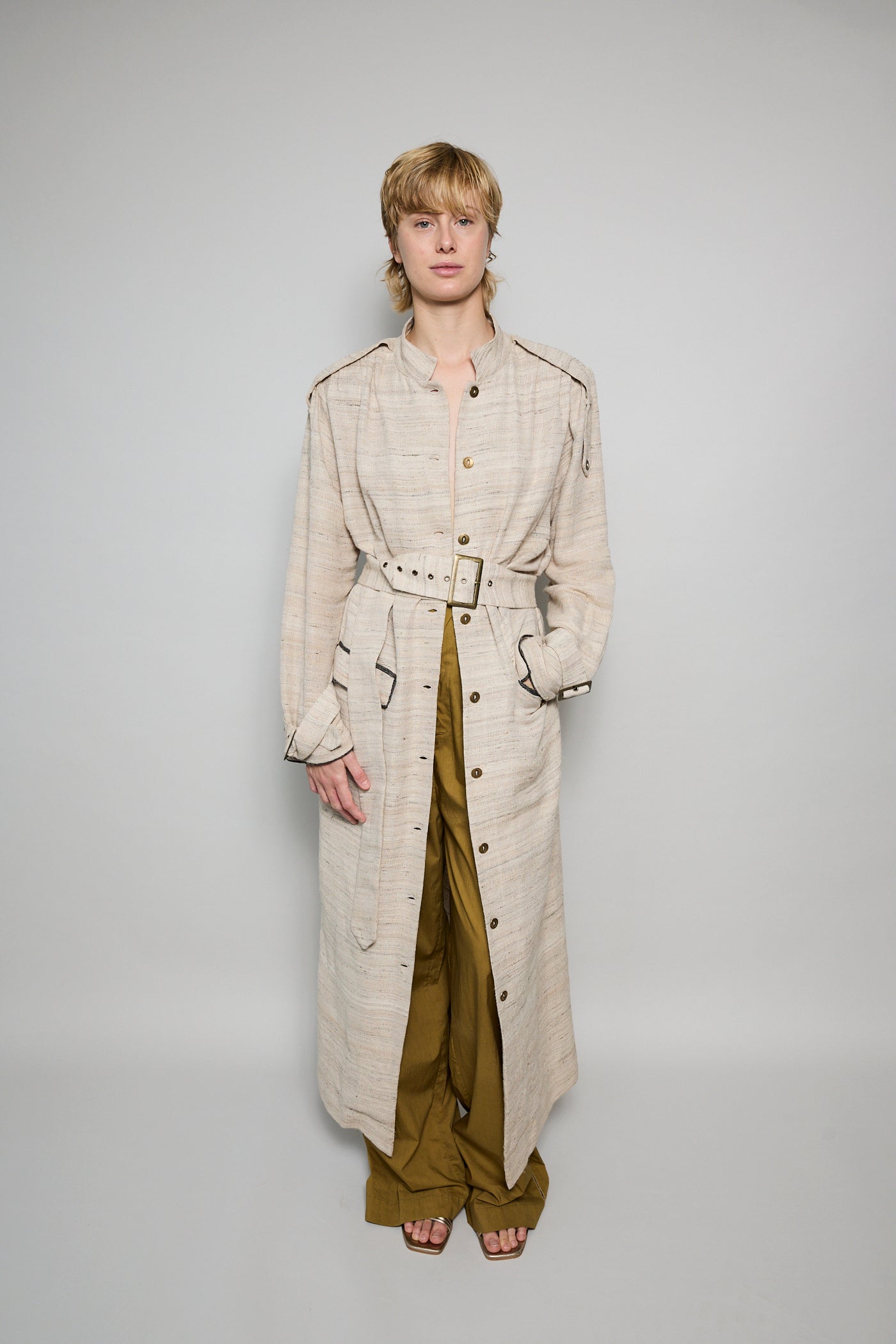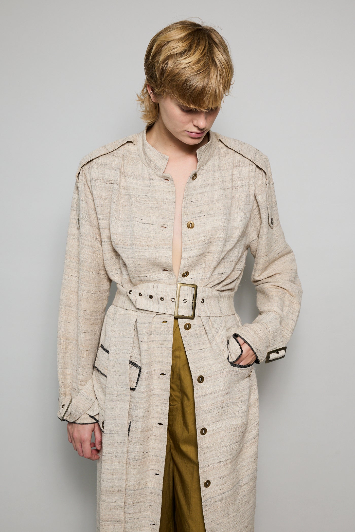 A classic coat dress made from intricate hand-woven cotton & silk. The silk is undyed to reflect the beige natural color variations. Features a high neck, shoulder epaulettes and back yoke with pleats. Sleeve loops with buckle fastening. The detachable belt allows you to wear open and oversized or cinched at the waist. Three front flap pockets. Contrast black selvedge trim along the pocket flaps and sleeve ends. Gold hardware. A textured finish. Maxi length.