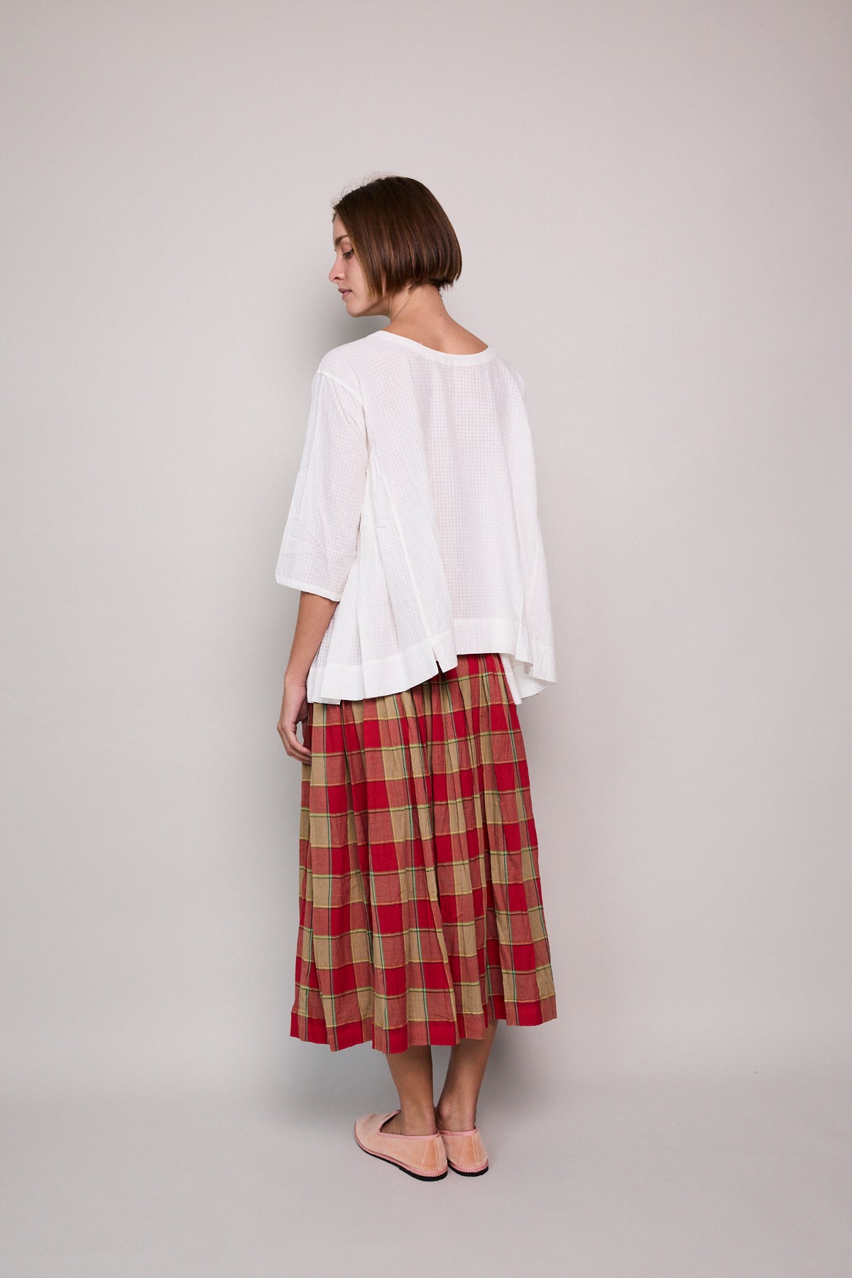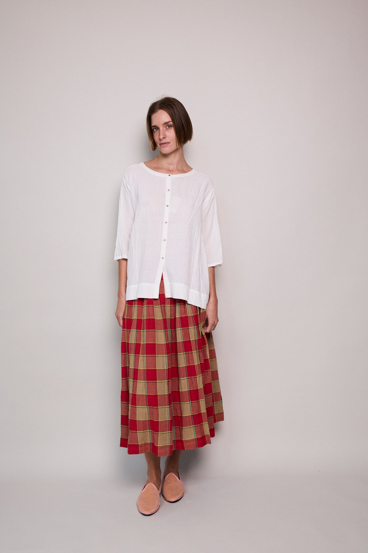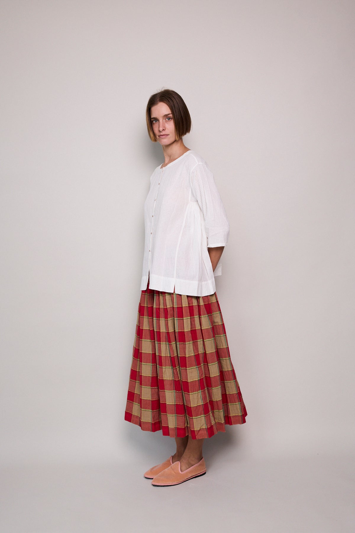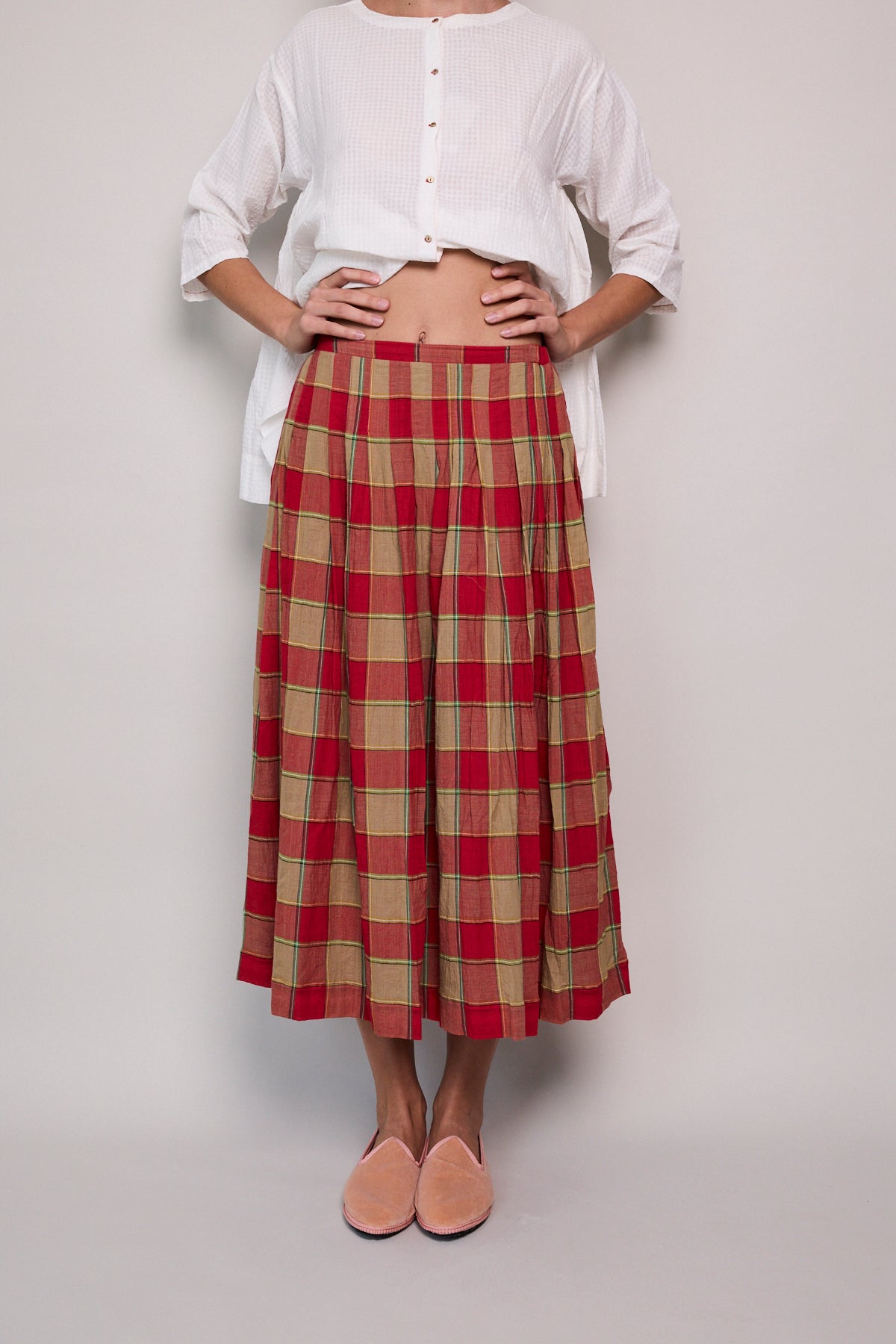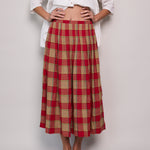 A full cotton handloom skirt. Checkered red, brown and green pattern through skirt. Elastic front with back band detail. Stitched pleats from waist along front and back. Midi in length. 100% red cotton lining.