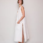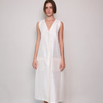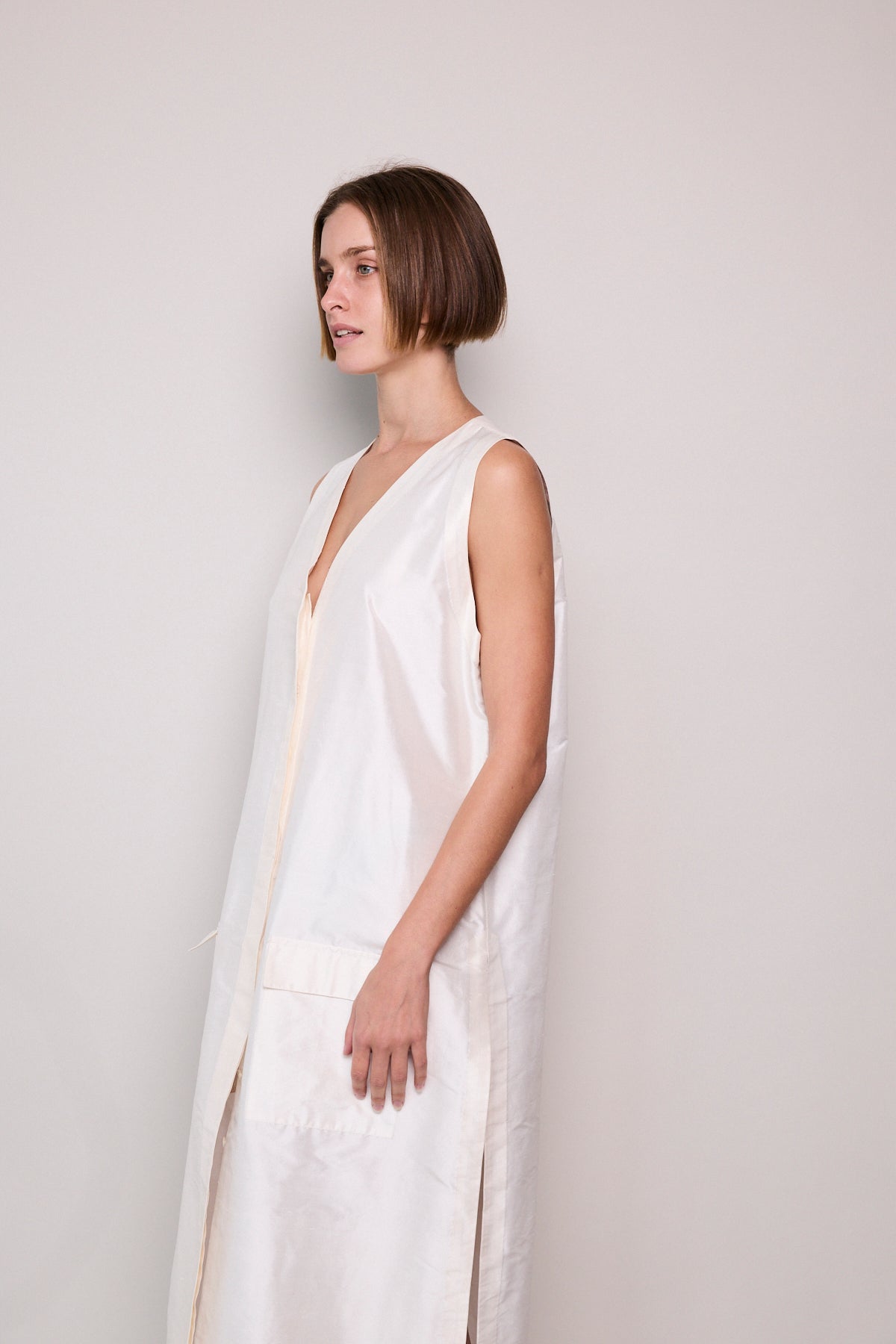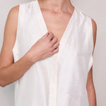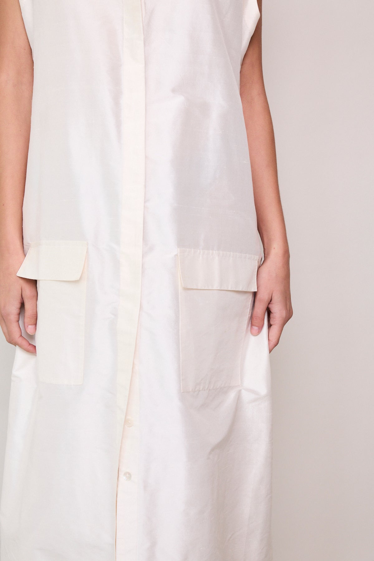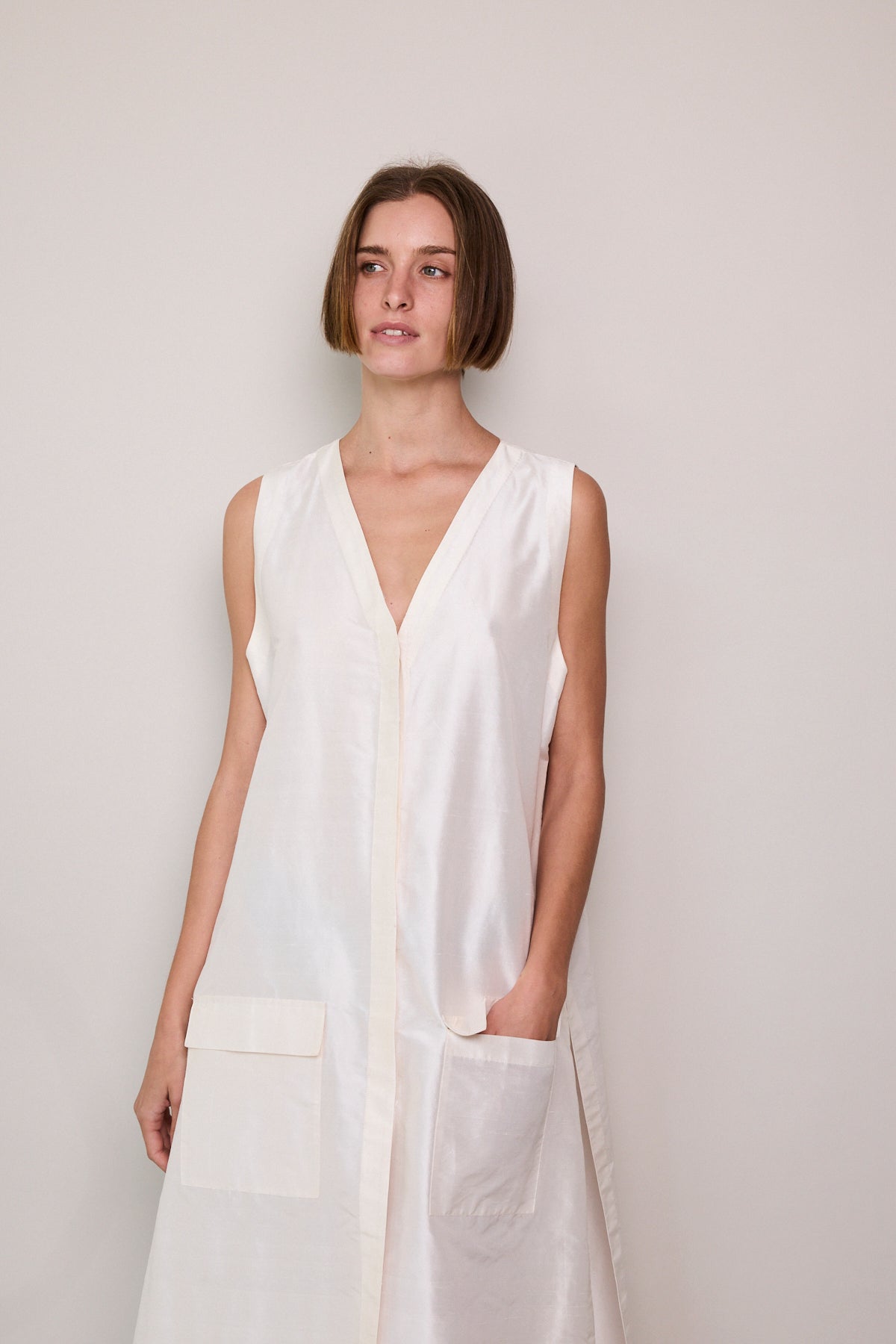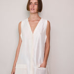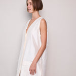 A classic ivory sleeveless A-line vest. Button up front with hidden placket detail. A V-neck with double side pocket detail and long side slits. Designed to be layered over pants or worn as itself as a dress.