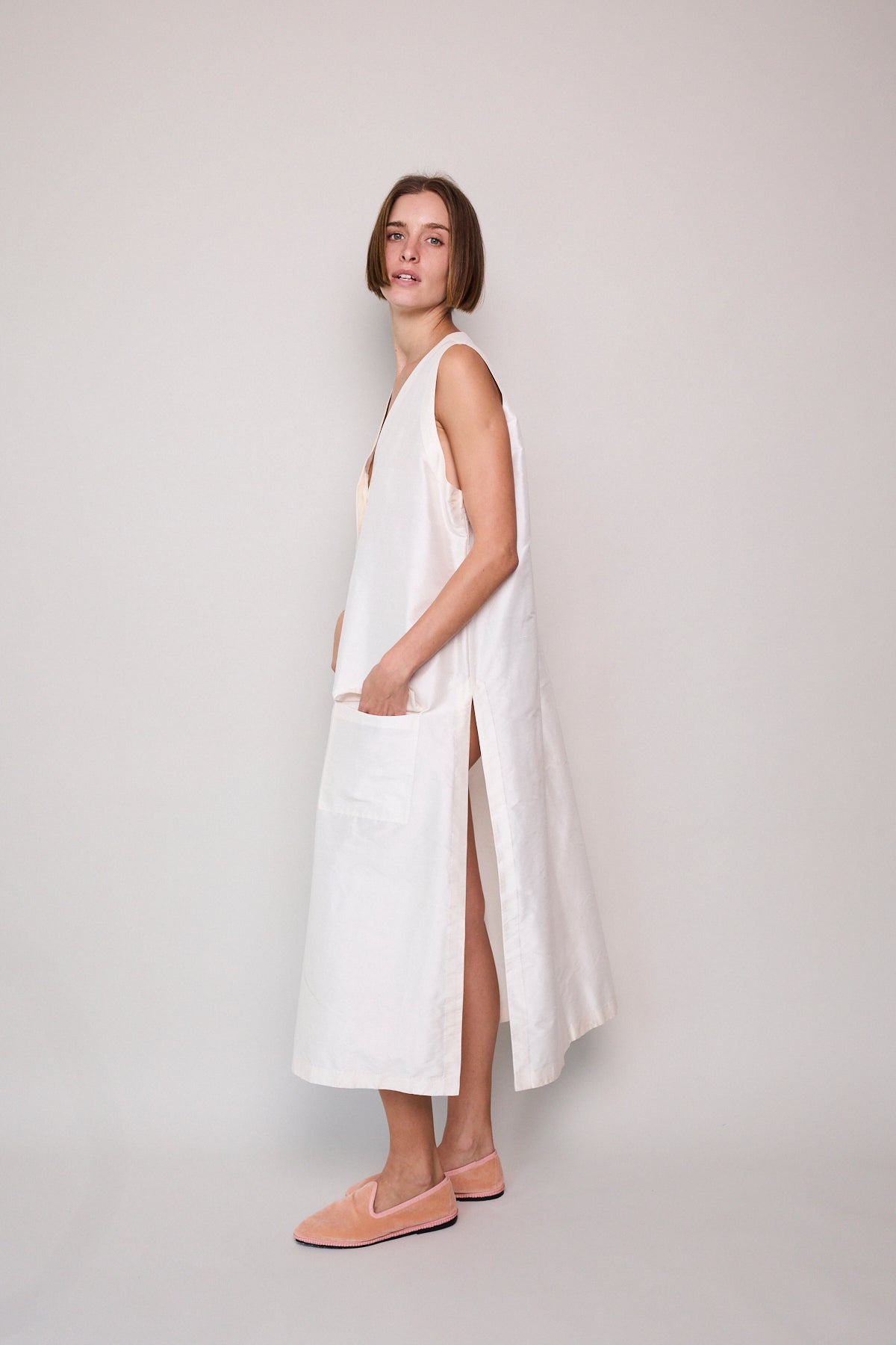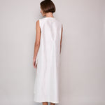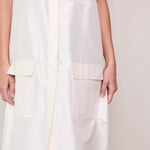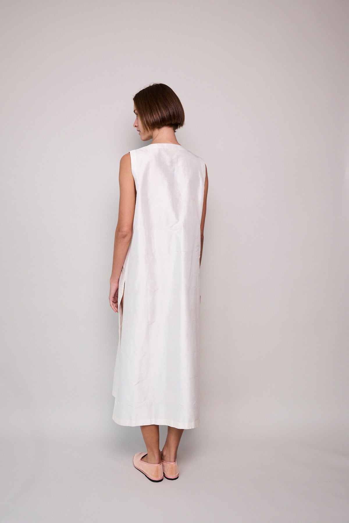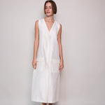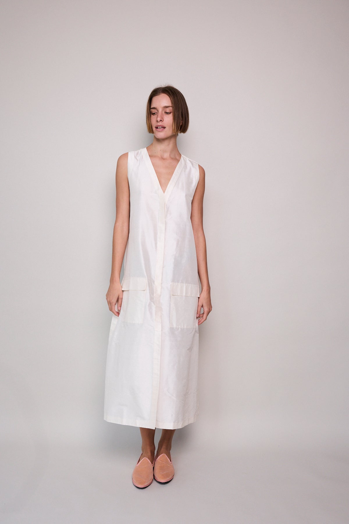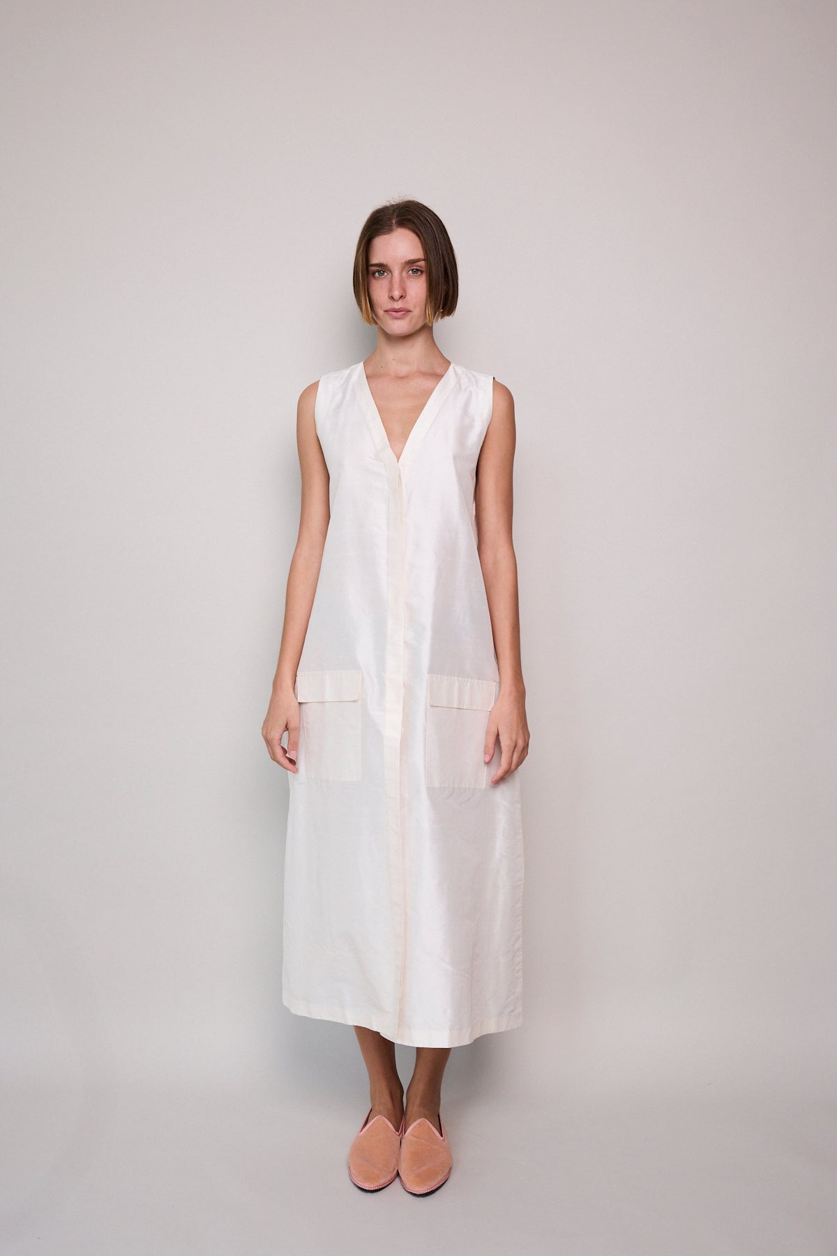 A classic ivory sleeveless A-line vest. Button up front with hidden placket detail. A V-neck with double side pocket detail and long side slits. Designed to be layered over pants or worn as itself as a dress.