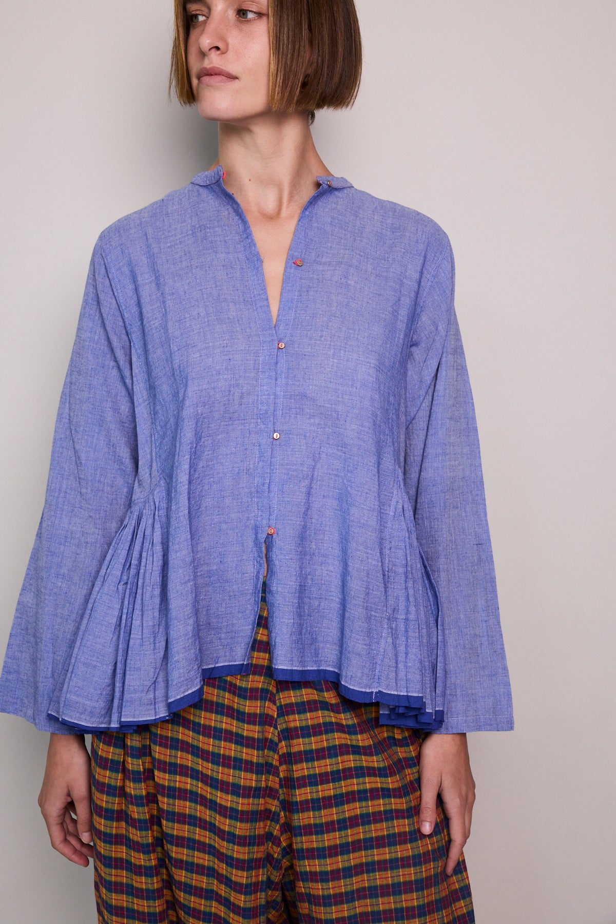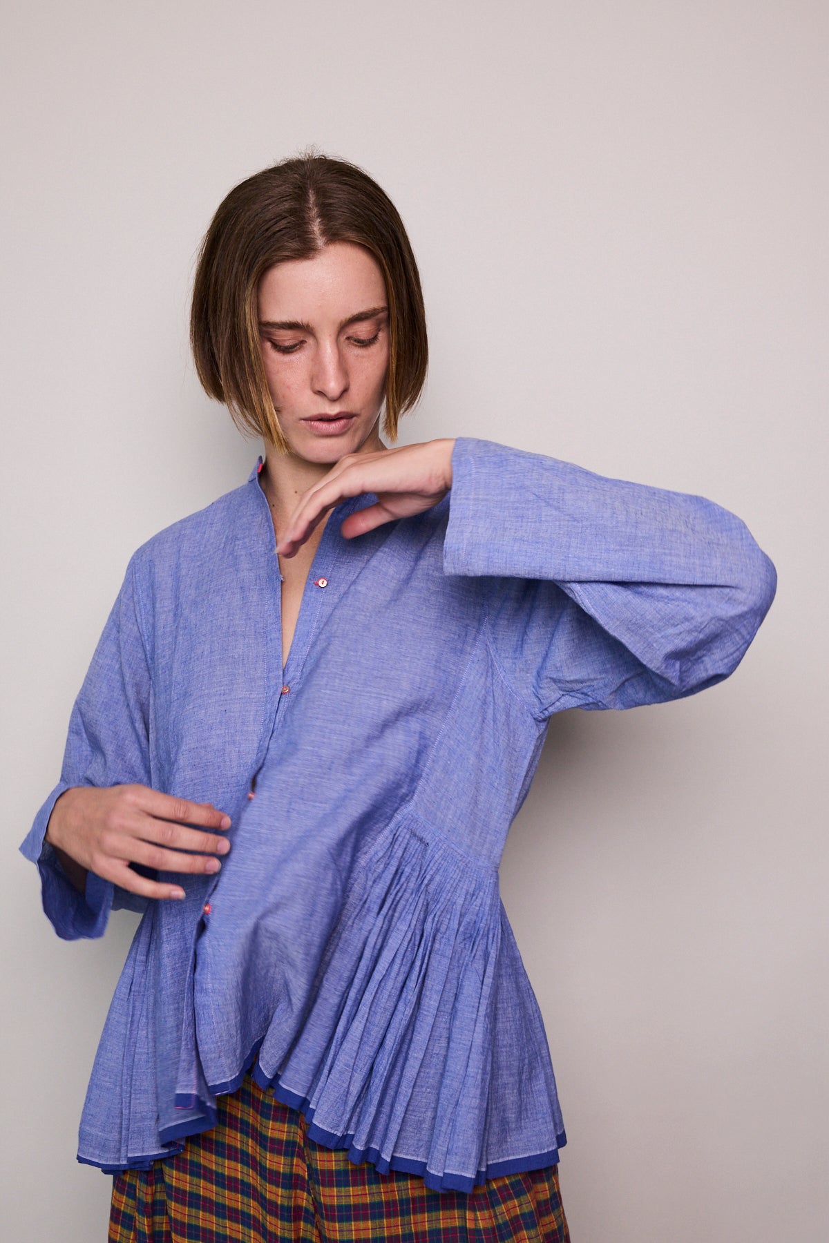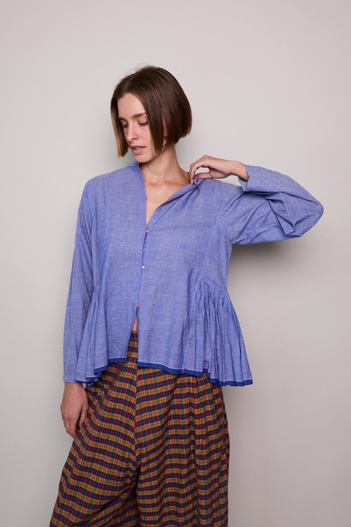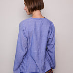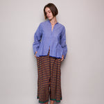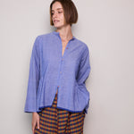 A peplum style handloom cotton shirt  Features button up front with contrast pink stitch and loops. Silver metal button closure. A high neck with side panel and pleat detail. Full sleeved. Cobalt blue stripe selvedge along hem.