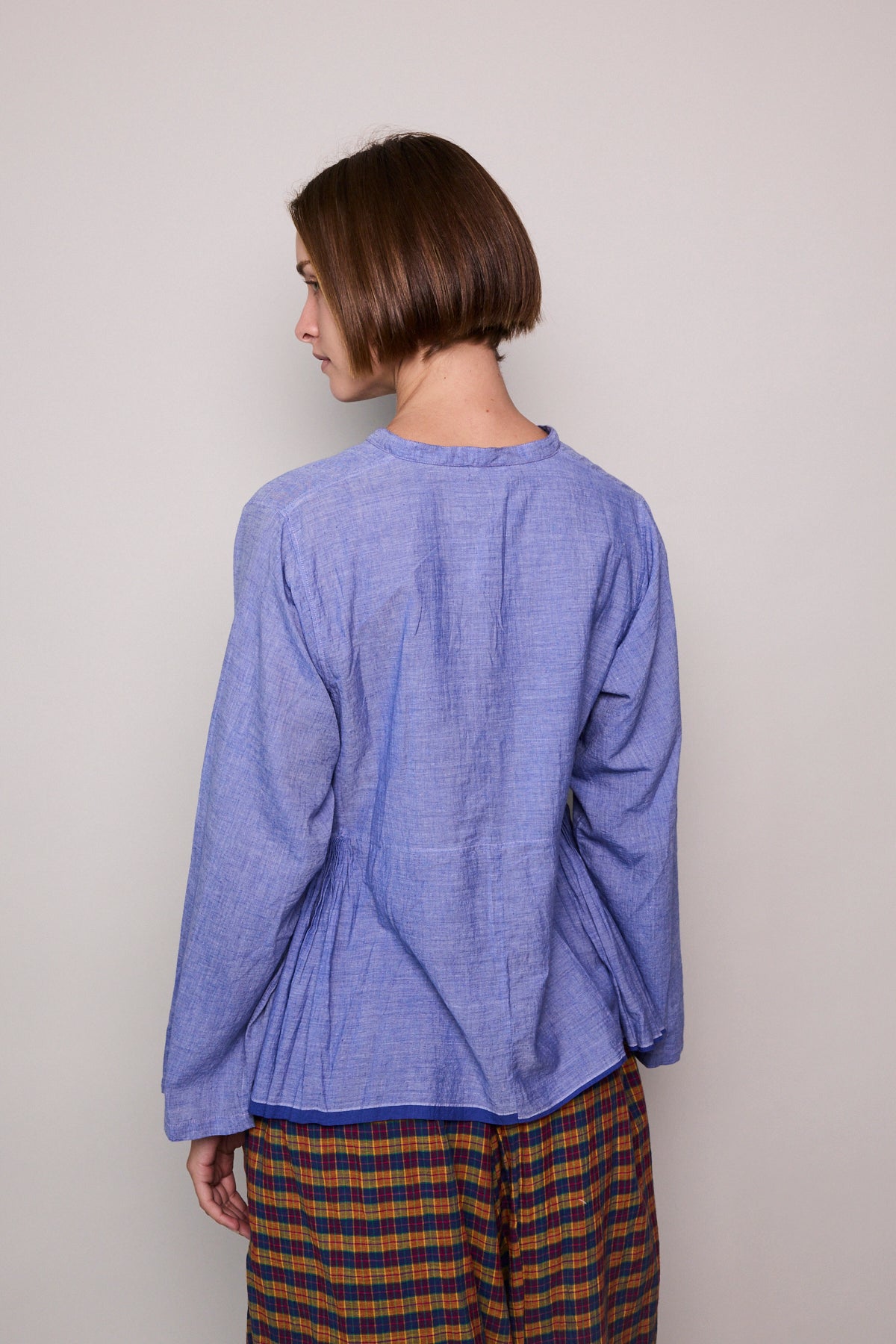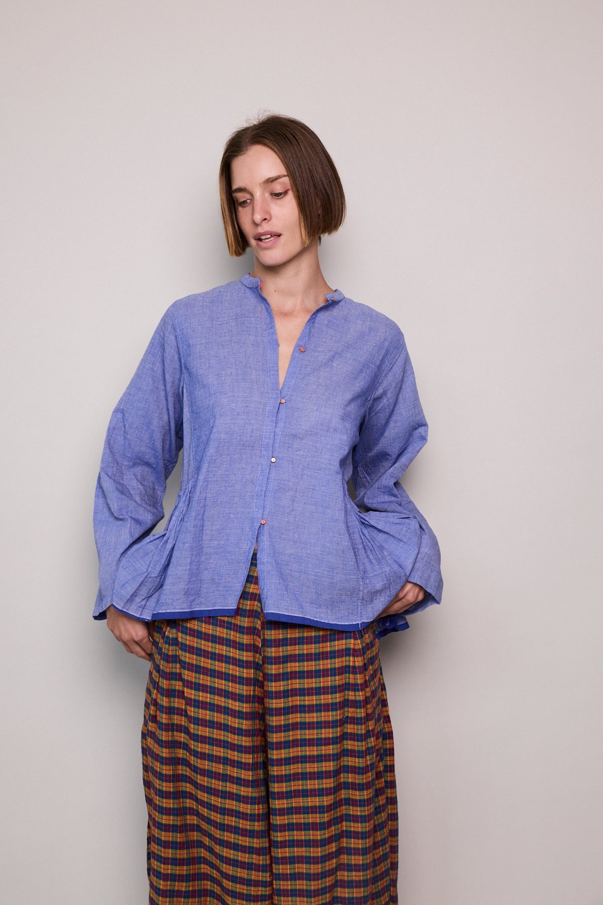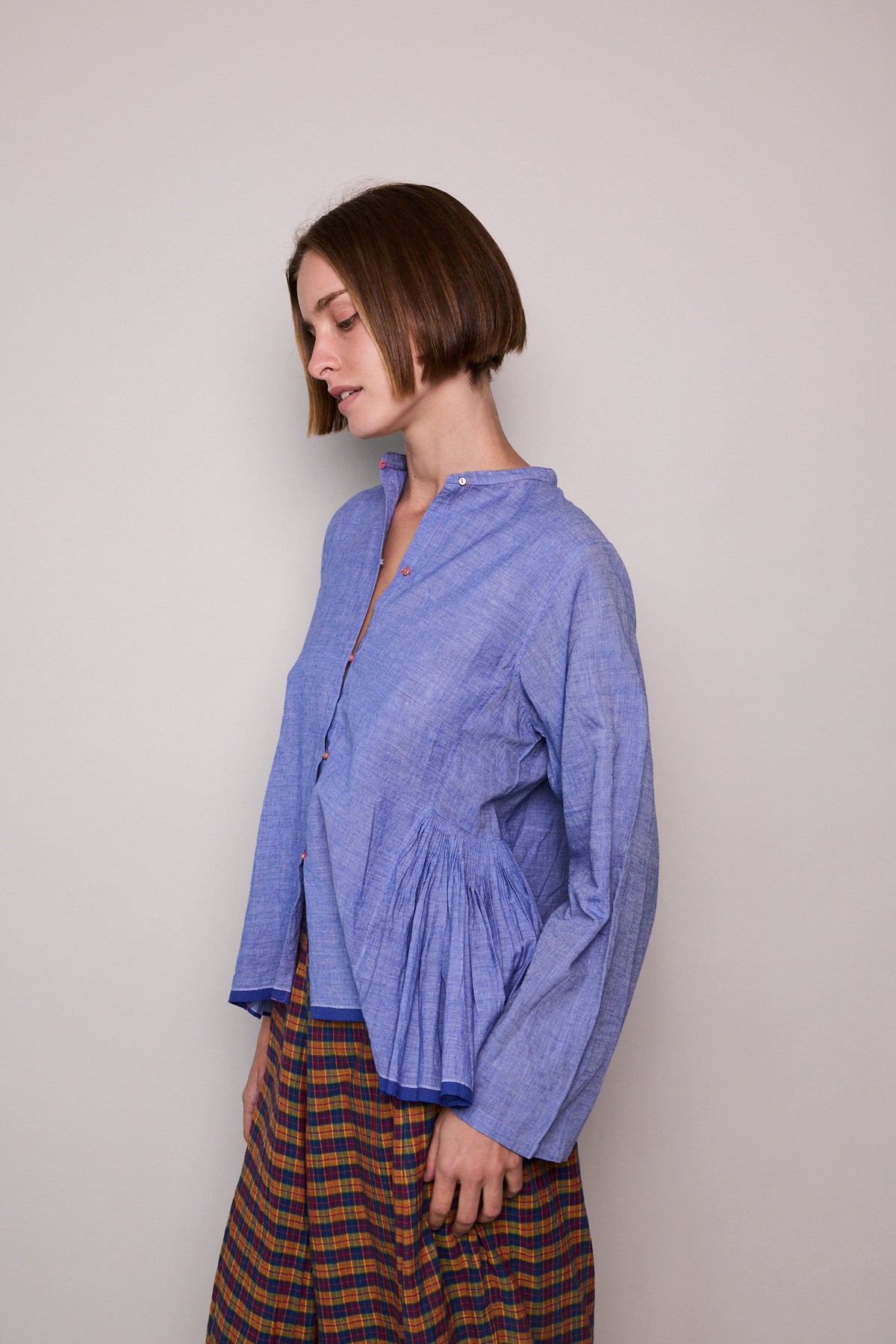 A peplum style handloom cotton shirt  Features button up front with contrast pink stitch and loops. Silver metal button closure. A high neck with side panel and pleat detail. Full sleeved. Cobalt blue stripe selvedge along hem.
