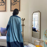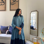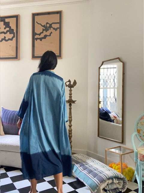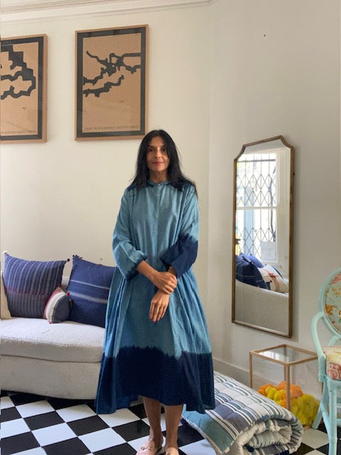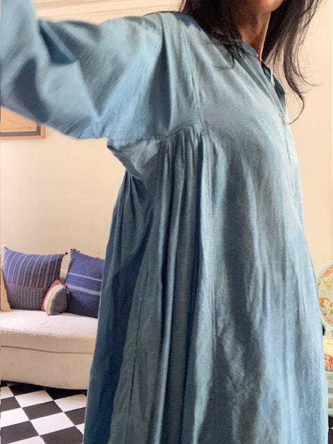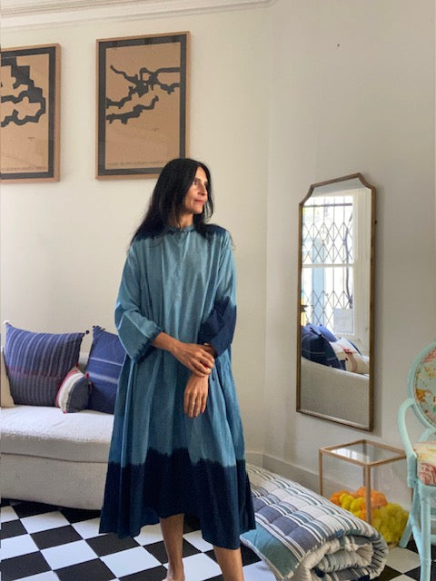 A shirt dress style soft handloom cotton dress in shades of indigo, blue and ivory tie&dye. Features a high collar with gold metallic buttons. Side pleat detail under the arms. Side pockets.