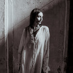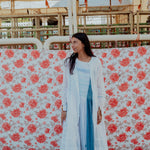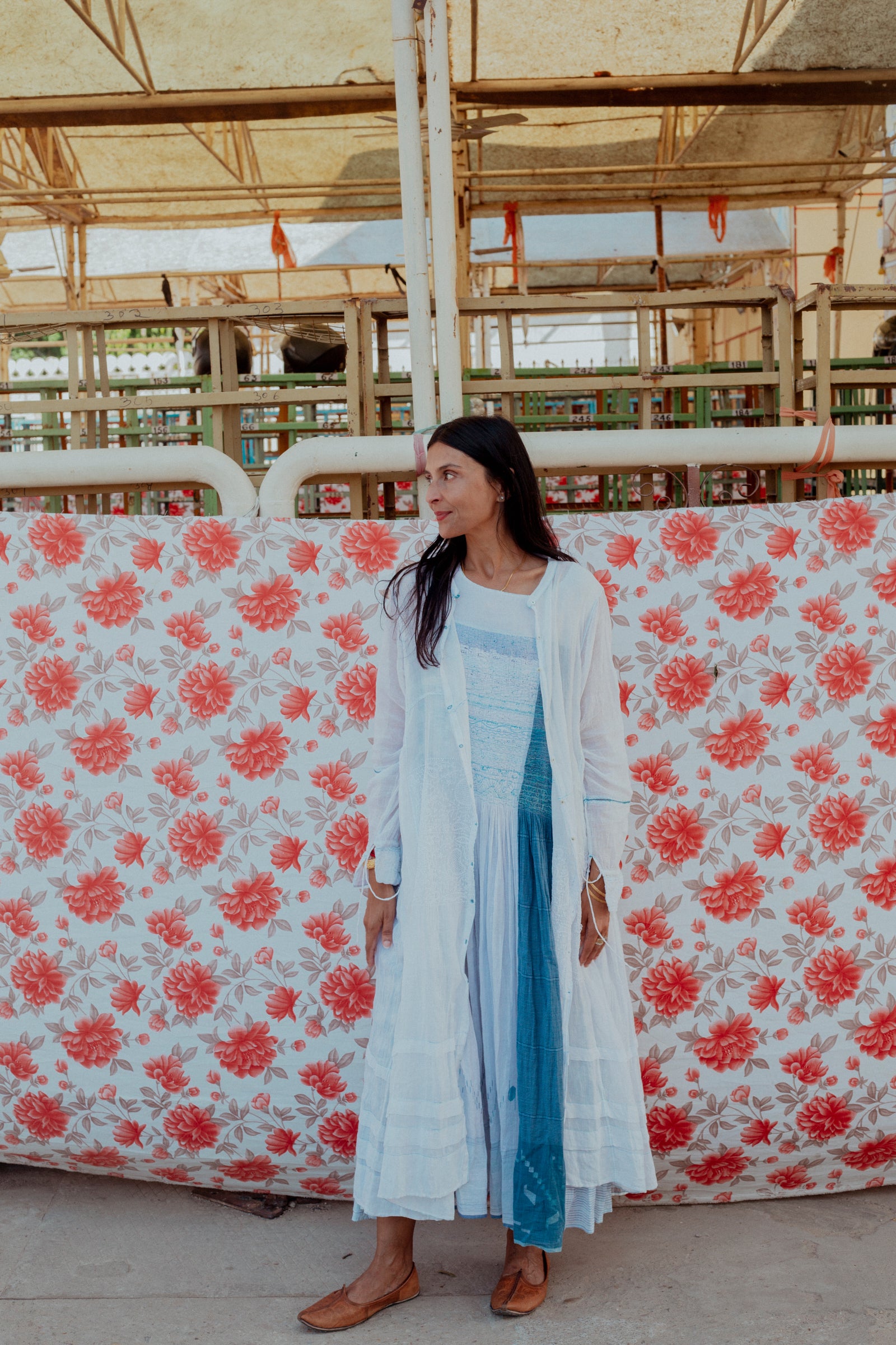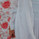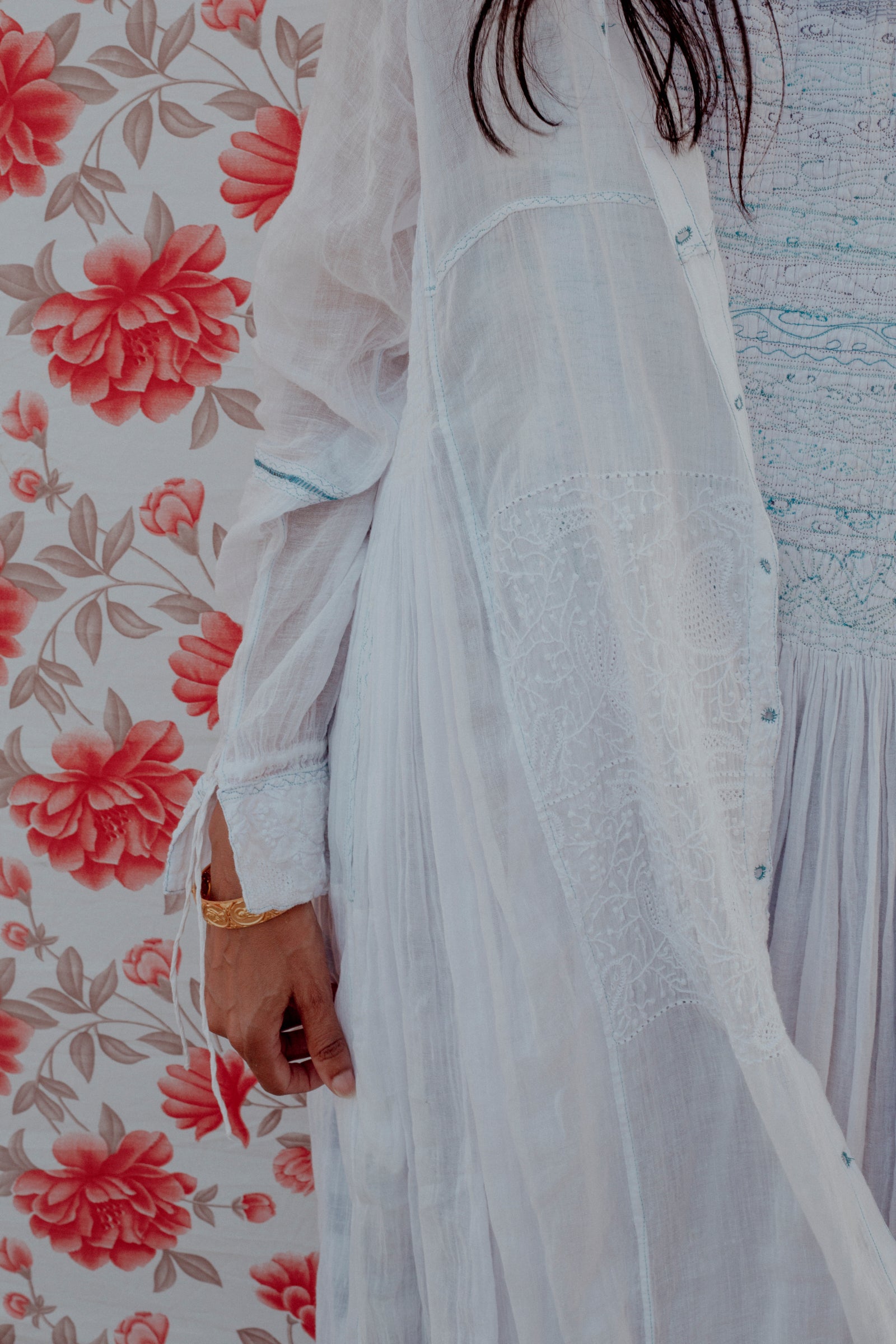 A exquisite handwoven muslin cotton dress with delicate white chikan hand embroidery along the front panels of dress and sleeve cuffs. A high neck front button-down style with metallic button closure. Contrast blue stitch detail on button holes and along dress panels. Blue embroidery and interlock detail along cuffs and mid sleeve. Side pleats under armhole. A string closure for cuffs. Rows of pleats along hemline. Side pockets. A delicate sheer finish.