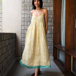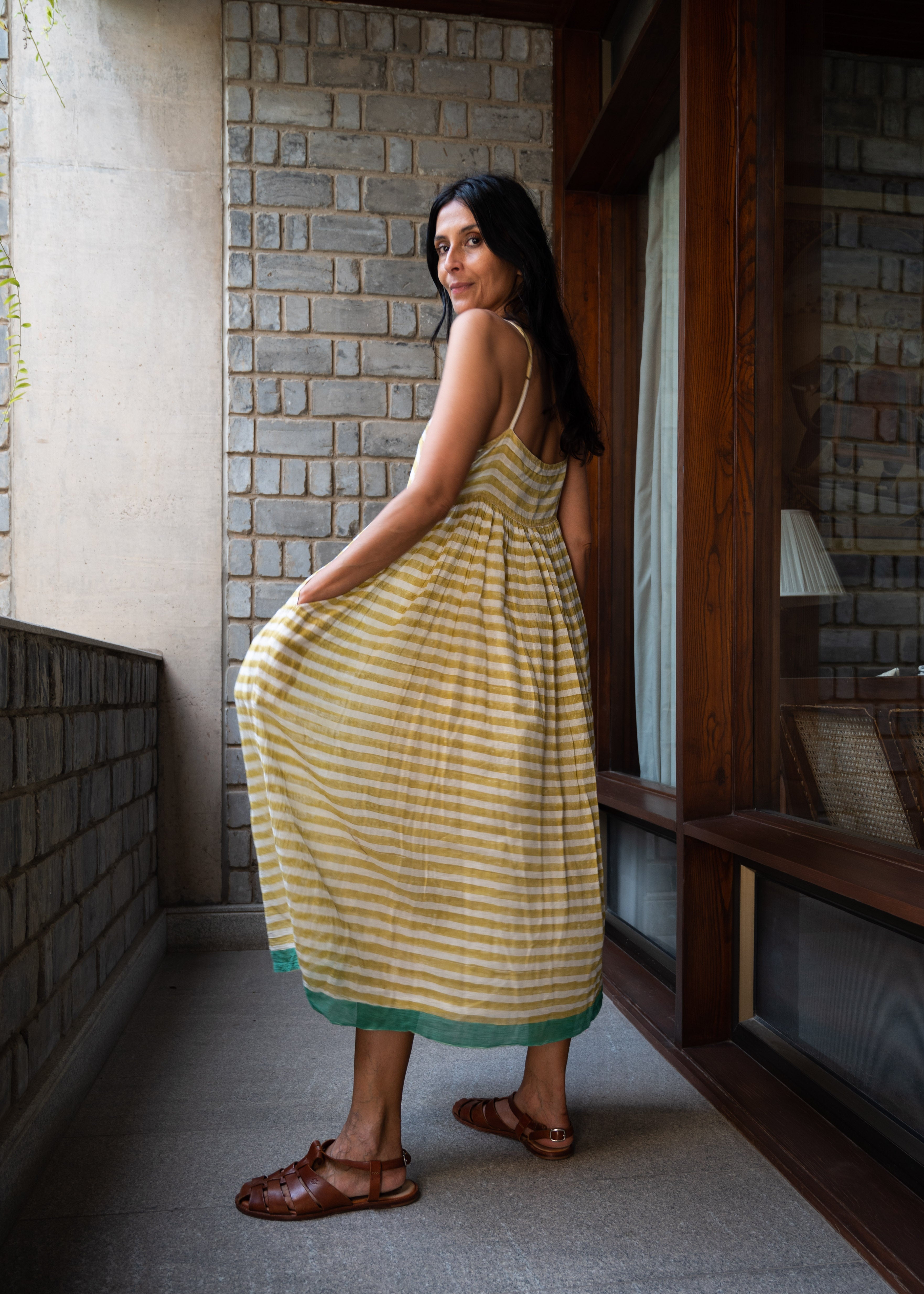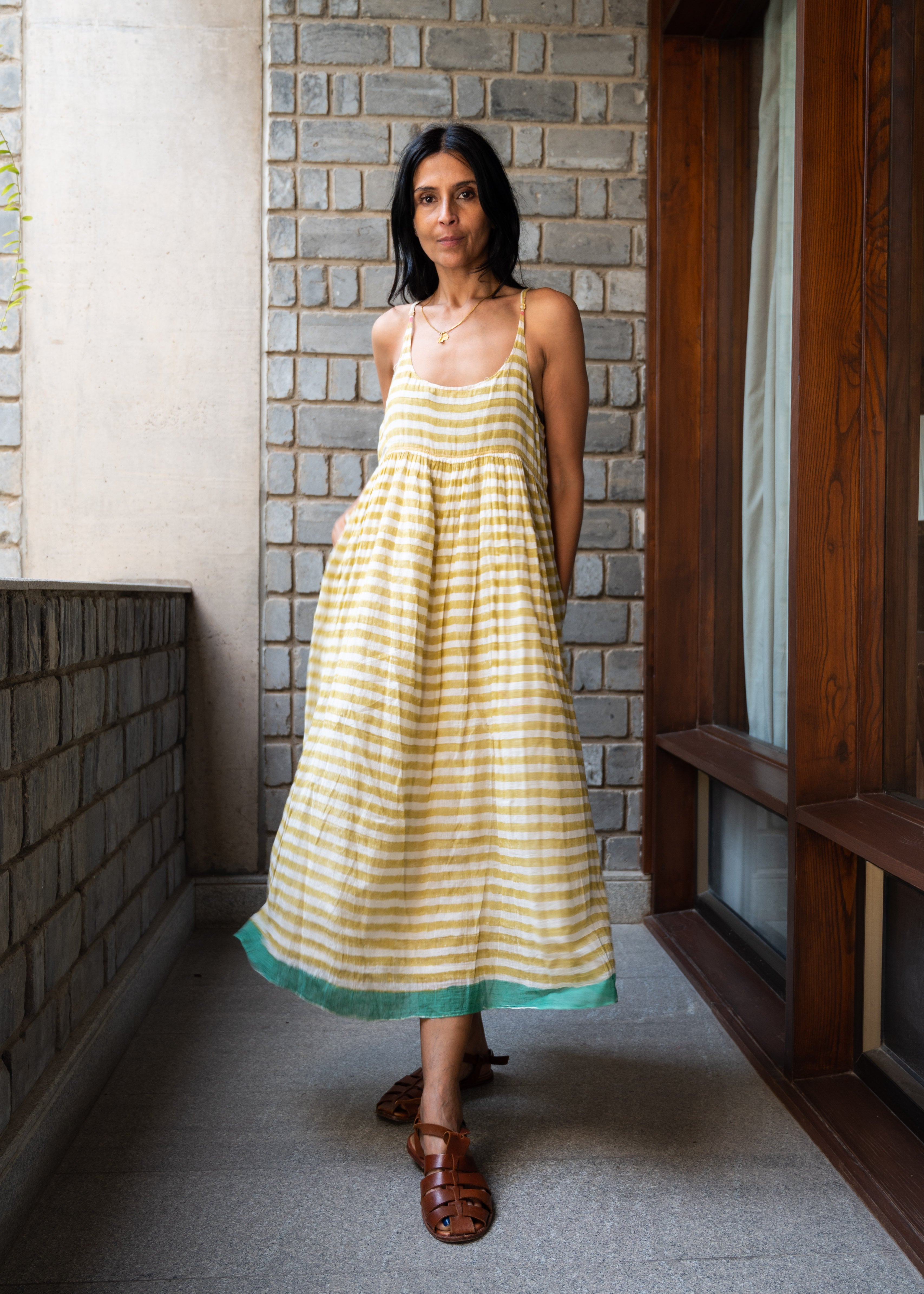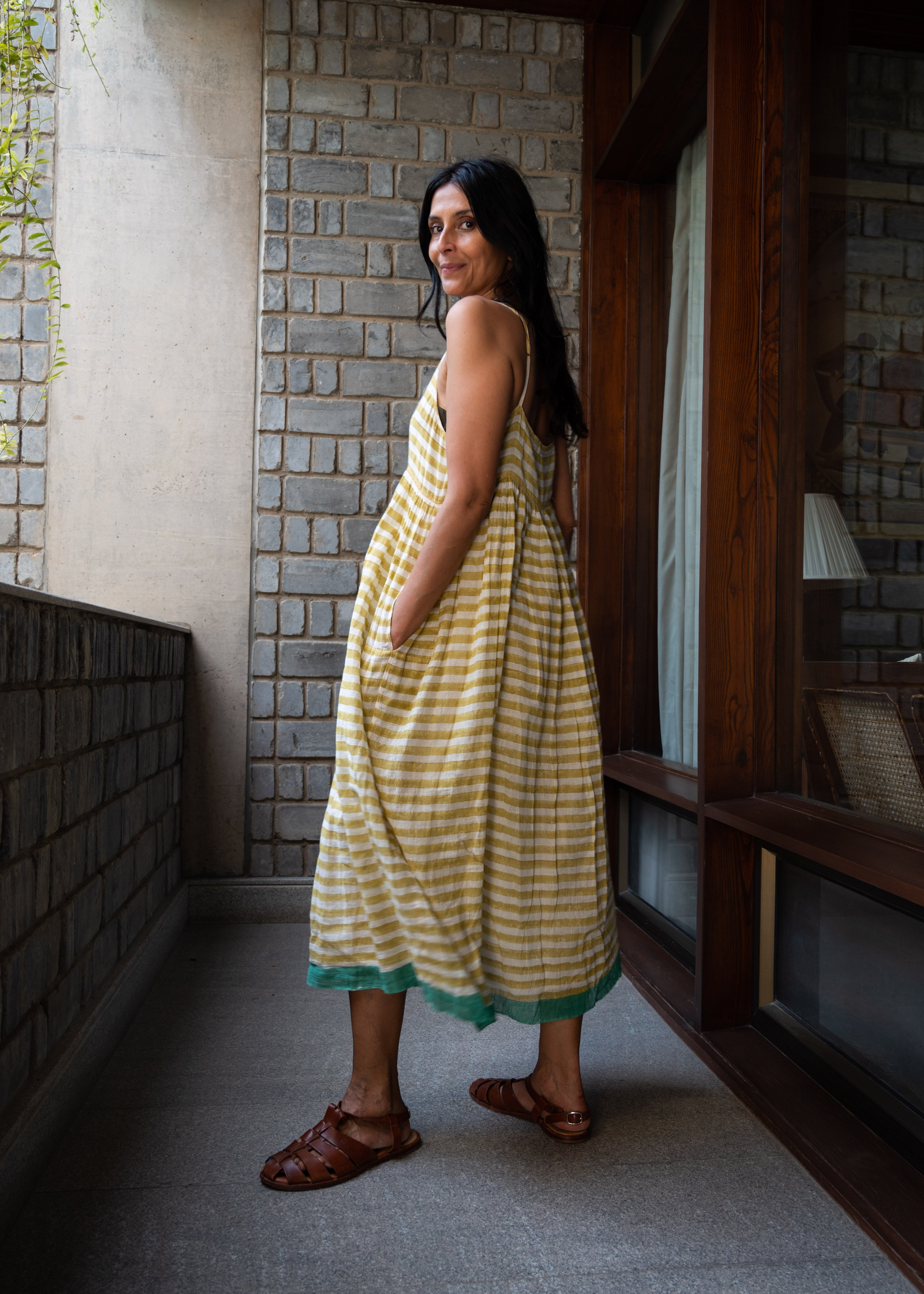 A babydoll style slip dress. Features a round scoop neck with thin adjustable strap detail. Maxi length with ruching under the chest. Handwoven stripe detail through the dress. Lightweight style with inside cotton lining. Side pockets. Contrast green border along hemline.