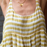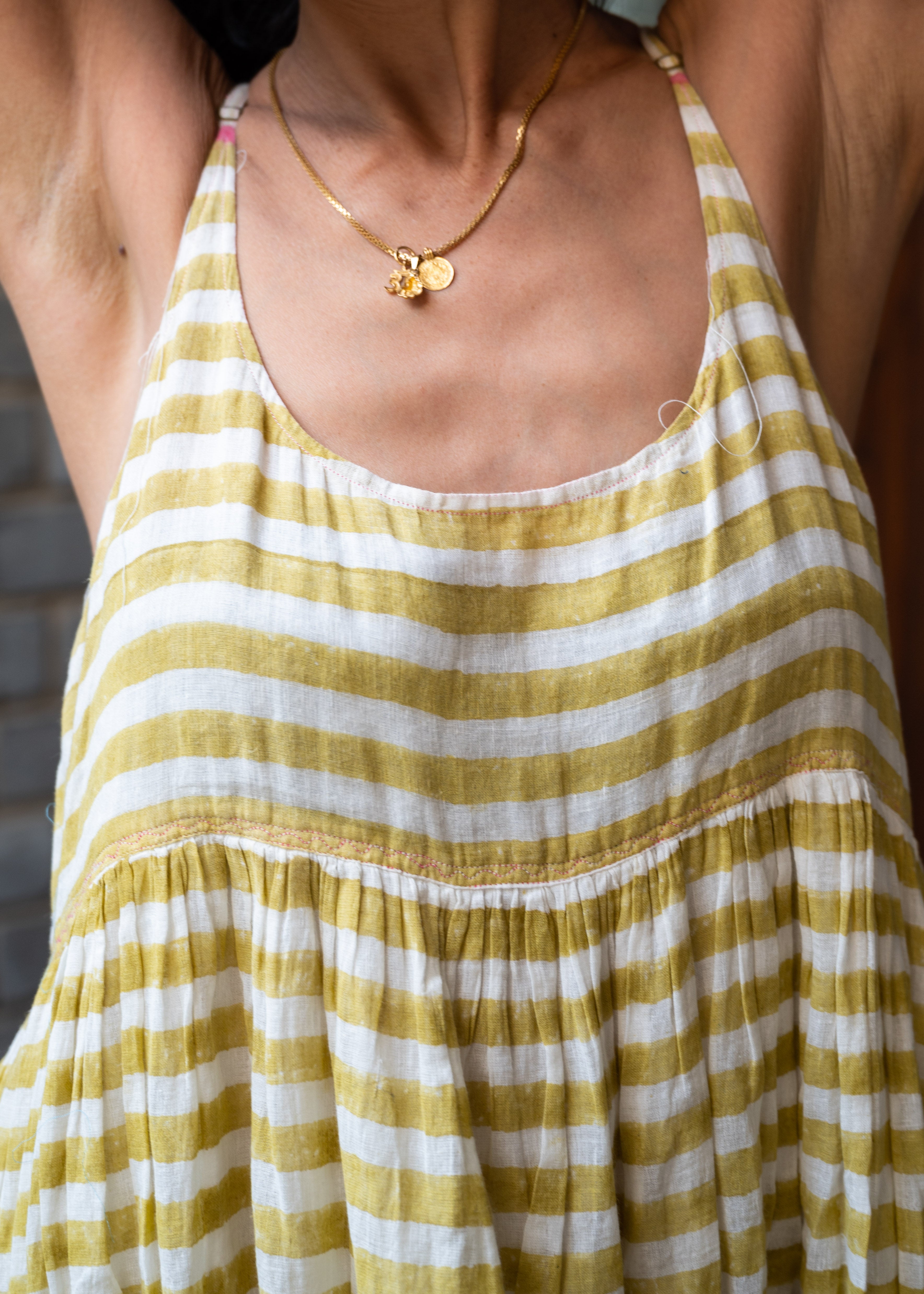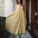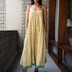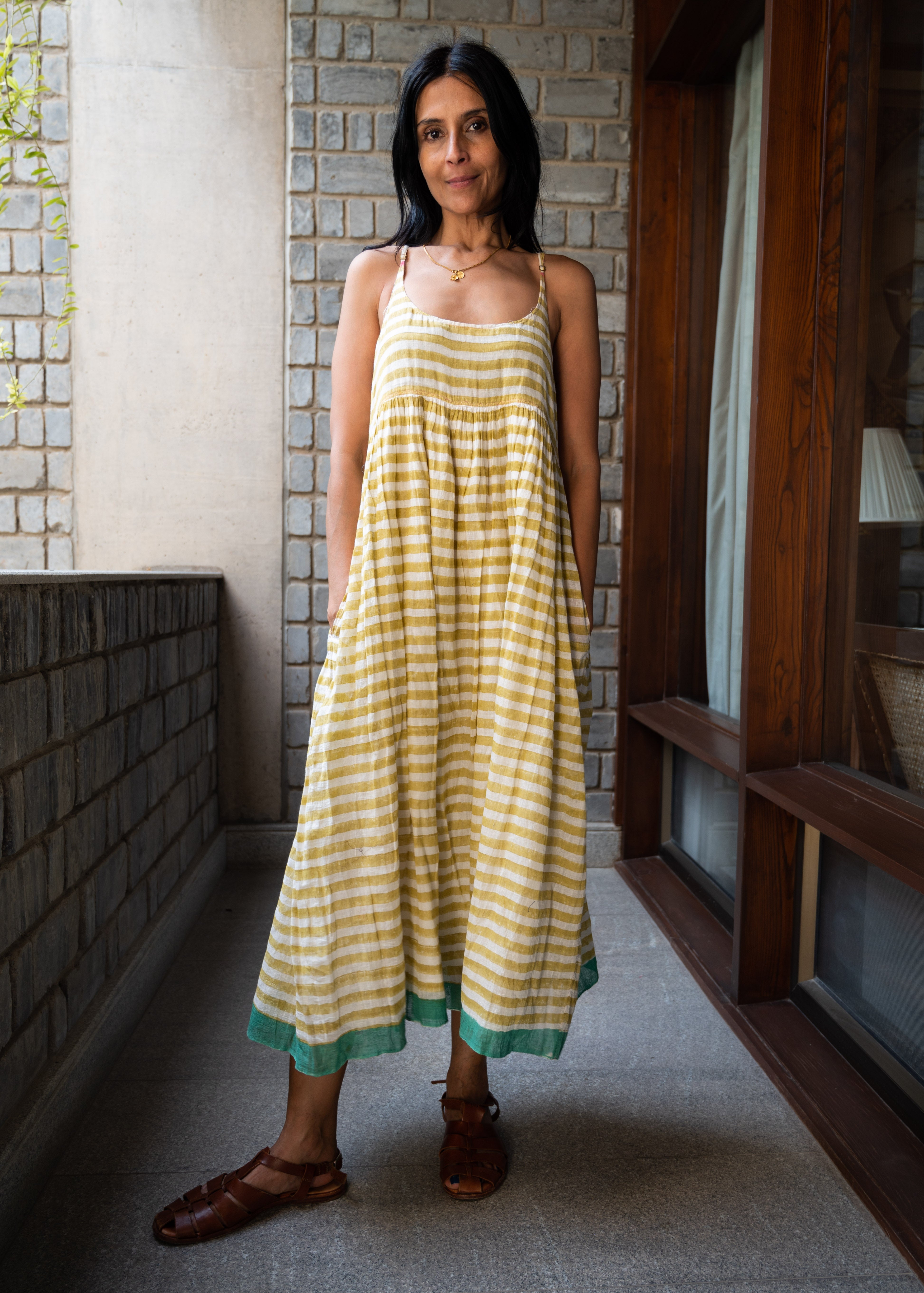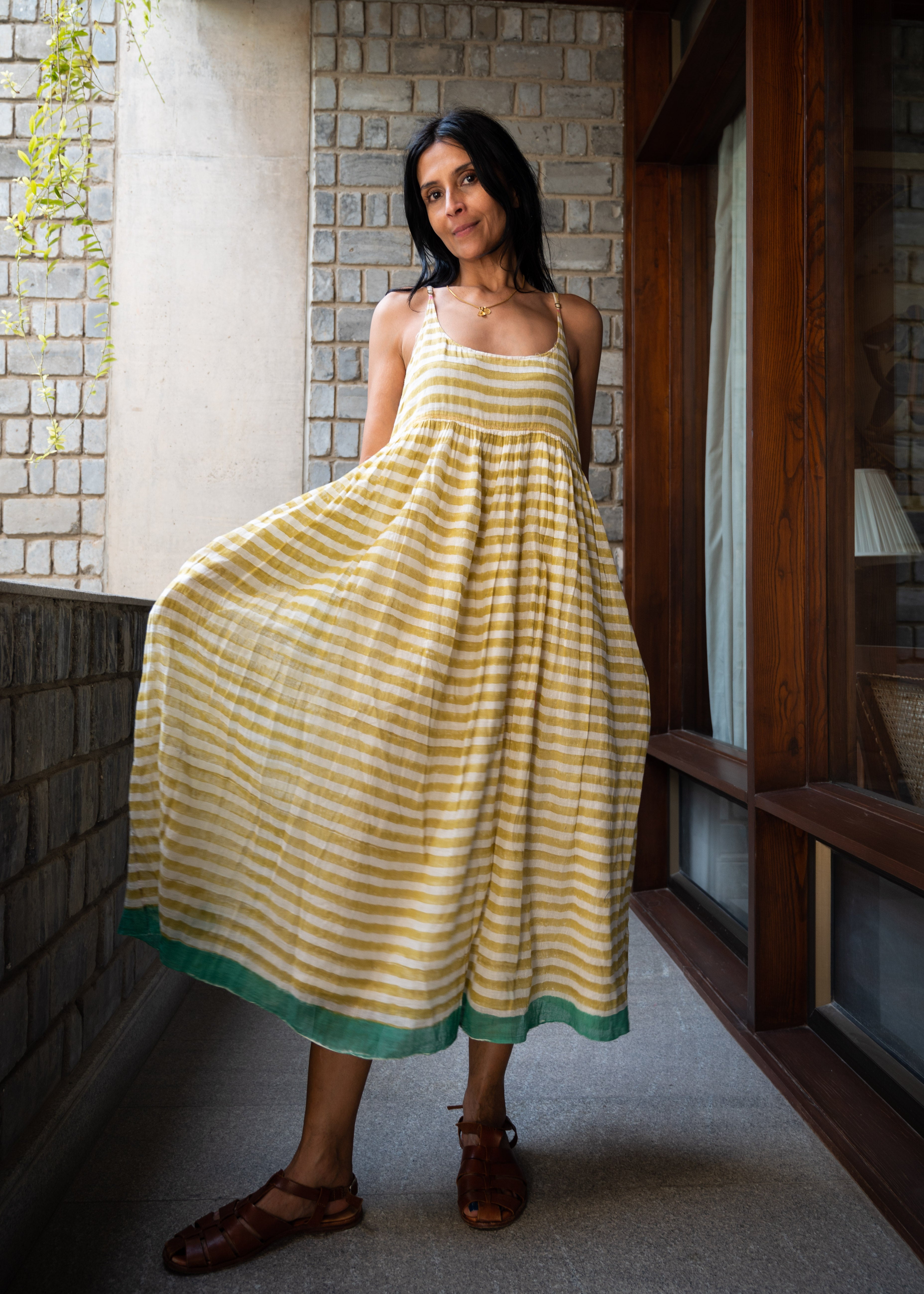 A babydoll style slip dress. Features a round scoop neck with thin adjustable strap detail. Maxi length with ruching under the chest. Handwoven stripe detail through the dress. Lightweight style with inside cotton lining. Side pockets. Contrast green border along hemline.