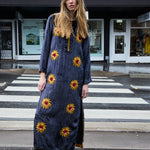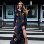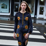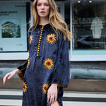 A statement tunic hand embroidered by our local artisans in India. Features hand embroidered sunflowers embellished with beads and sequins. Includes a high round neck with contrast gold piping and front button closure with loops. Piping detail along shoulders, sides, arms, cuffs and hemline.