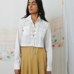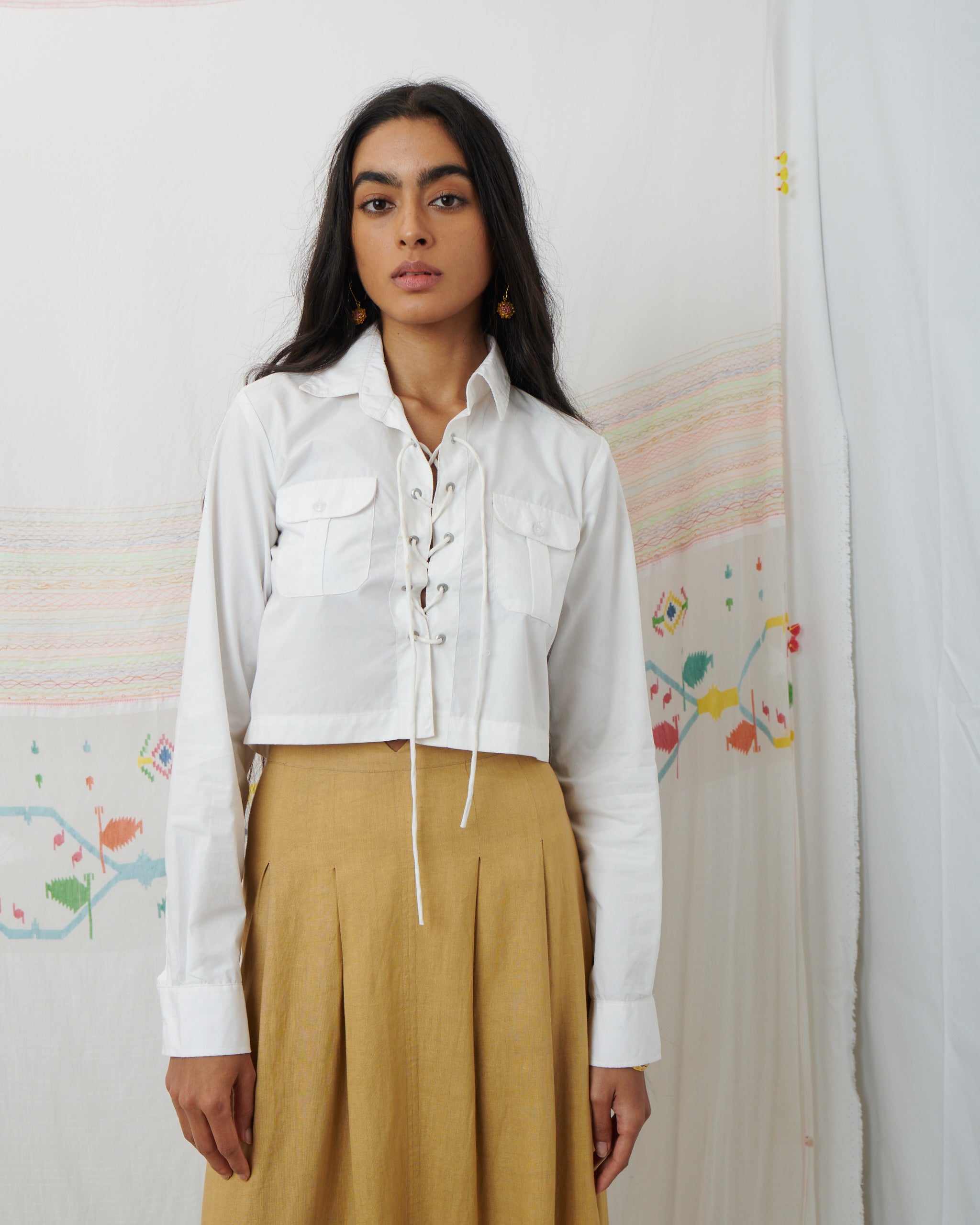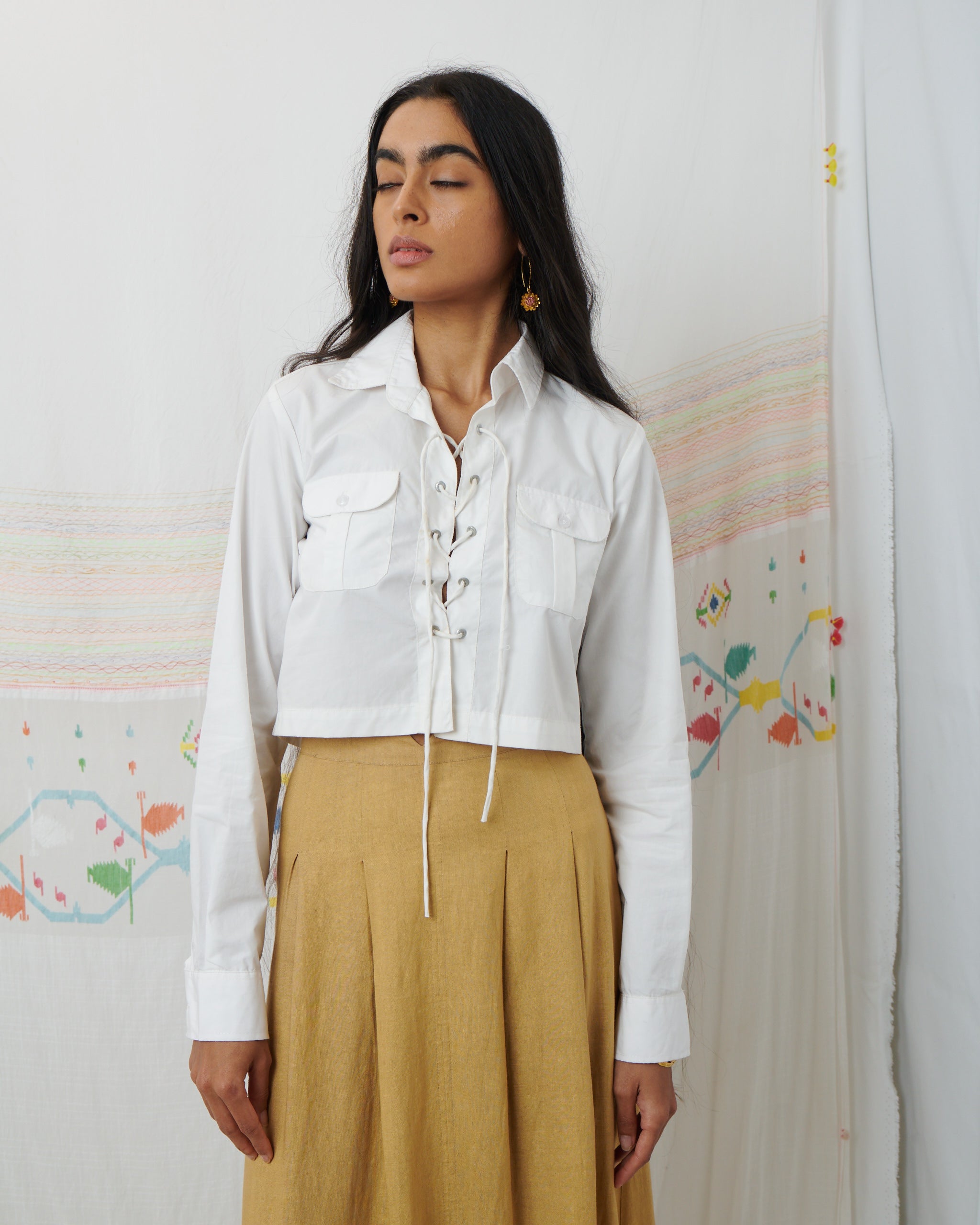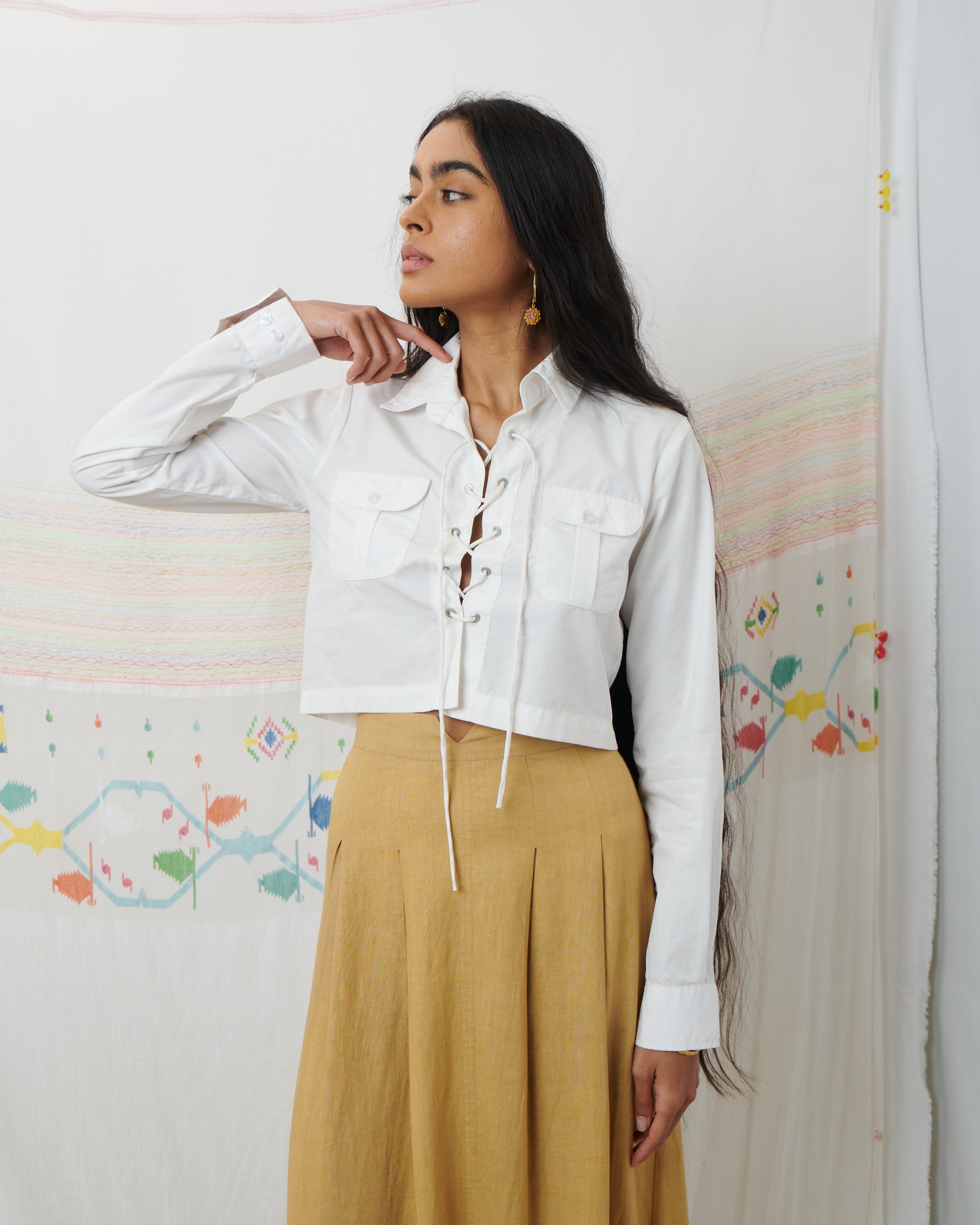 A safari inspired cropped collared long-sleeve shirt. Features front lace-up on bodice detail and buttoned front pockets on either side. Single button cuff.