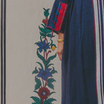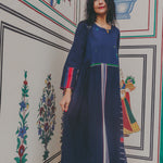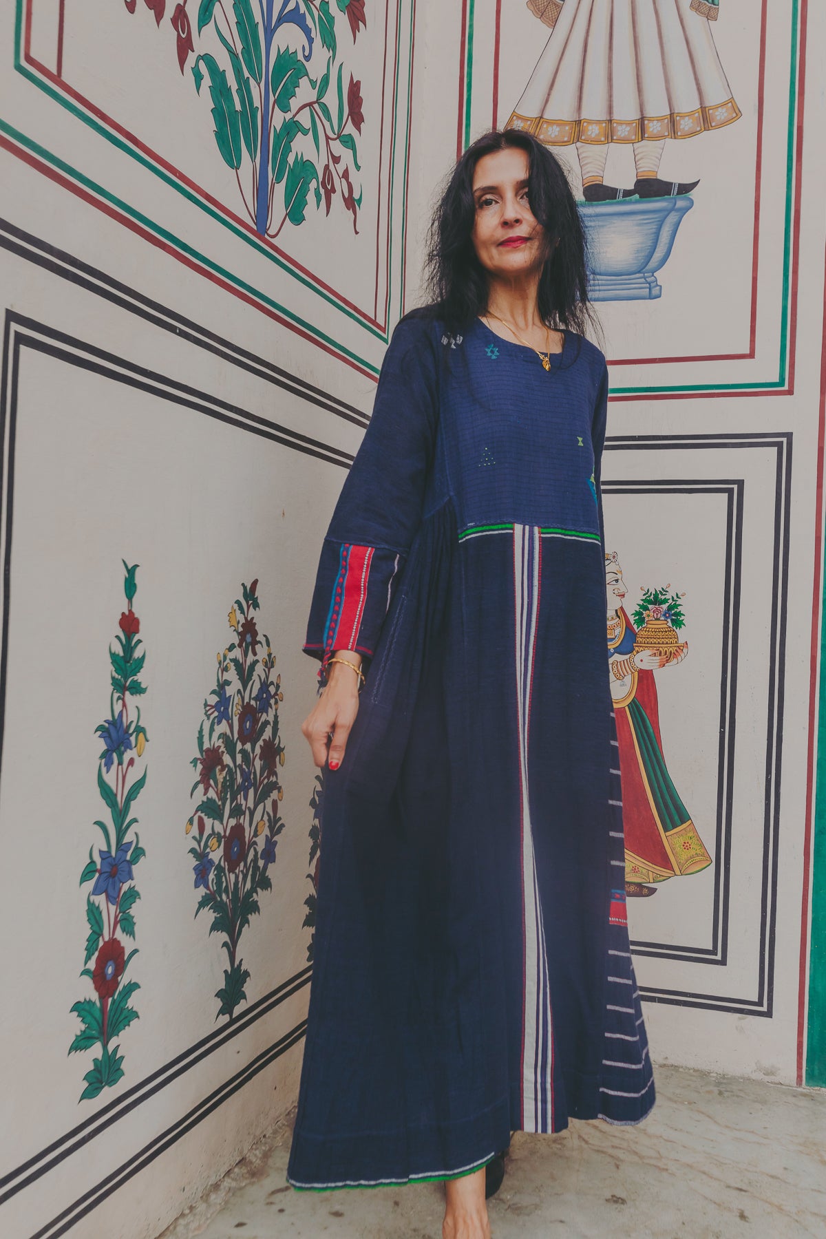 A delicately handwoven 100% cotton maxi dress. A babydoll style with pleat work below waist seam. Features a front round neck with button up back closure. Features all over delicate hand stitch and embroidery patterns through the dress in contrast green and fuchsia along front and back. Pearl button detail. Features contrast stripe panels and selvedge along sleeves and hemline. Side pockets.