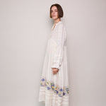 An intricately woven, full sleeved dress. Features a high neck with frill detail and button up front with pearl buttons and neon yellow loops. A baby doll style with pleat detail below chest on front and back. A statement woven jamdani patterned panel and multiple pleats along hem. Woven polkas on bodice. Intricate belle sleeve with multiple pleats and adjustable ties and flare silk cuffs. Side pockets.