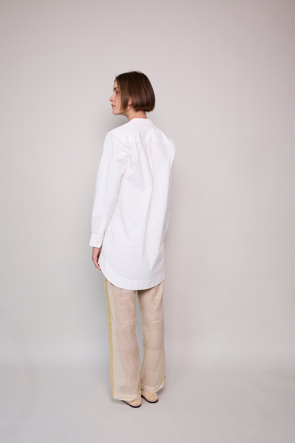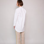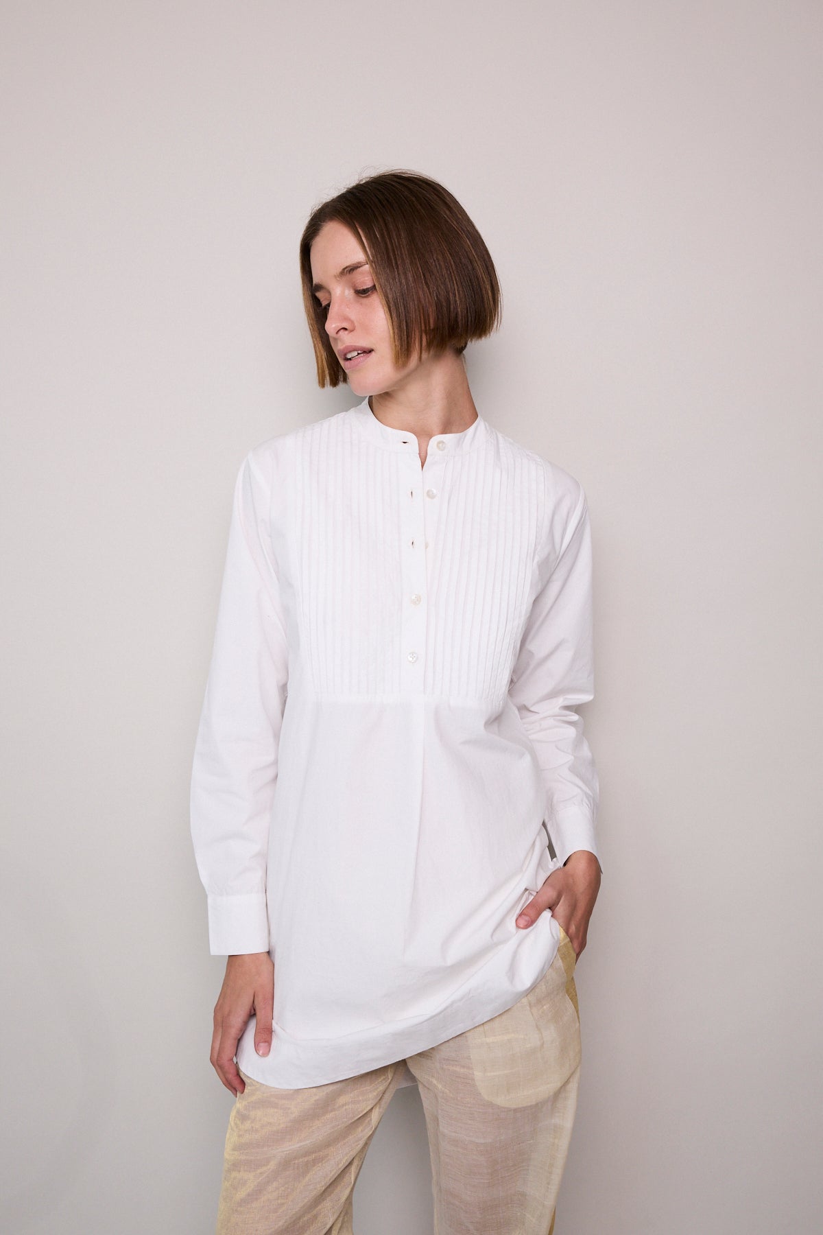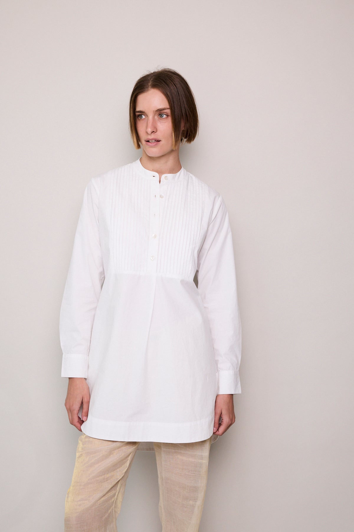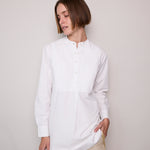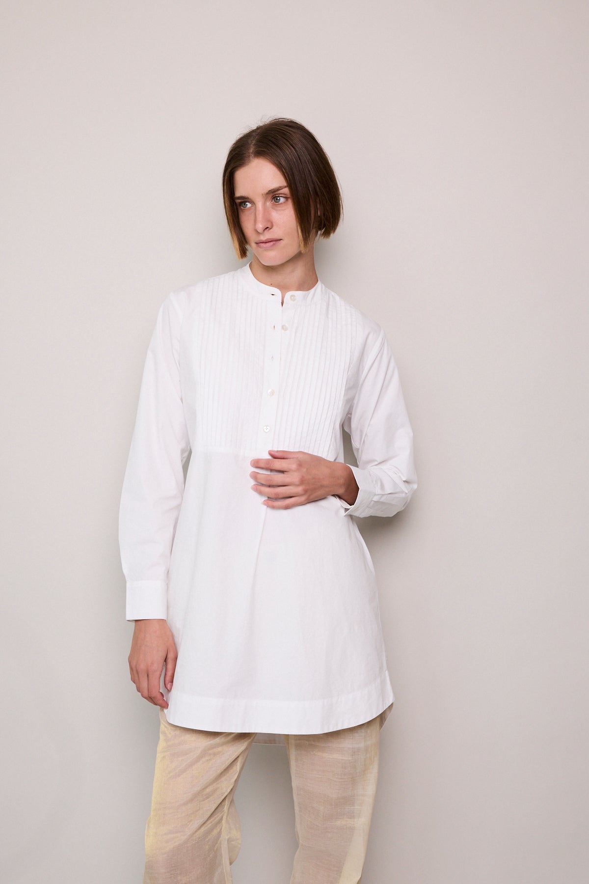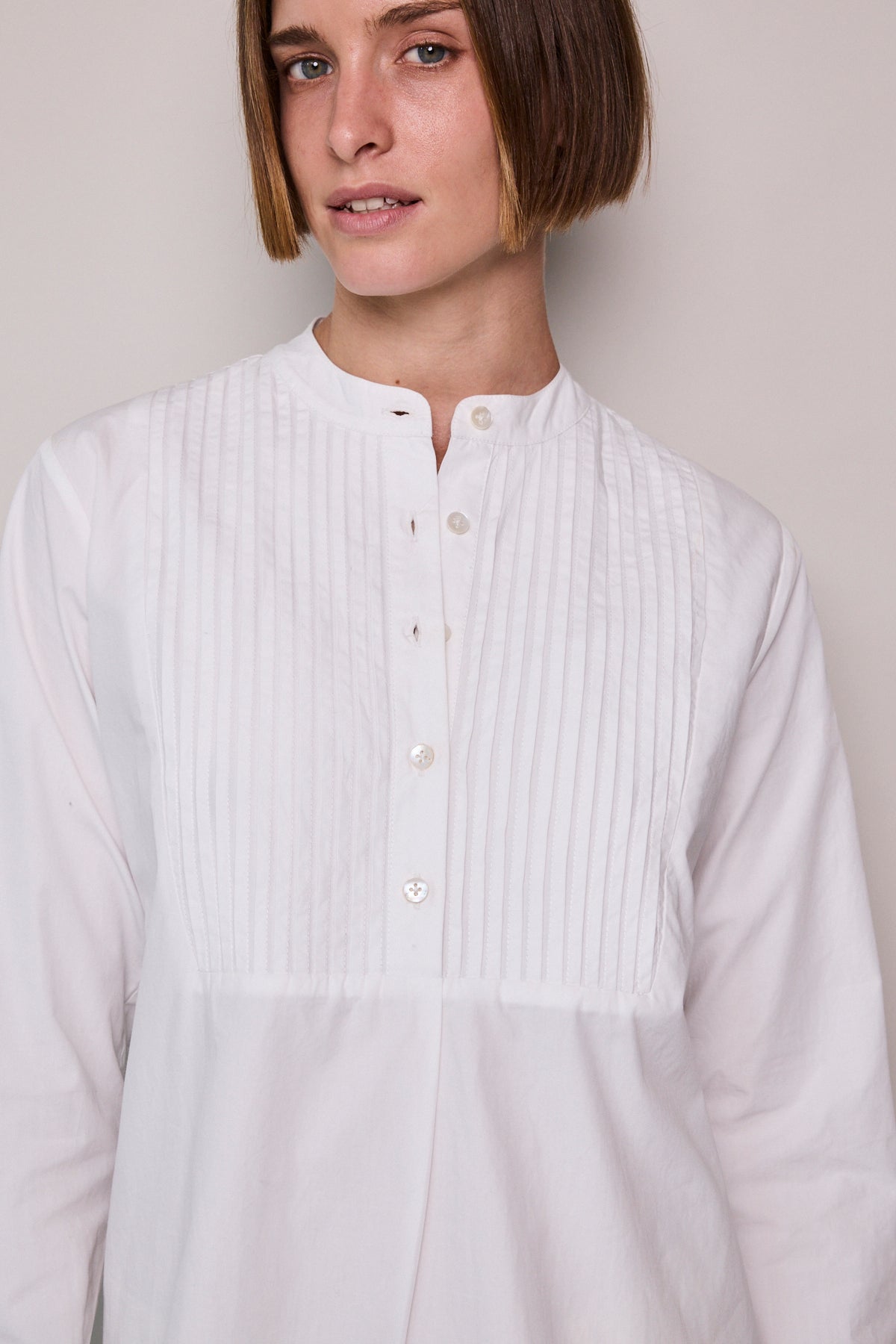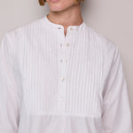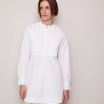 A classic white cotton poplin shirt with intricate front pleated yoke detail. A high collared neck with pearl button closure. A gentle flare out from the waist, finished with a rounded double hem. Long-sleeved with cuffs that feature a single button closure.