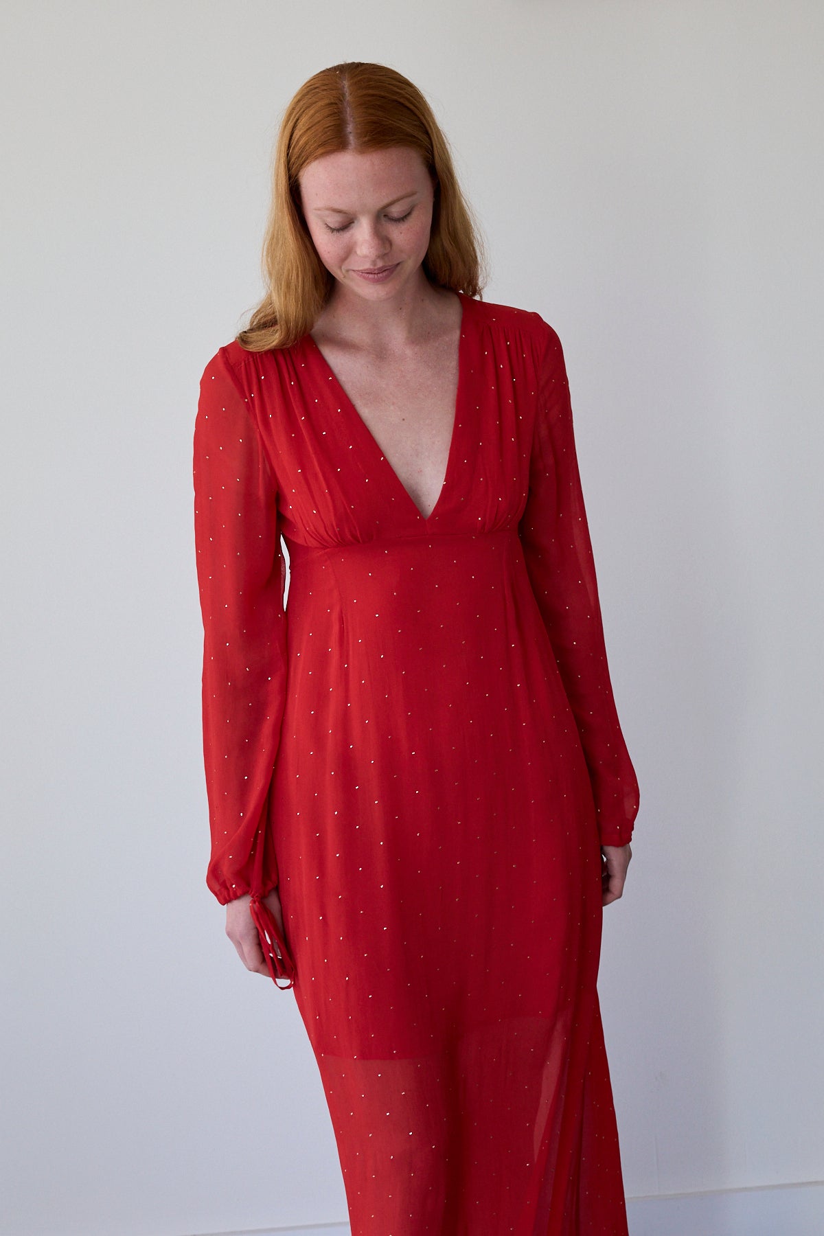 A maxi length dress featuring mukeish hand embroidery silver stars through. A front V neck with ruching detail on shoulders and below waist seam. Bodice fully lined in voile. Ties for fastening and adjusting sleeve length on cuff. Side zipper. Side pockets.