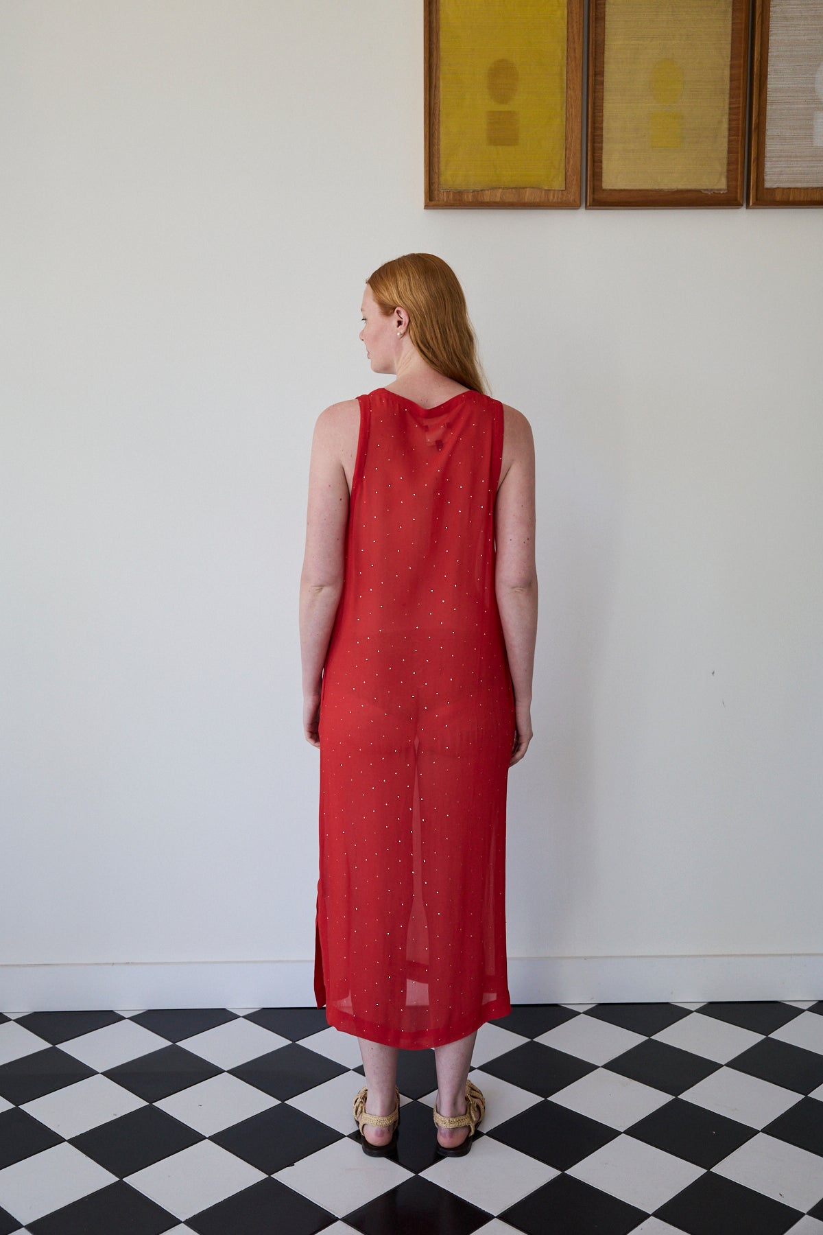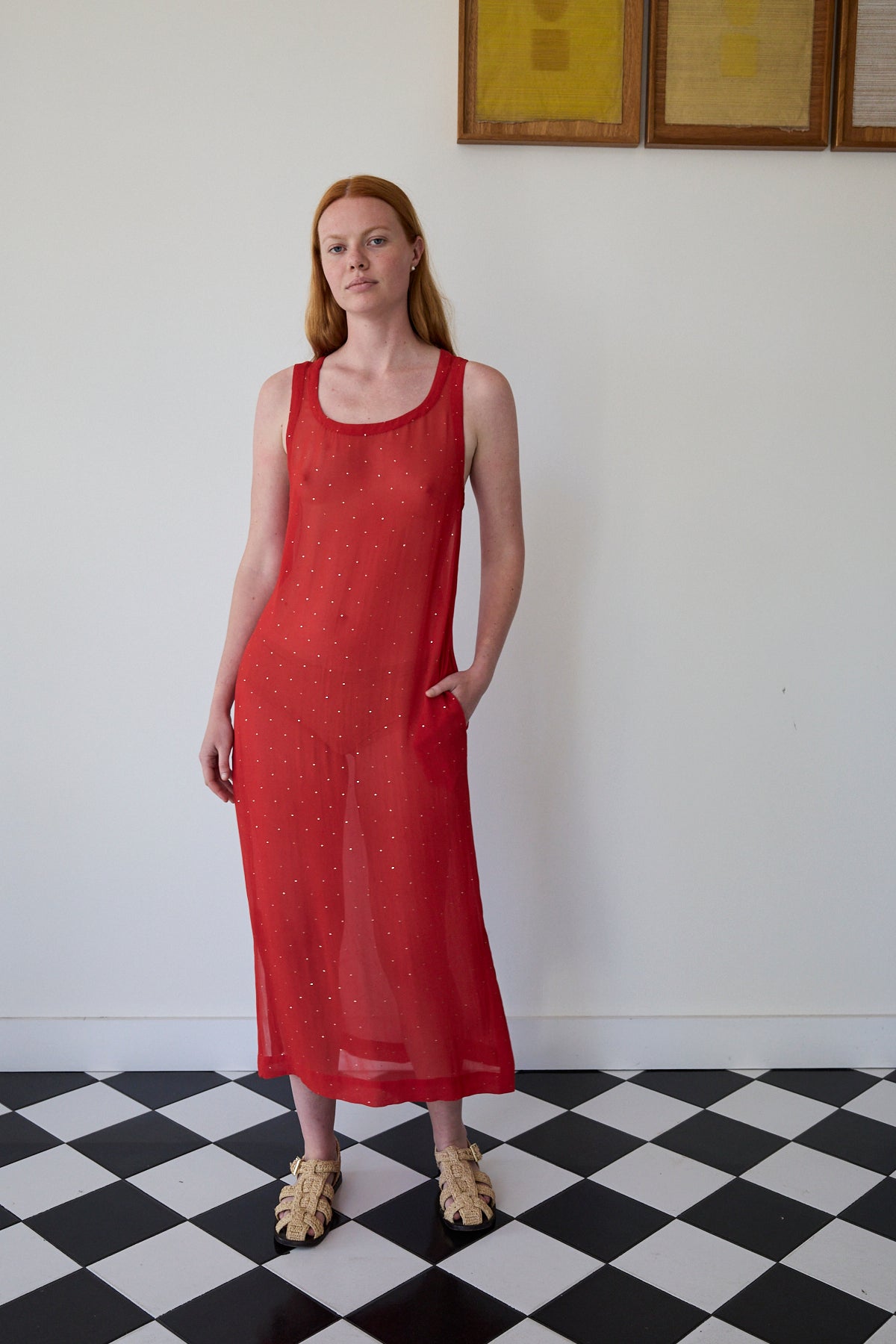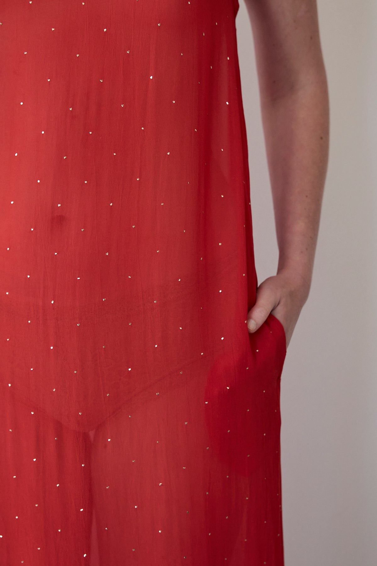 A midlength tank style dress featuring mukeish hand embroidery silver stars through. Straight cut with side pockets. Sleeveless with side slits. A sheer finish.