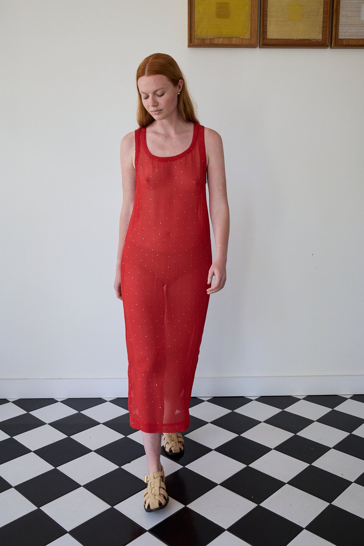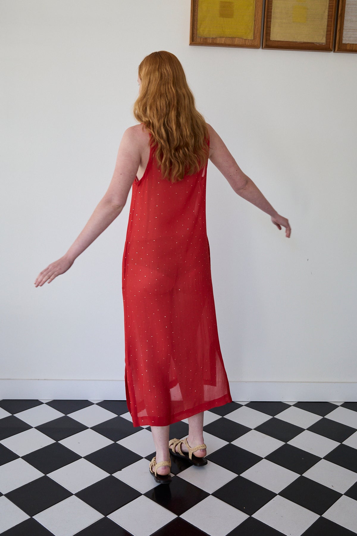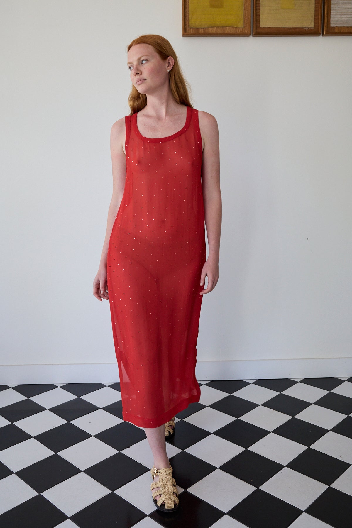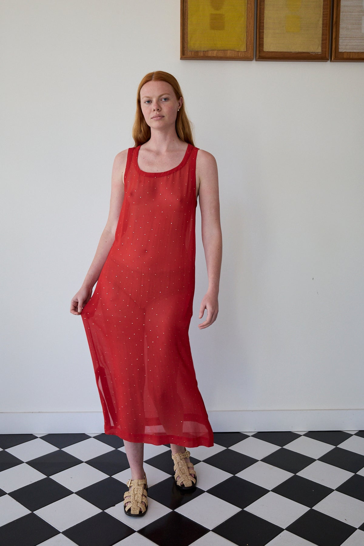 A midlength tank style dress featuring mukeish hand embroidery silver stars through. Straight cut with side pockets. Sleeveless with side slits. A sheer finish.