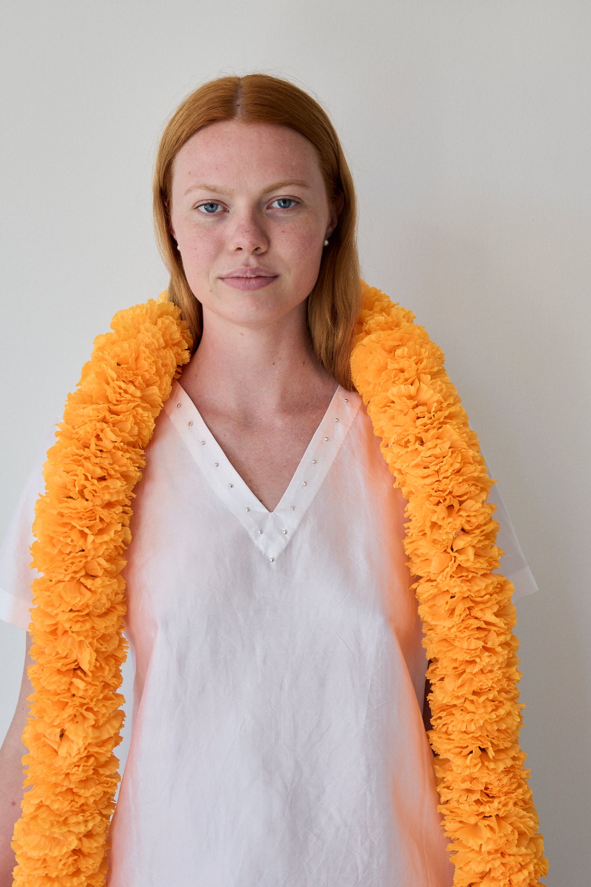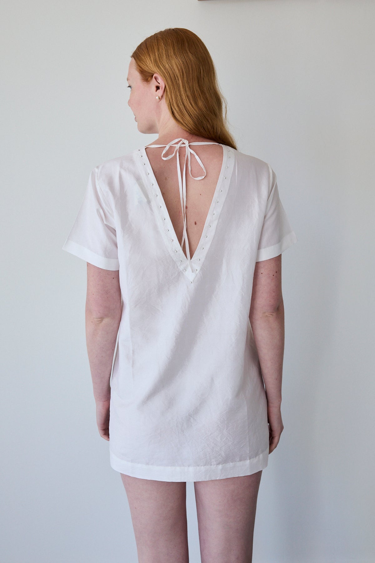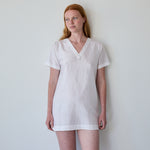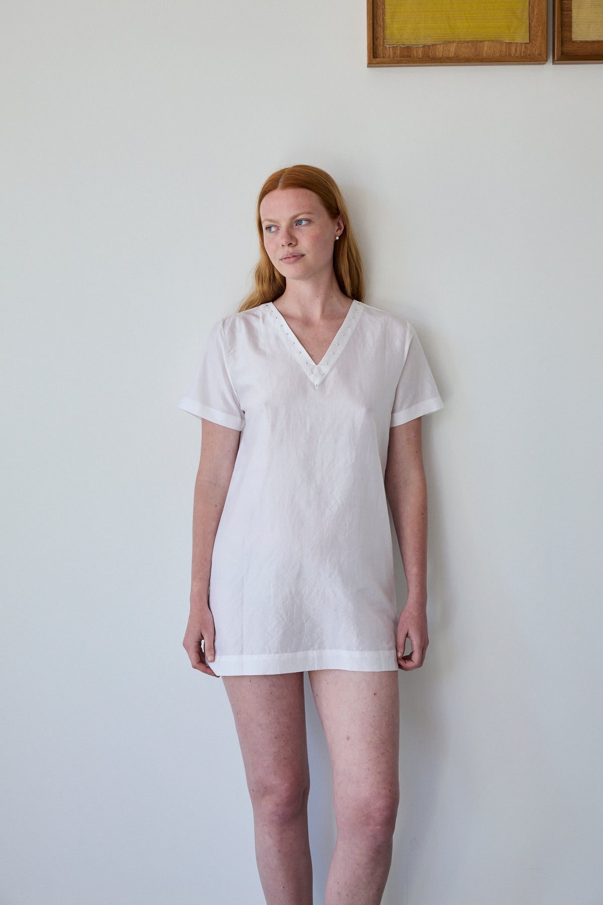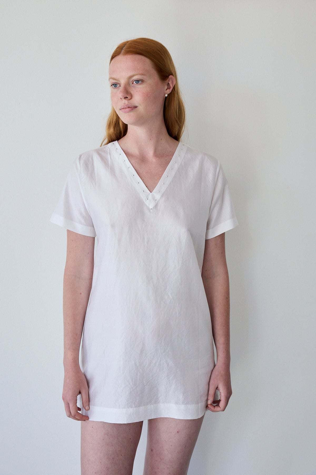 A short sleeved raw silk swing dress. A-line. Features a front V neck and open back V neck with ties for fastening. Hand embroidery studs along neckline. Can be worn over pants.