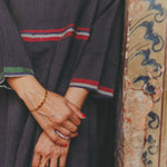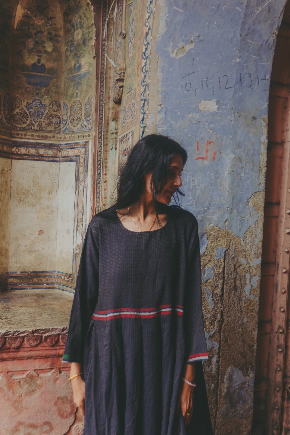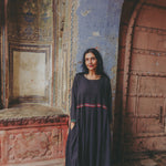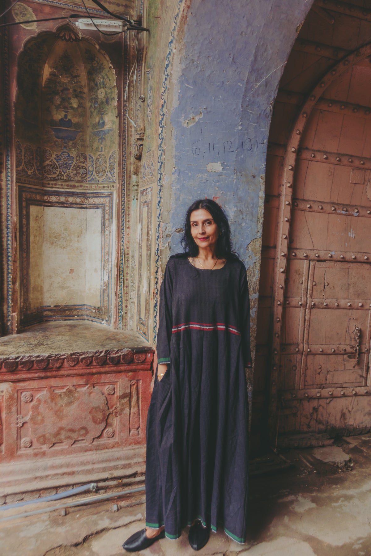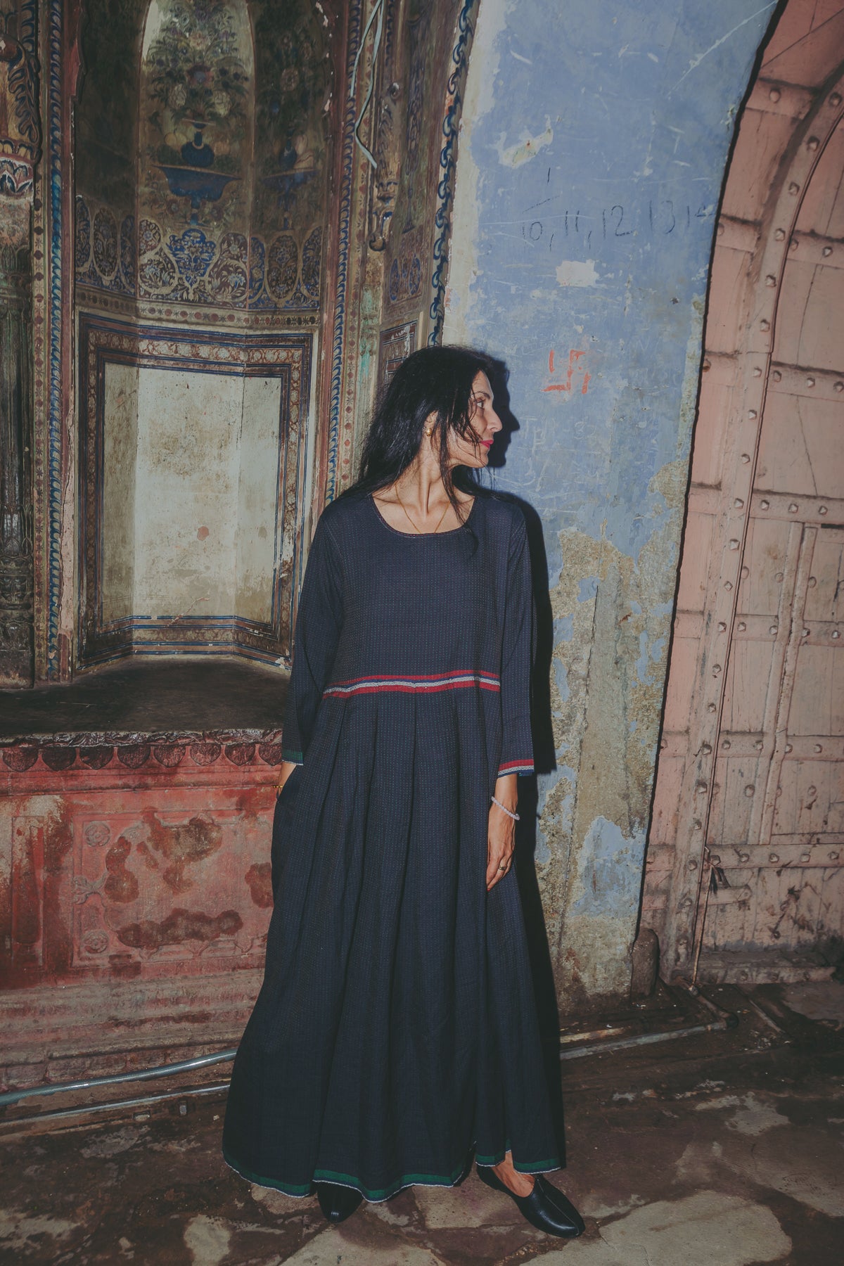 A delicately handwoven 100% wool maxi dress. A high round neck with contrast pink stitch along neckline. A babydoll cut with pleat work below chest. Features all over delicate handstitch through the dress in contrast light green. Button up fastening with pink loop detail at the back. Pearl button detail. Features red, green and ivory stripe border panel along sleeve, waist, hemline and side pleats.