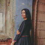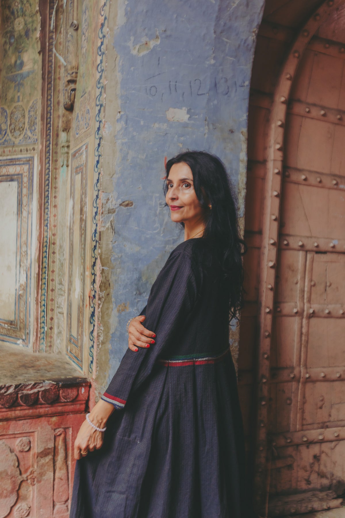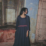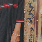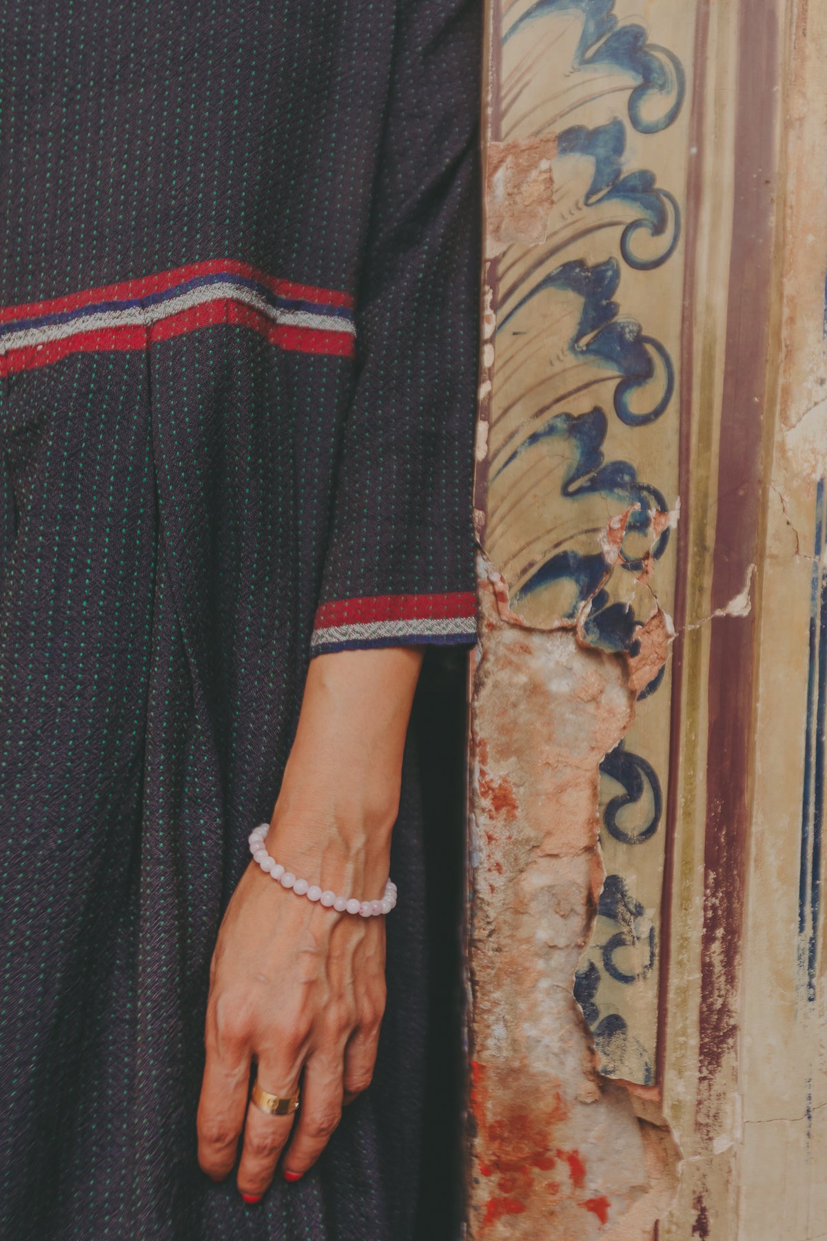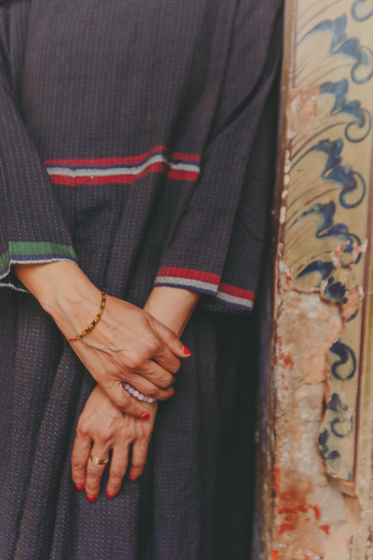 A delicately handwoven 100% wool maxi dress. A high round neck with contrast pink stitch along neckline. A babydoll cut with pleat work below chest. Features all over delicate handstitch through the dress in contrast light green. Button up fastening with pink loop detail at the back. Pearl button detail. Features red, green and ivory stripe border panel along sleeve, waist, hemline and side pleats.