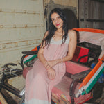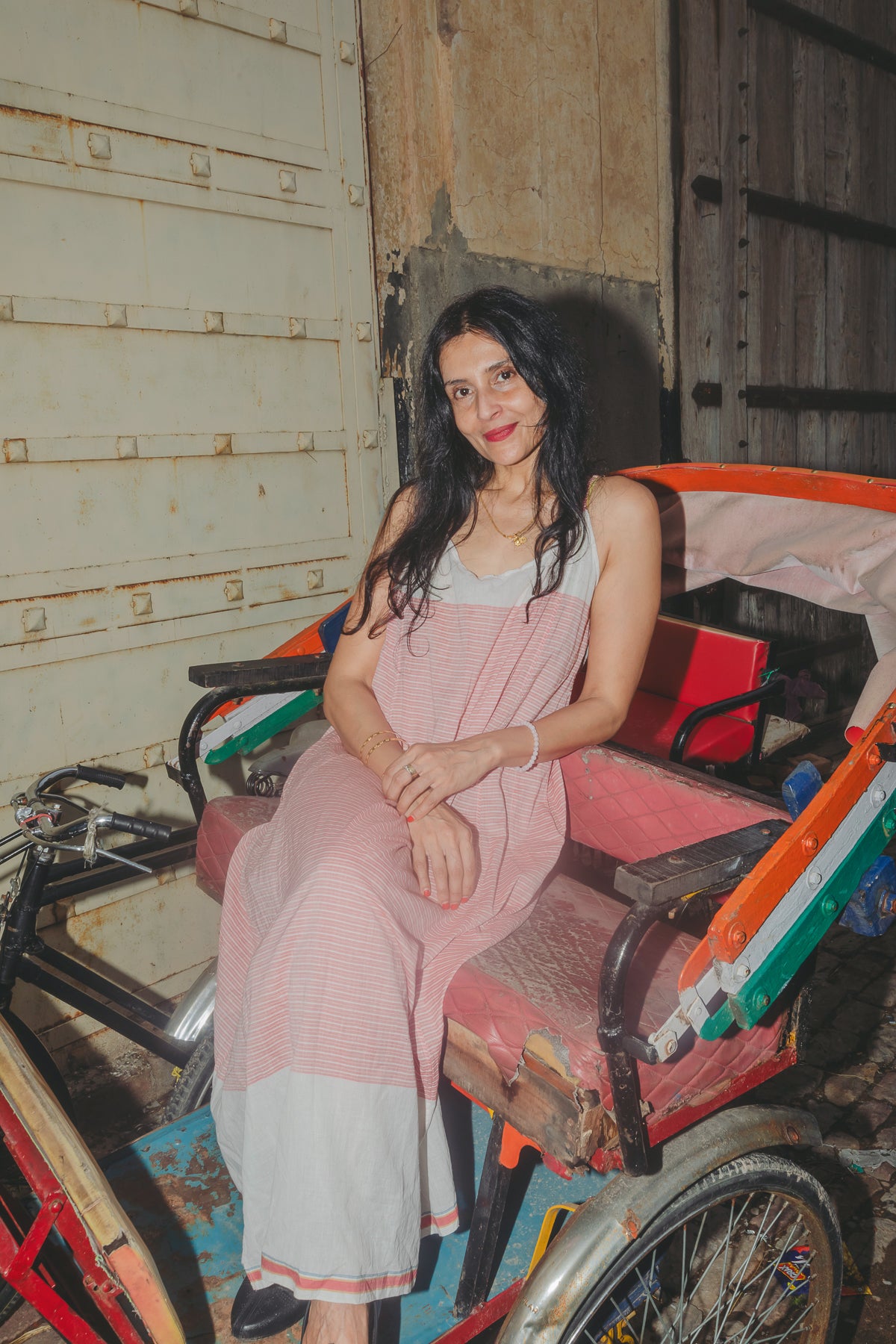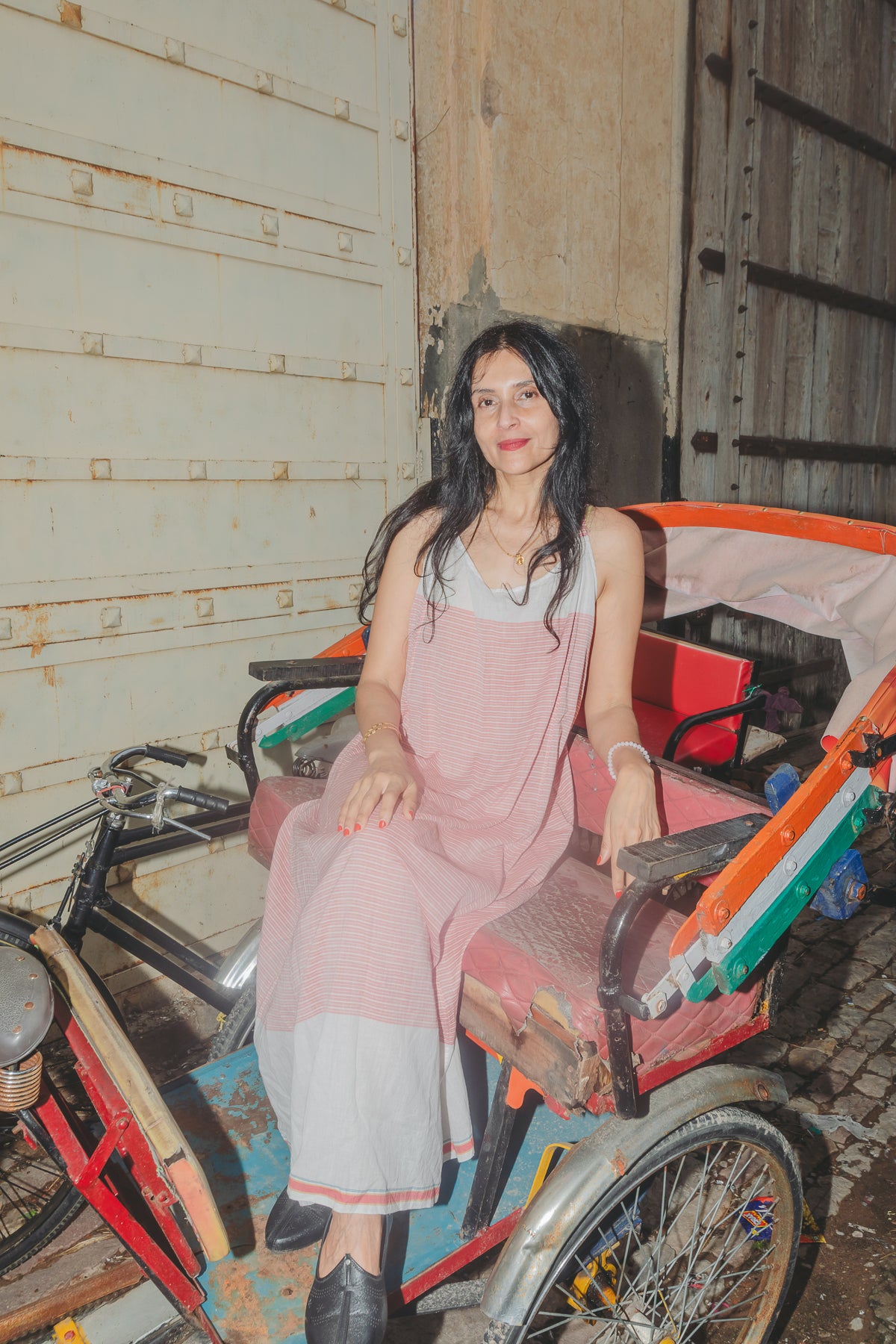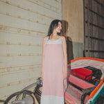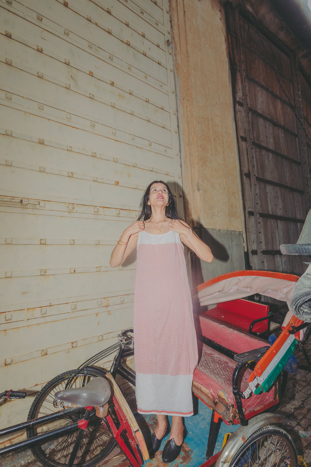 A slip dress. A-line. Features a front U neck and straight back, with thin adjustable strap detail. Handwoven red and white stripes through the slip with selvedge along hem and back panel. Maxi length.