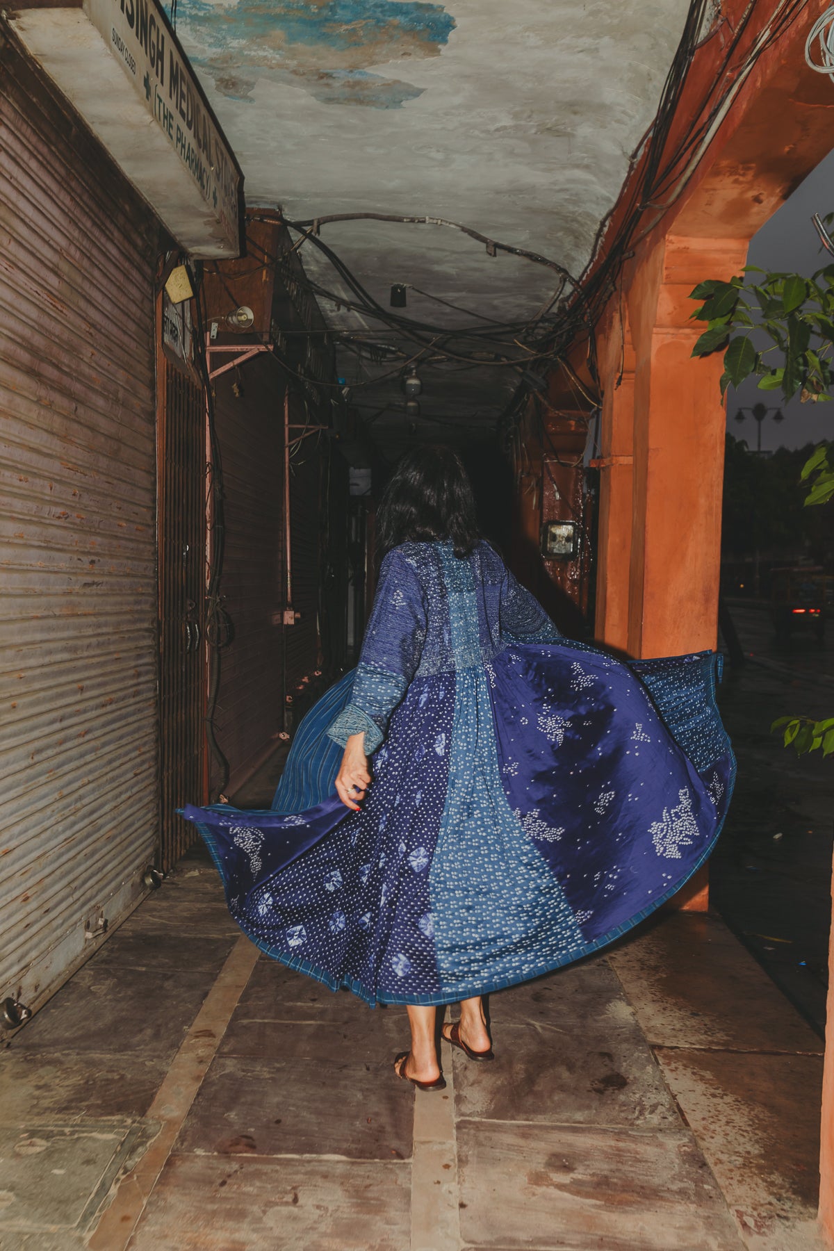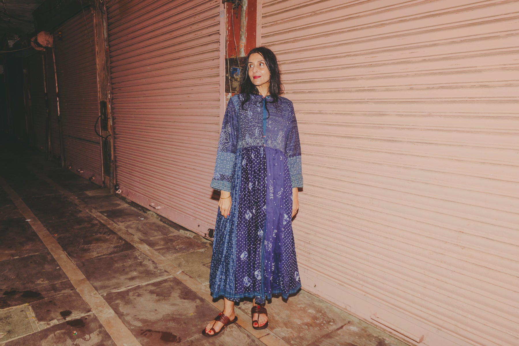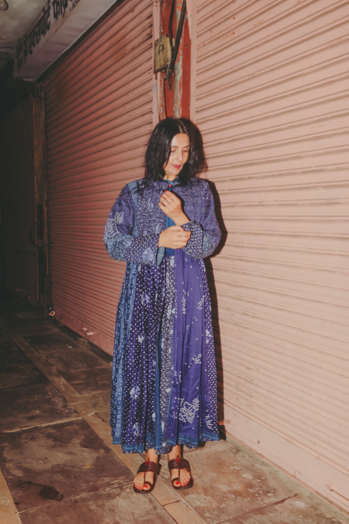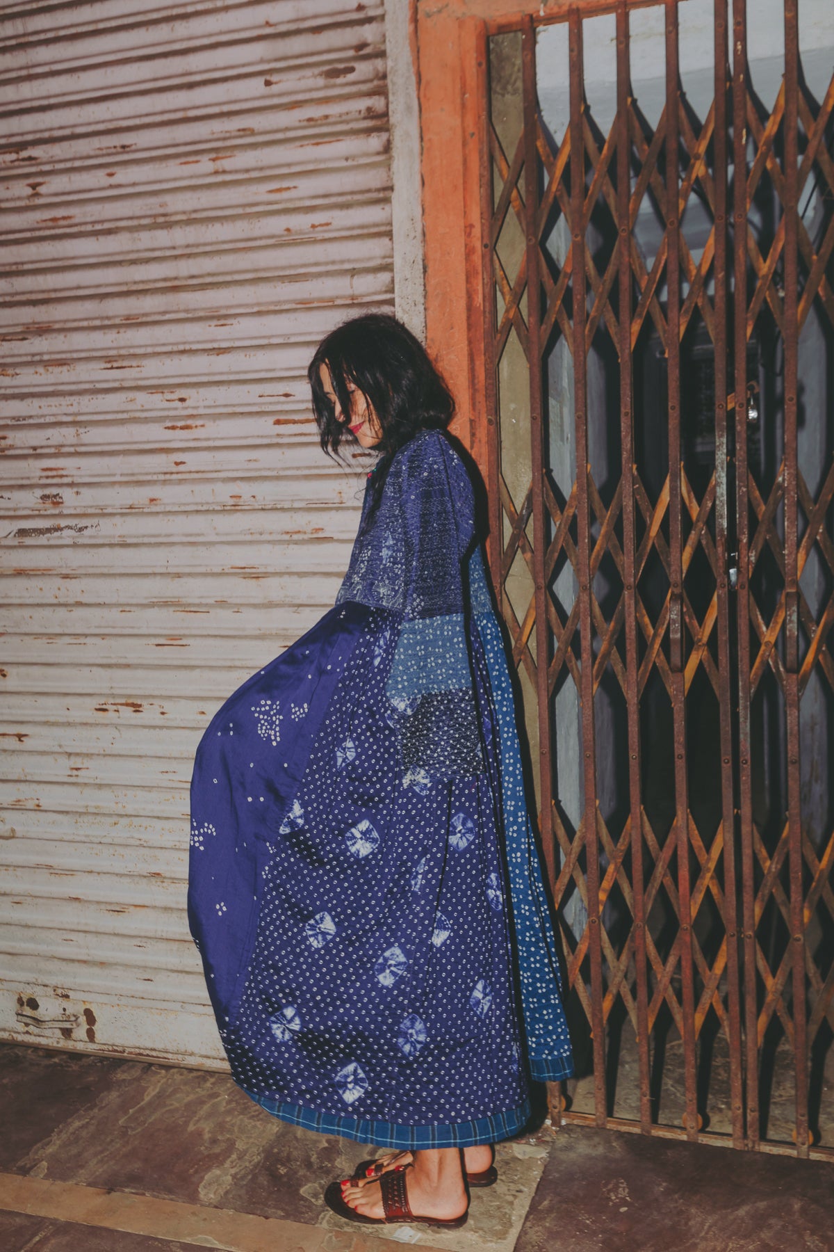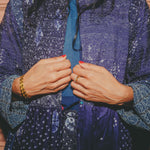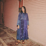 A beautifully crafted handwoven coat dress. Features a high round neck with contrast fuchsia loop and silver metal button fastening. Pieced together in multiple panels of indigo and intricate hand tie&dye bandhini in varying sizes fully through the garment. Embroidered ruching detail along top front and back with fully embroidered yoke and sleeves. A babydoll style, circle cut with voluminous pleats and panels. Double layered and fully lined. Concealed side slit pockets. A reversible, layering style. To be worn on it's own or styles over as a coat.
