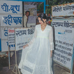 An intricately made handwoven cotton dress. Features a front V-neck with lime green and blue embroidery smocking on bodice. Detailed chikan hand-embroidery panels along front and back, sides and sleeve in white. Interlock embroidery through the dress and sleeves. Side slit pockets. Maxi length. Sheer finish.