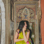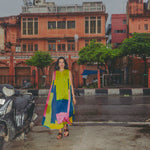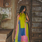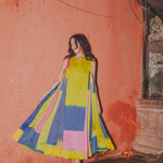 An A-line sleeveless dress. A high neck with metallic button closure. Features ombre tie&dye in contrast mutlicolor cobalt blue, green, lime, purple and pink through the dress. Side pleat detail under armhole. Side pockets. A sheer and delicate finish.