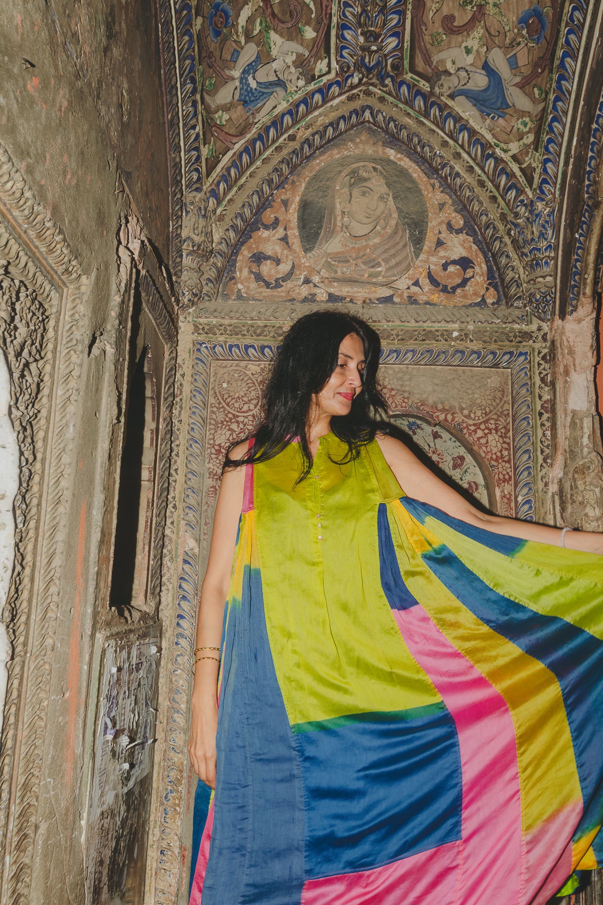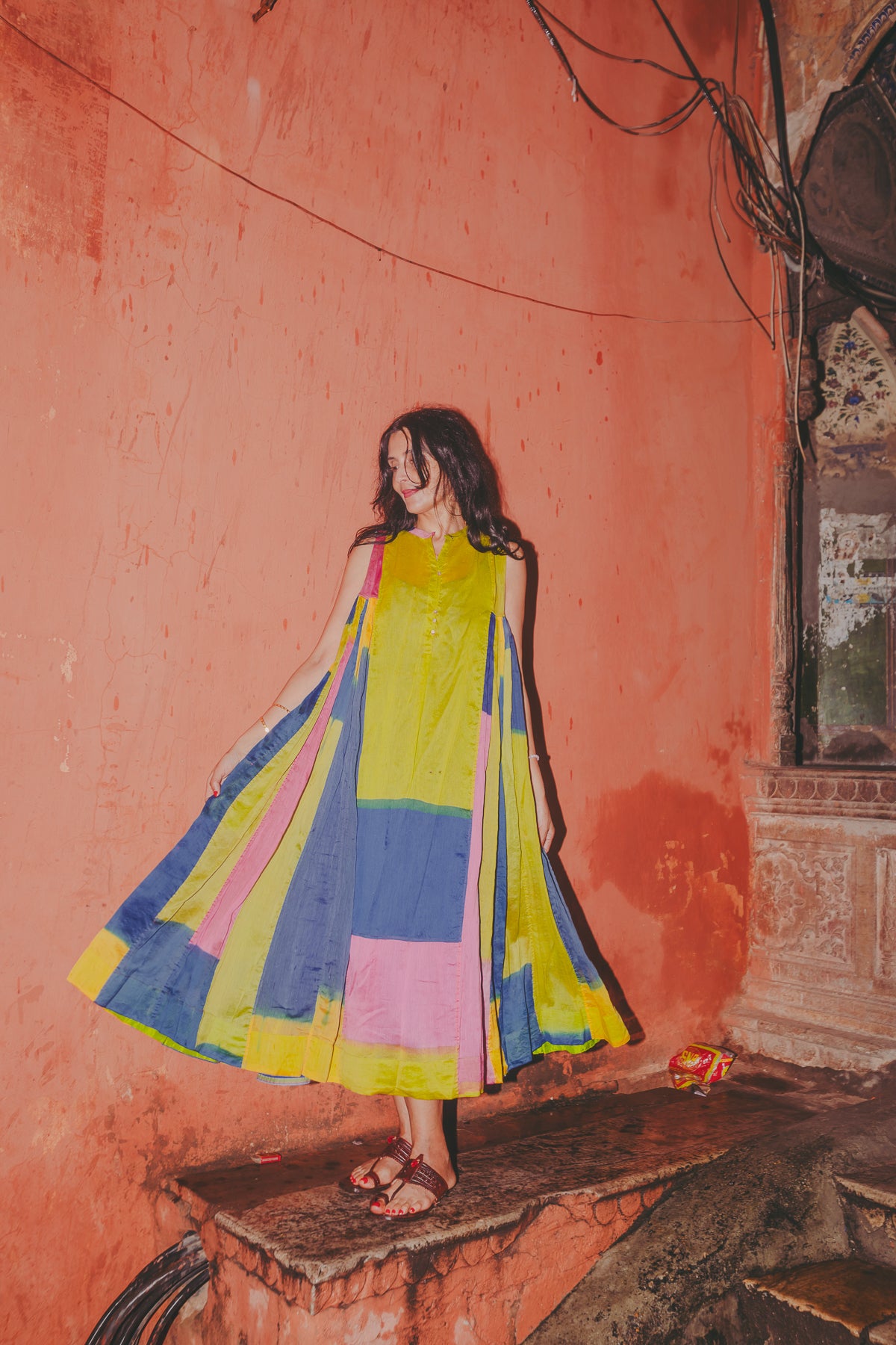 RAINBOW DRESS SLEEVELESS, GOLD // MULTICOLOR SILK