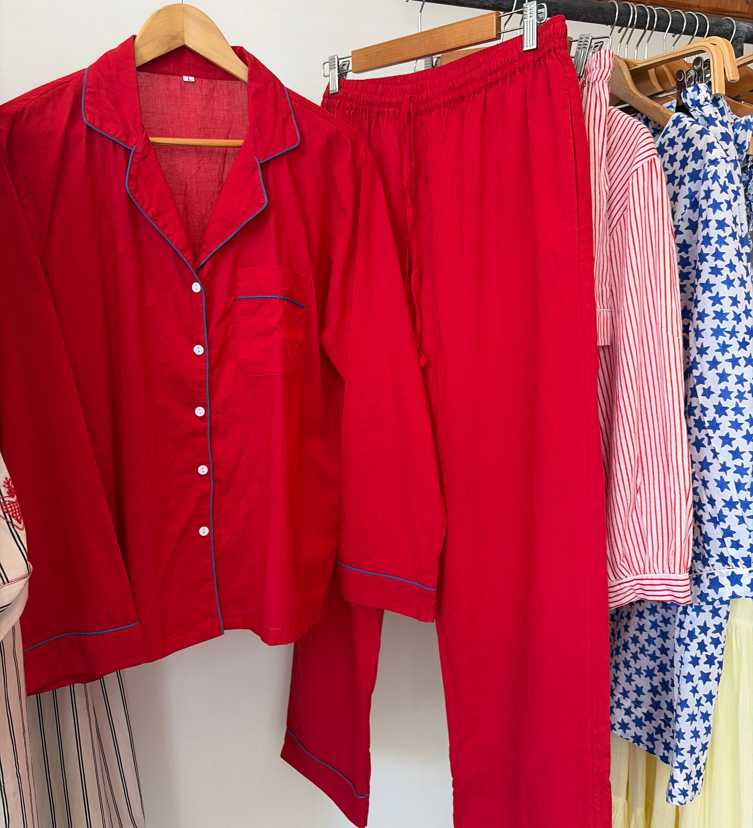 SCARLET PANTS, CRIMSON RED // ROYAL BLUE CHECK COTTON