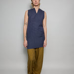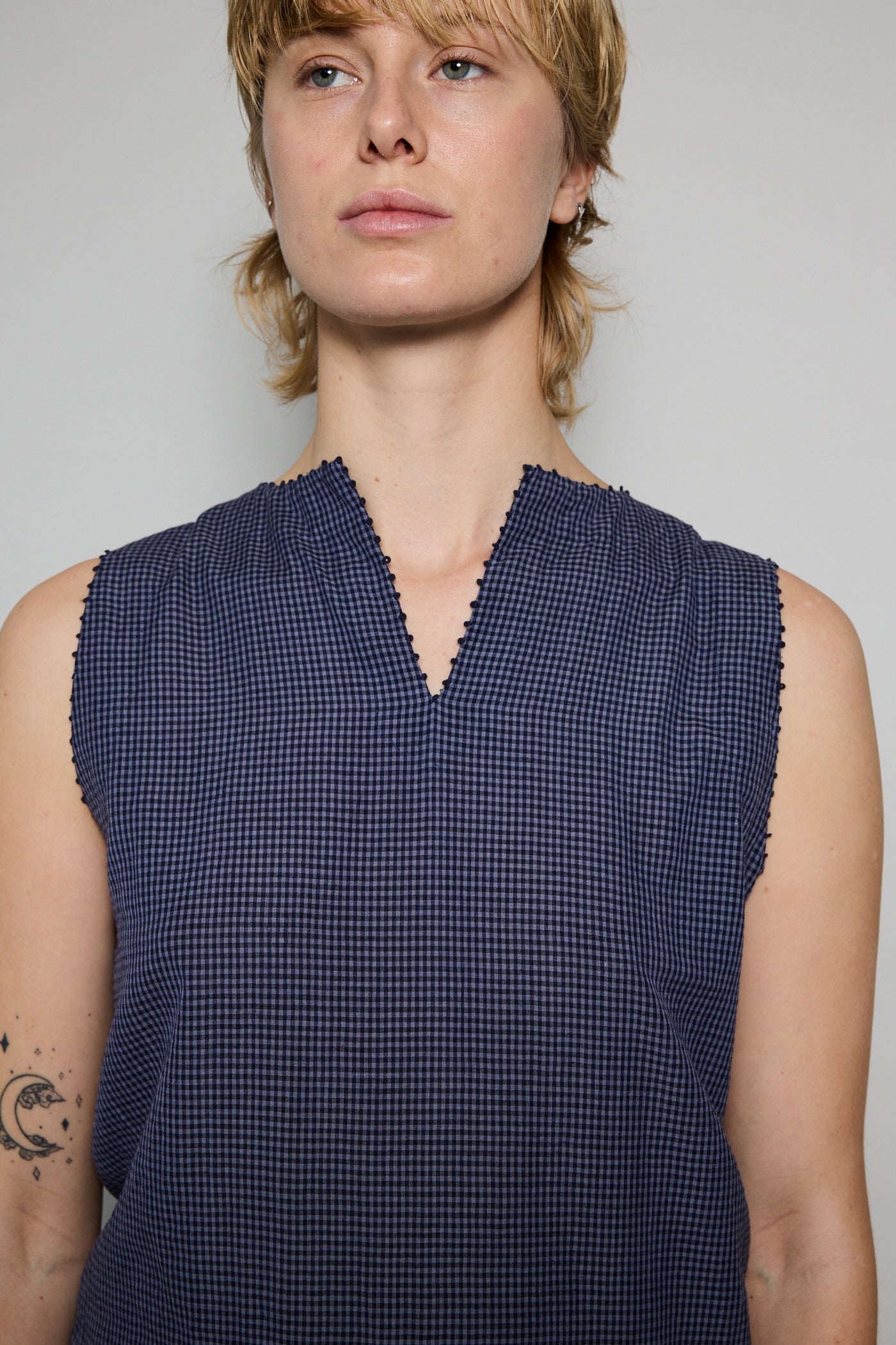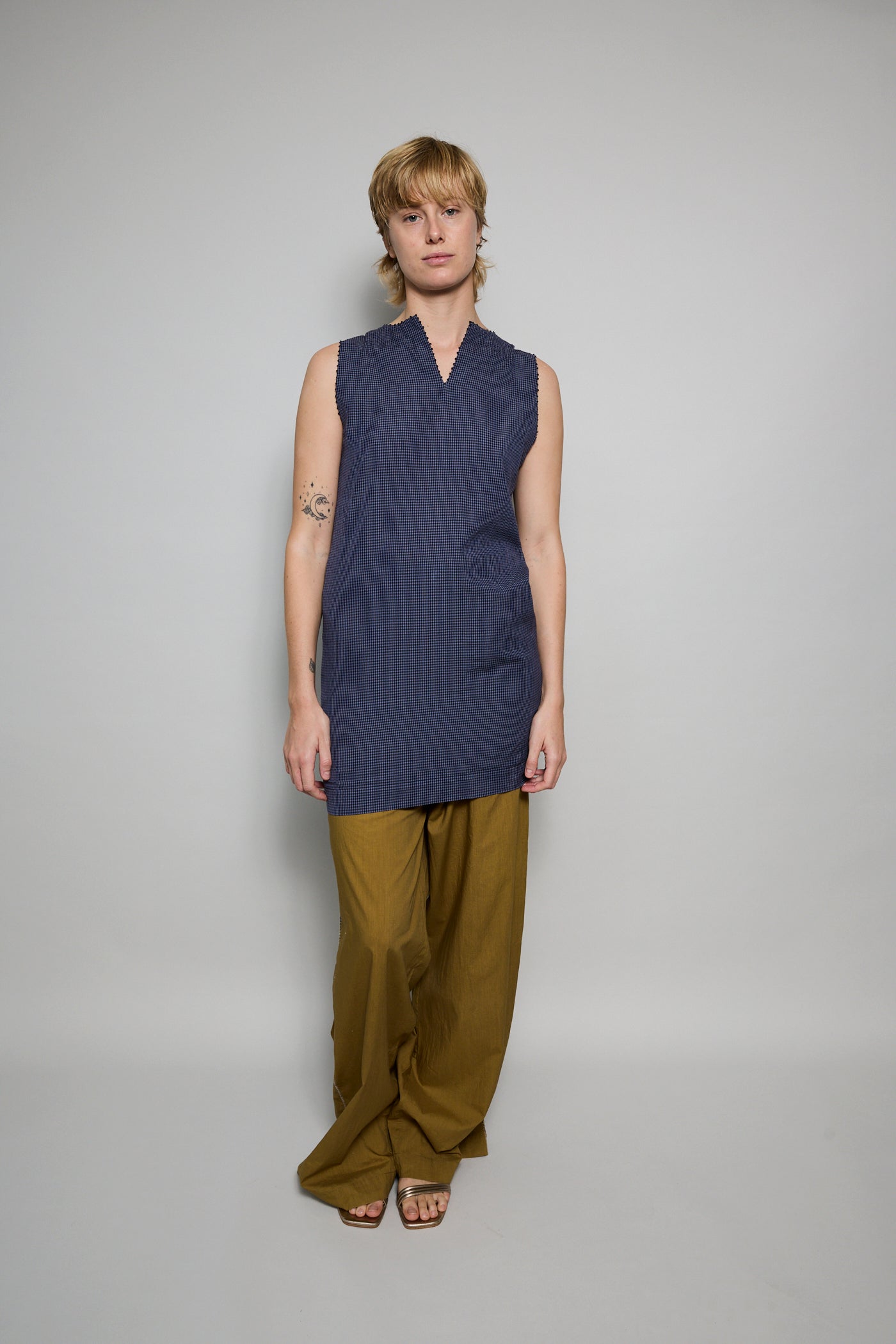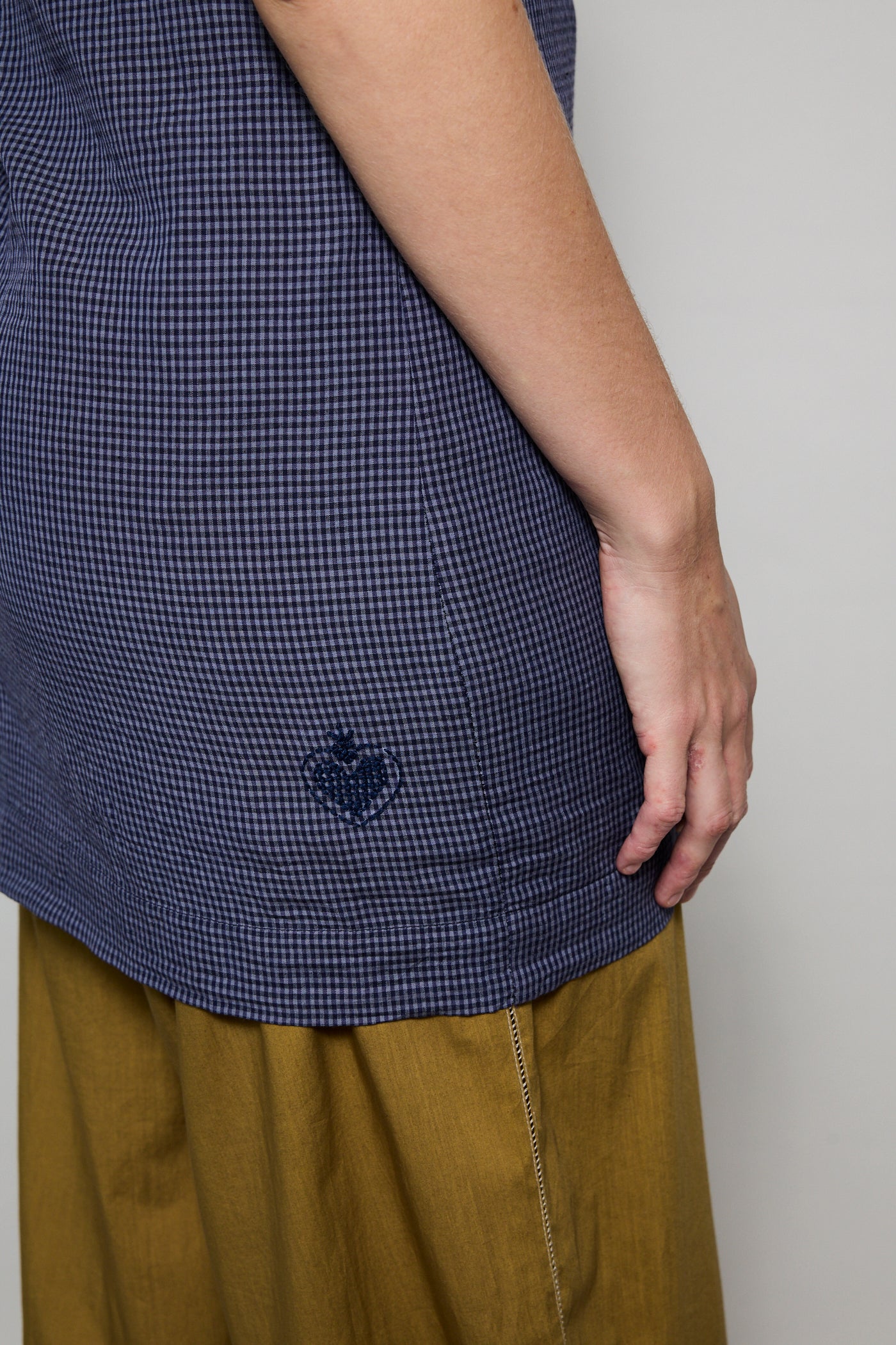 A classic A-line swing dress, featuring high round neck with navy embroidery detail along neck and armholes. Handwoven navy gingham checkered through the dress. A soft and lightweight finish. To be worn as a dress or layered over pants.