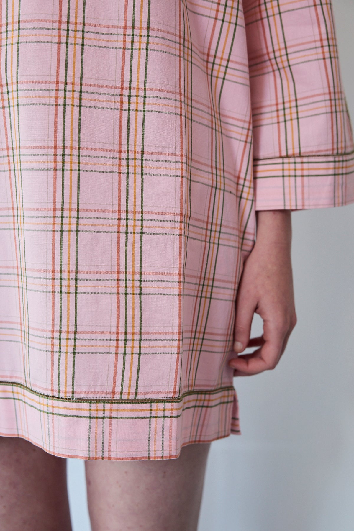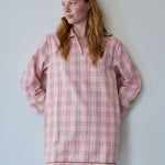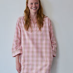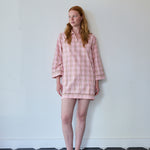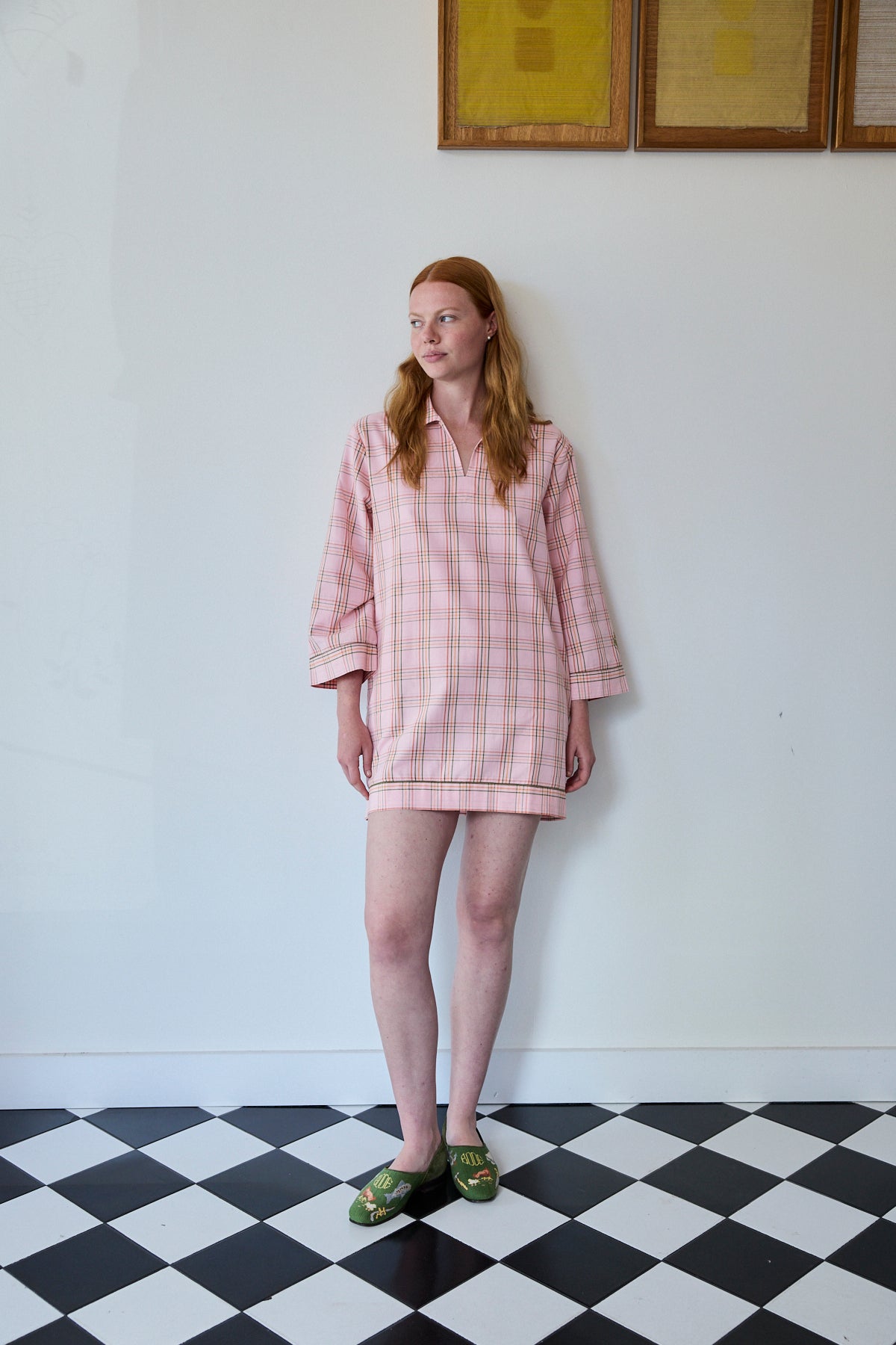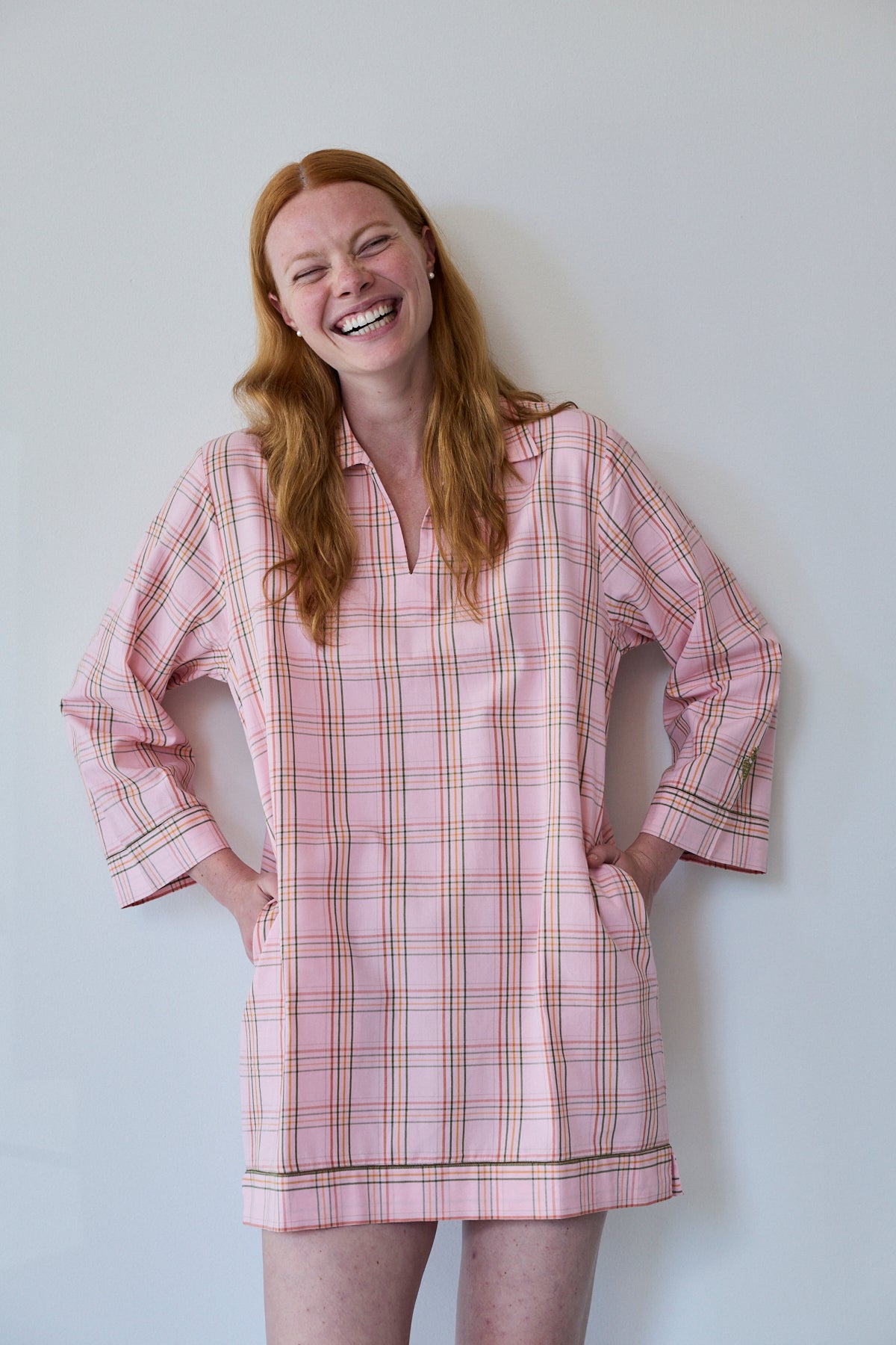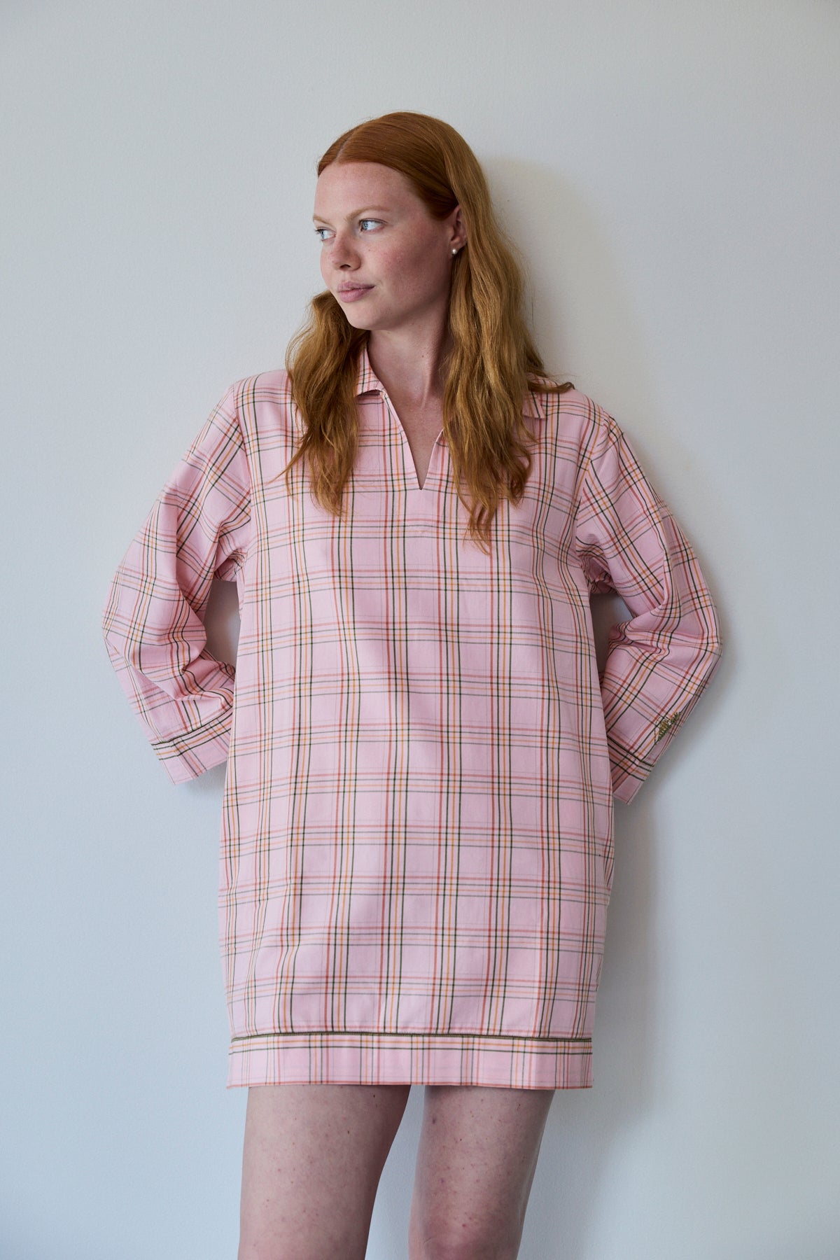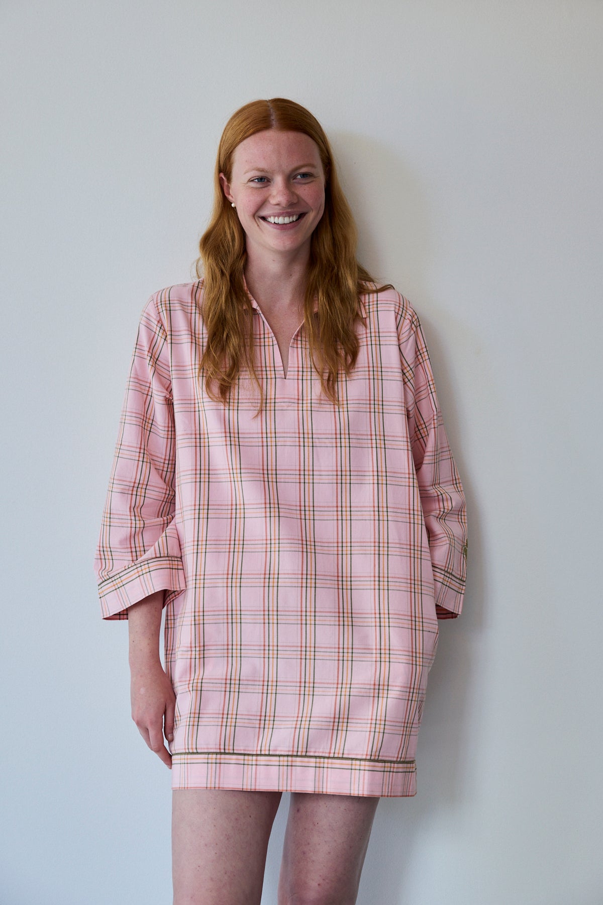 A mini tunic crafted from handloom cotton. Features front collar with pink check detail through. A straight cut with side slits and side pockets. Our signature heart embroidery detail on cuff. Olive interlock embroidery along cuffs and hemline.